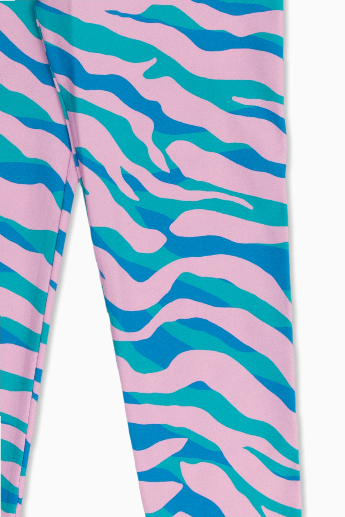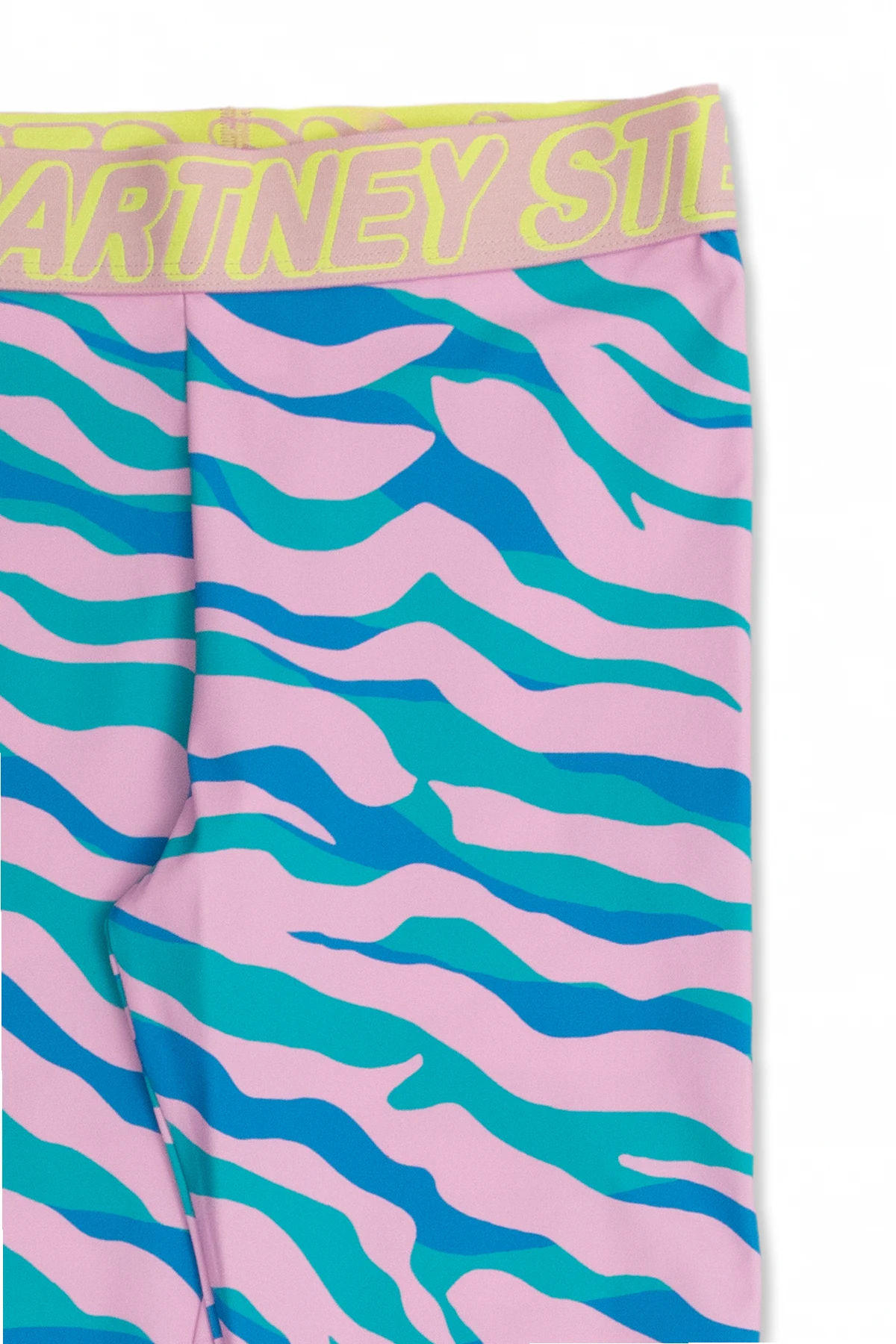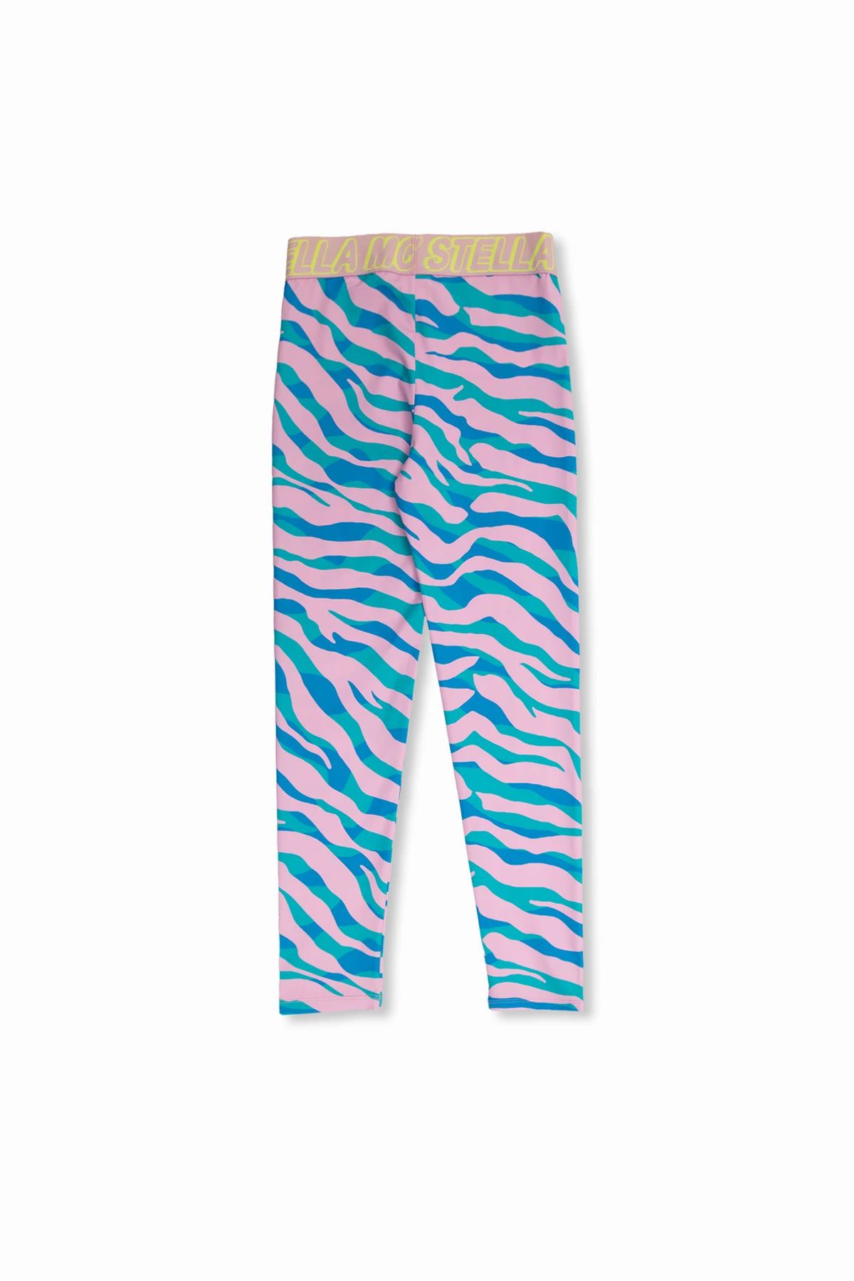 Różowo-niebiesko-zielone legginsy plażowe Stella McCartney Kids. Wykonane z materiału z recyklingu. W pasie wszyta guma z żółtym logo. Ozdobione wzorem. Długie nogawki.