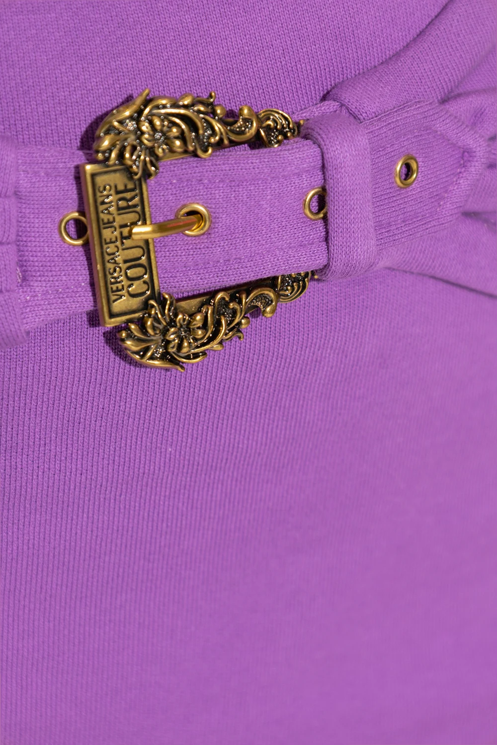 Fioletowa, krótka spódnica Versace Jeans Couture. Wykonana z elastycznego, bawełnianego dżerseju. W talii wszyty ściągacz. Z przodu dekoracyjny, marszczony pas zapinany na charakterystyczną dla marki metalową klamrę barokową w kolorze postarzanego złota.