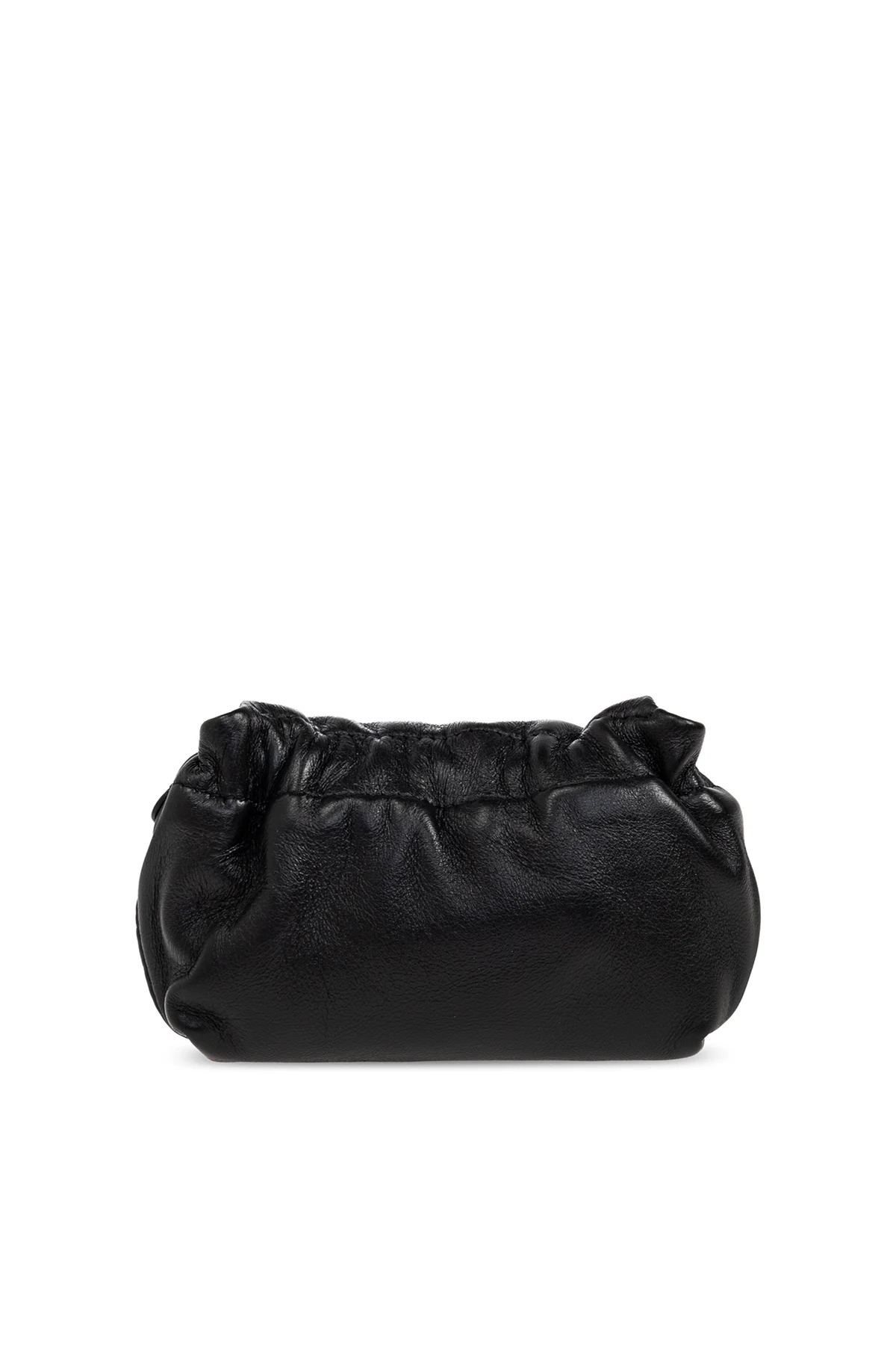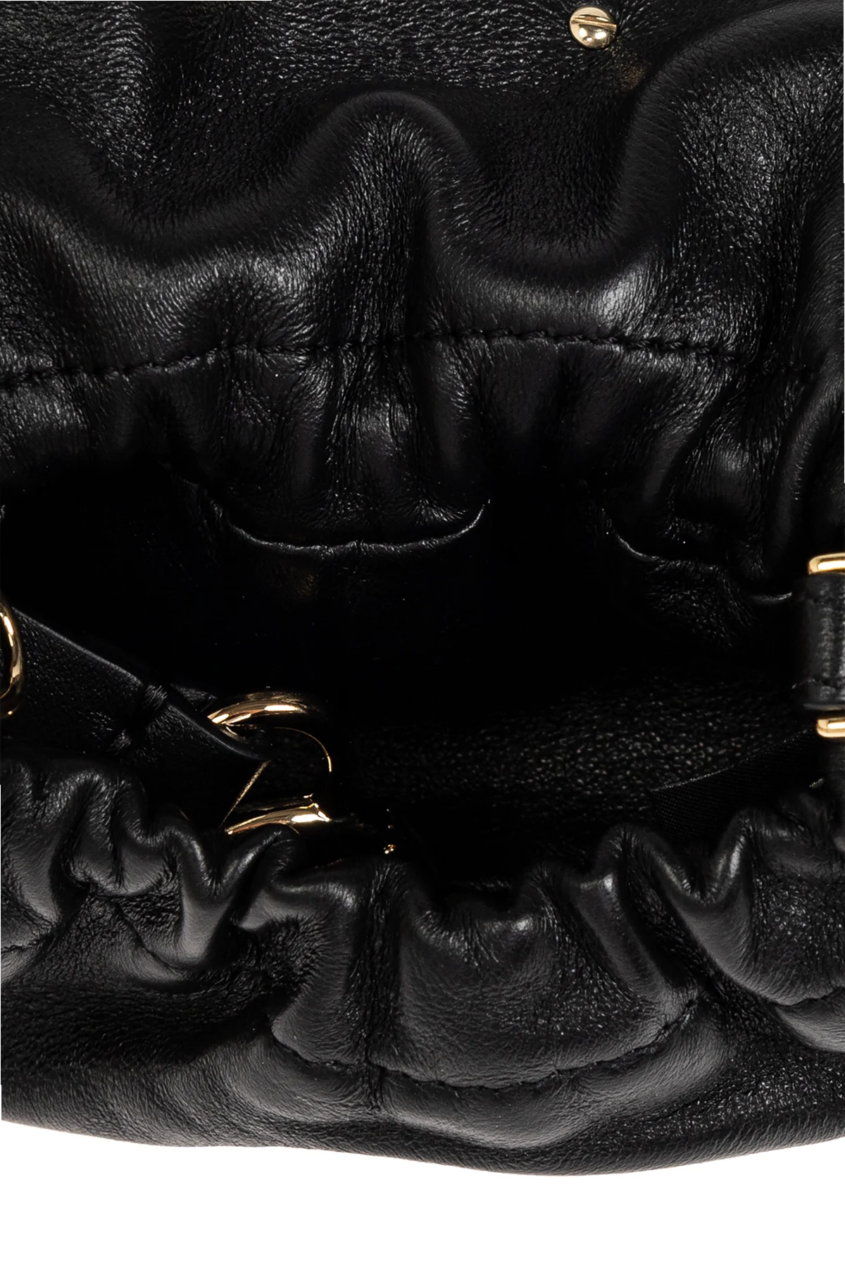 Wykonana z najwyższej jakości skóry jagnięcej, torba zachwyca swoim zaokrąglonym, miękkim kształtem, uzupełnionym subtelnymi marszczeniami. Na przodzie znajduje się duże, złote logo w kształcie prostokąta, które przyciąga wzrok i stanowi centralny element dekoracyjny.