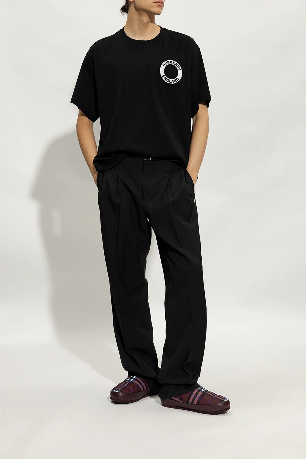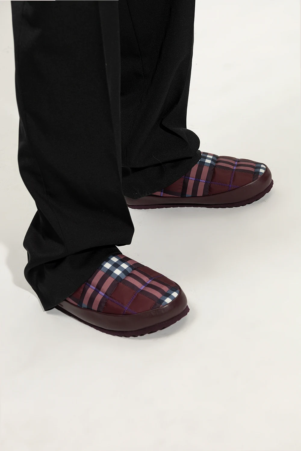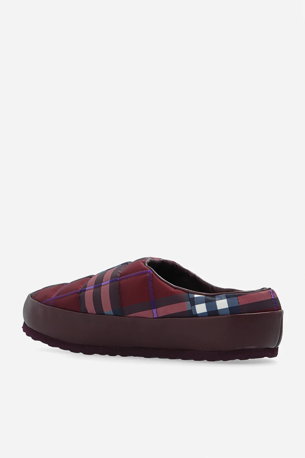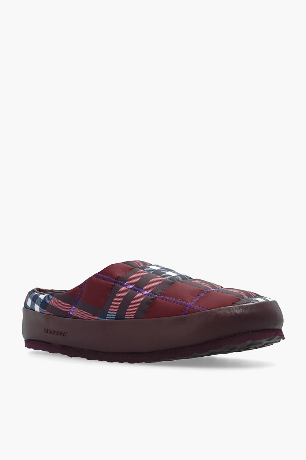 Bordowe, pikowane klapki, model ‘Northaven’ Burberry. Wykonane z materiału. Wykończone skórą. Ozdobione kolorową, charakterystyczną kratą i wypukłym logo. Gumowa podeszwa.