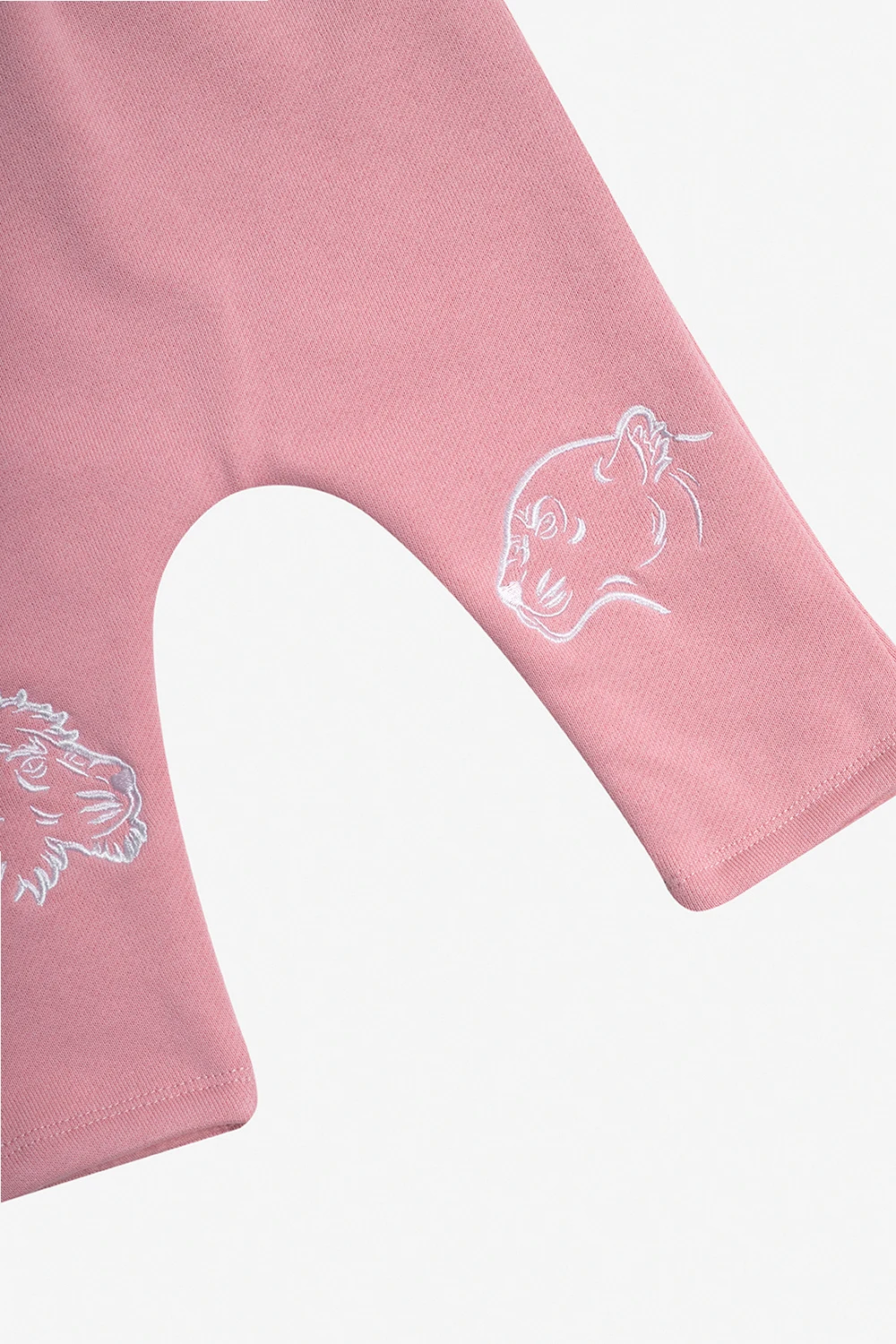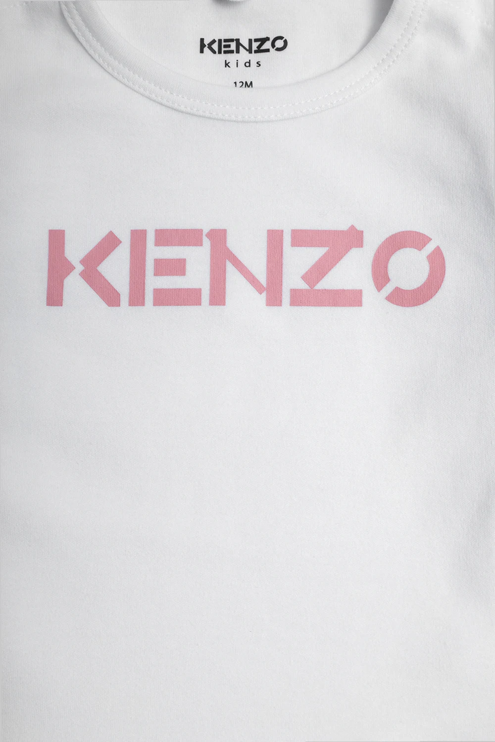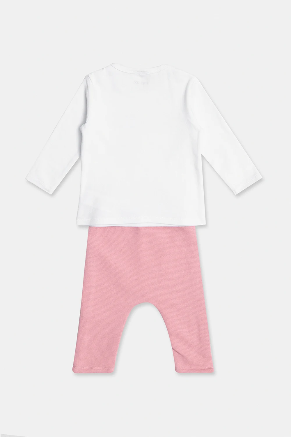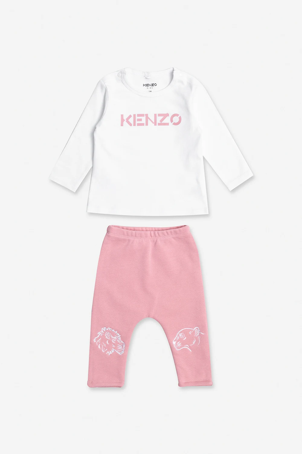 Bawełniany zestaw: t-shirt z długimi rękawami i spodnie Kenzo Kids. Biały t-shirt z długimi rękawami zapinany na ramionach na zatrzaski. Z przodu ozdobiony nadrukowanym różowym logo. Okrągły dekolt. Jasnoróżowe spodnie z gumą w pasie. Ozdobione wyszytym motywem lwa i tygrysa.