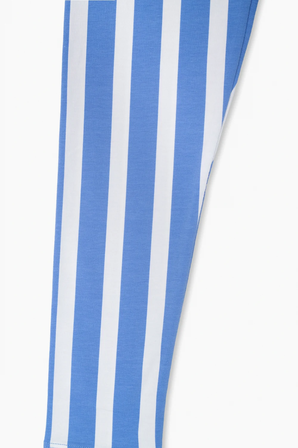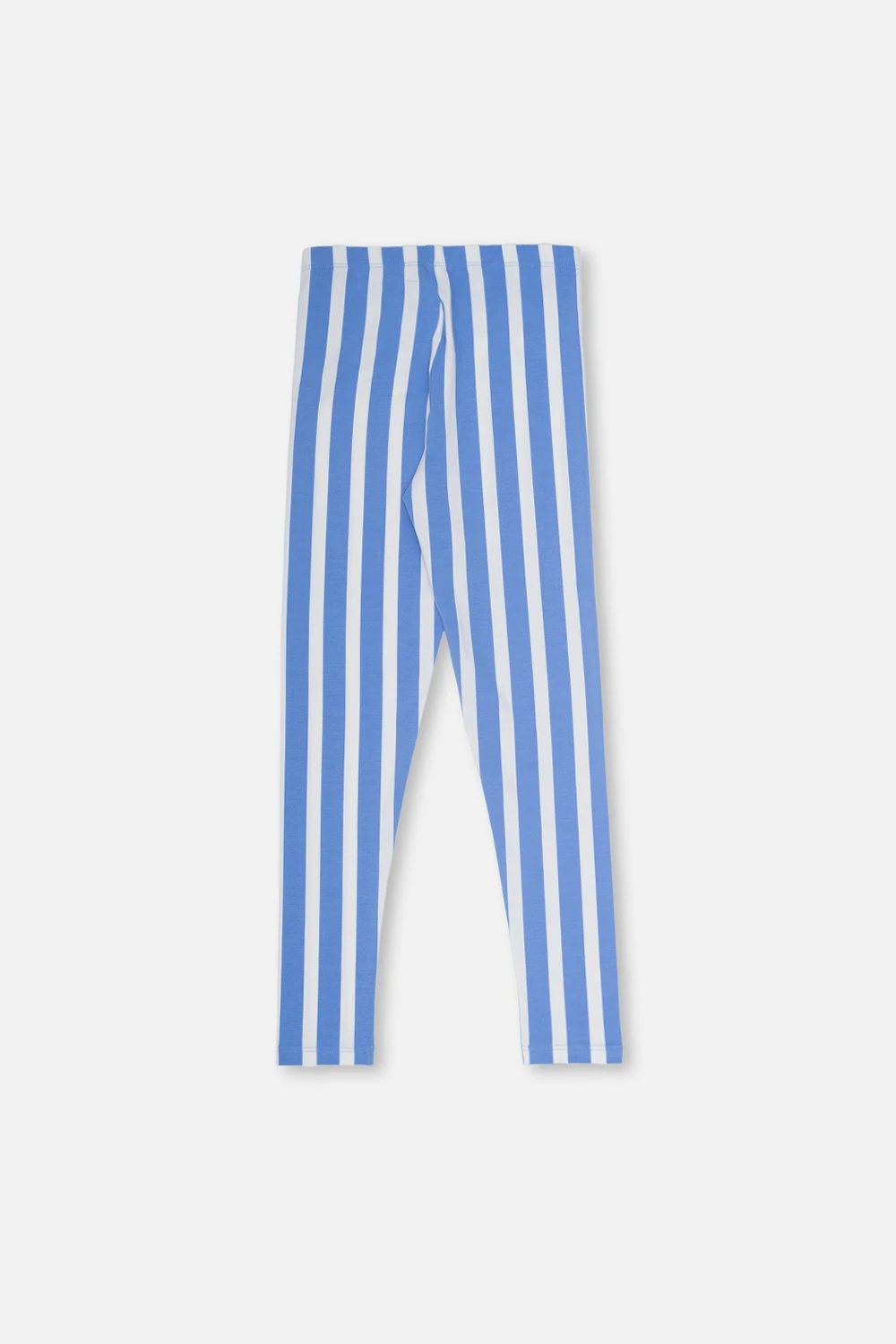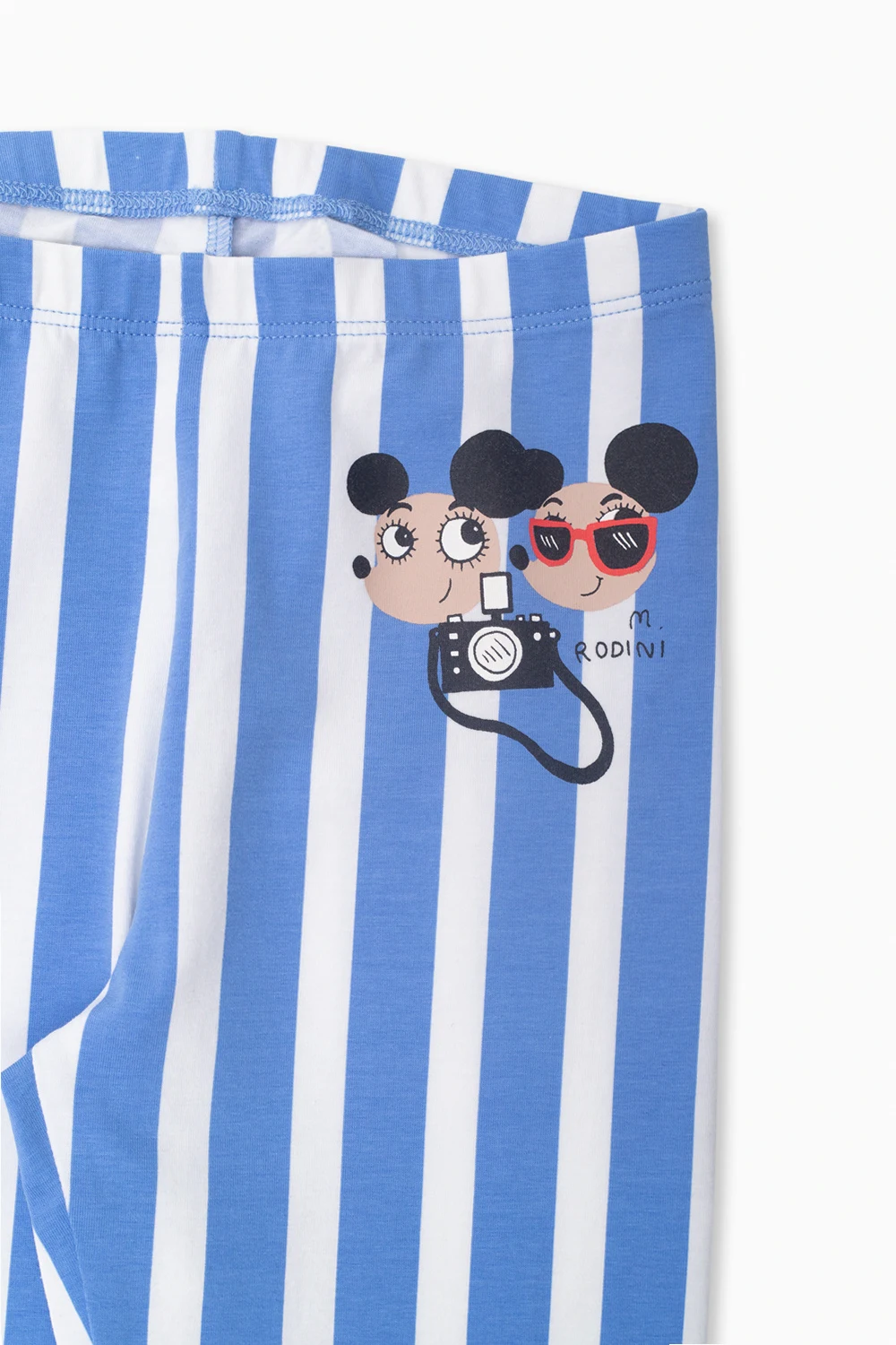 Niebiesko-białe legginsy Mini Rodini. Wykonane z bawełny organicznej. W pasie wszyta guma. Ozdobione wzorem w paski. Z przodu ozdobione kolorowym nadrukiem ‘Ritzratz’. Długie nogawki.