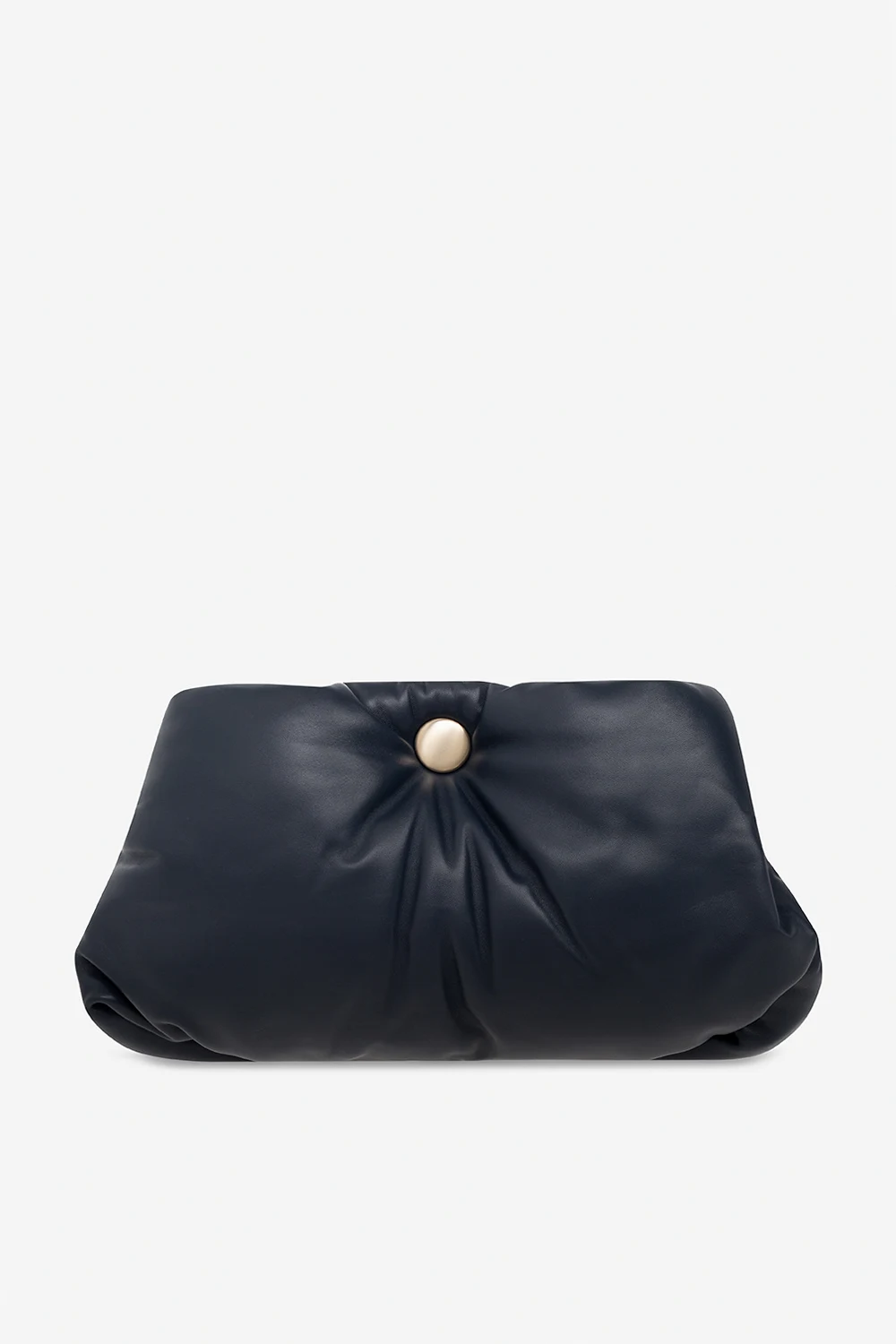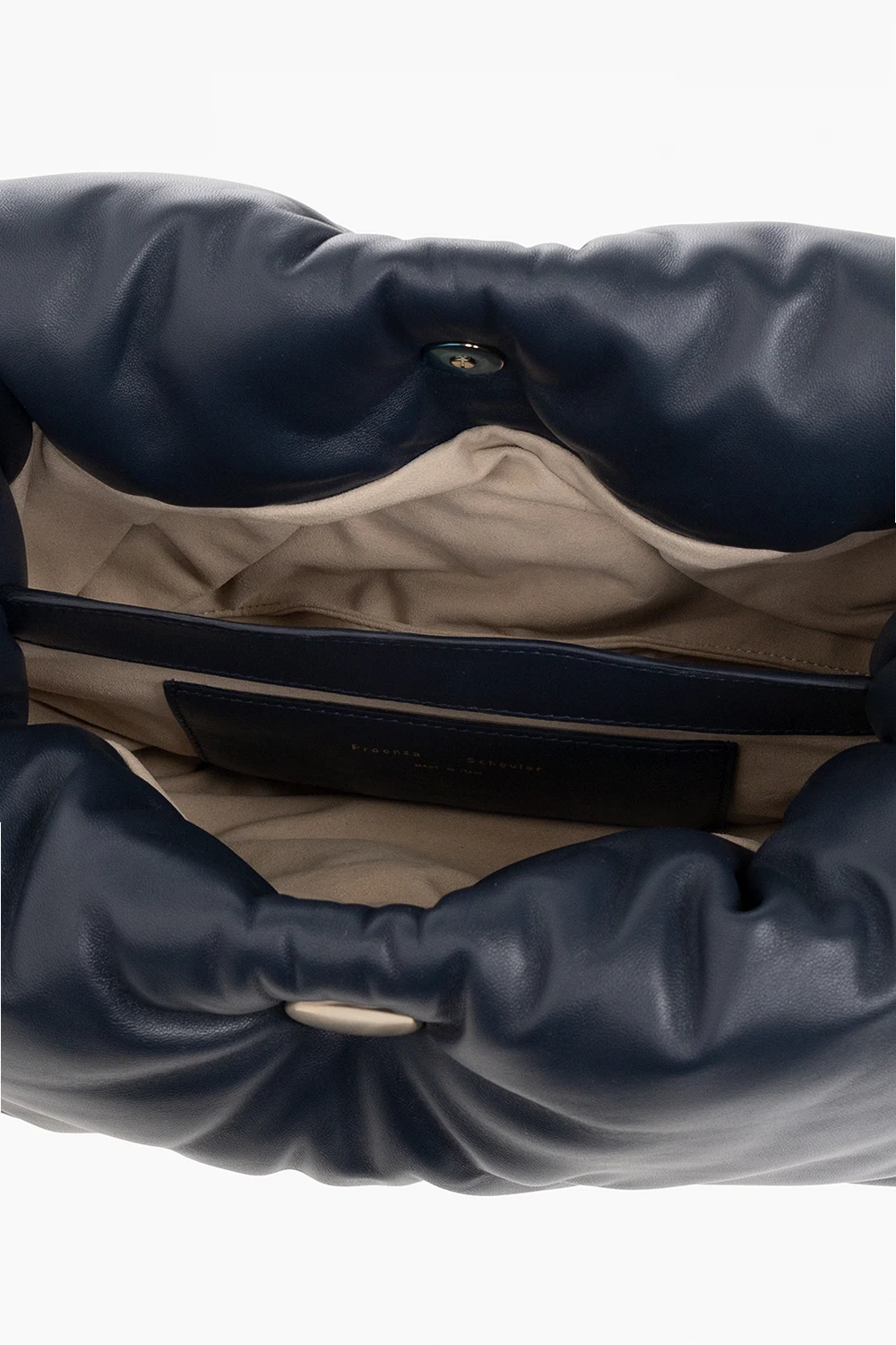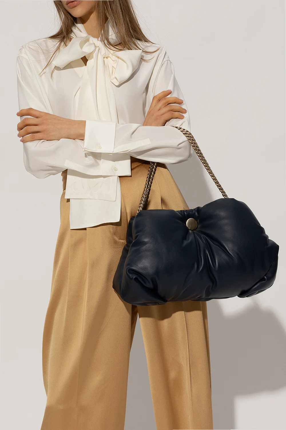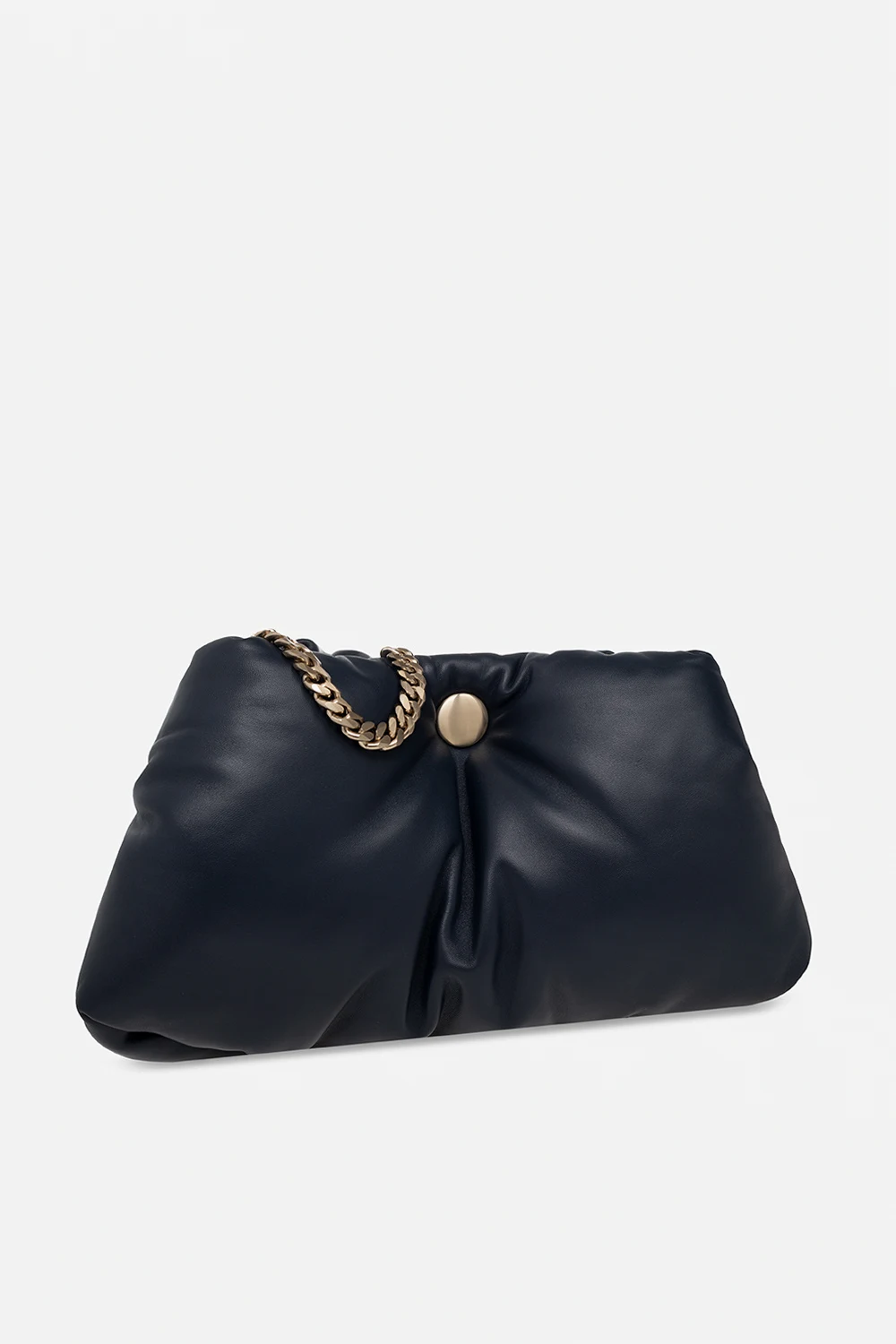 Granatowa, pikowana torba na ramię Proenza Schouler. Wykonana ze skóry jagnięcej. Zamknięcie na magnetyczny zatrzask. Łańcuch na ramię. Wewnątrz dwie oddzielne komory i miejsce na kartę. Metalowe wykończenie w kolorze jasnego złota.