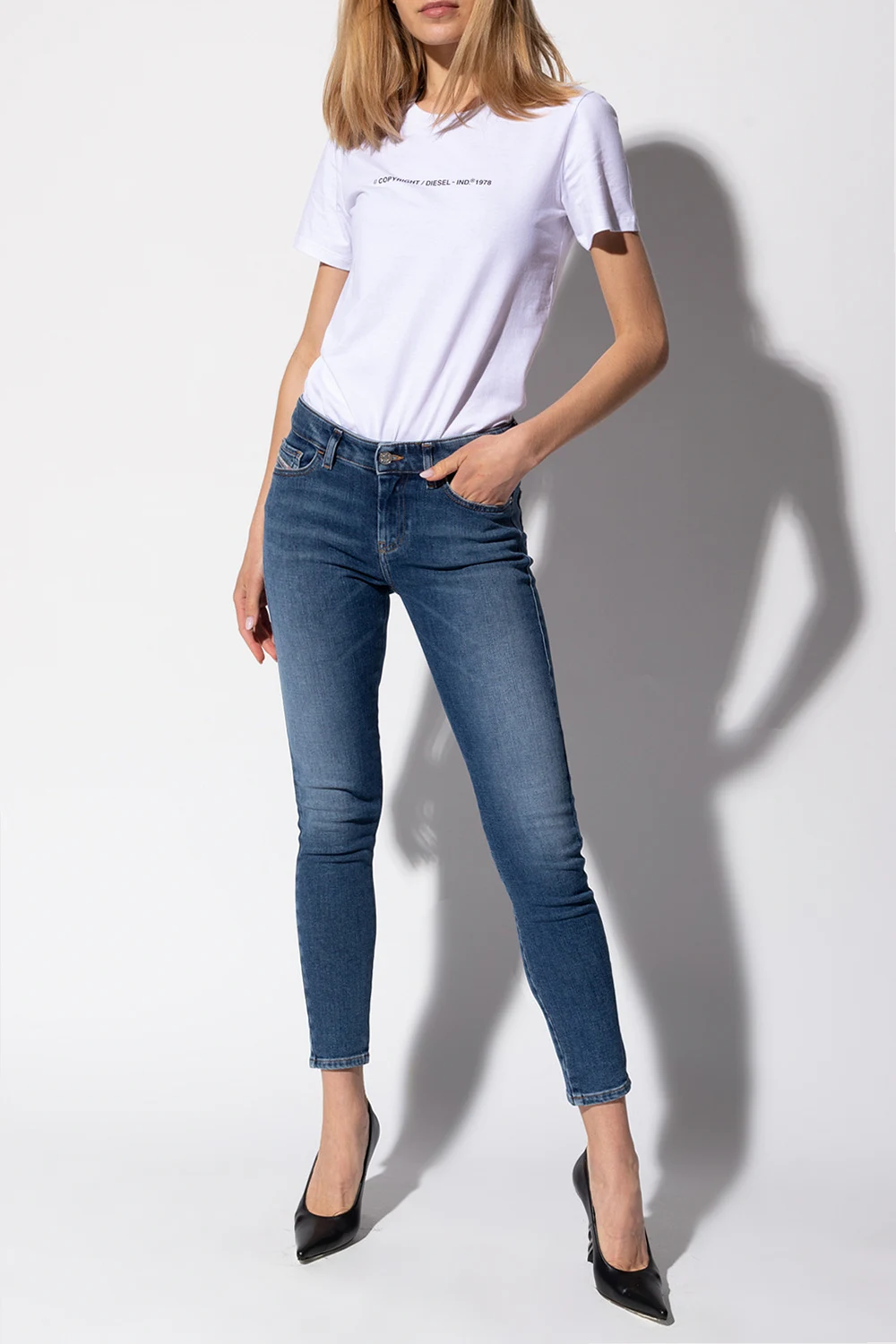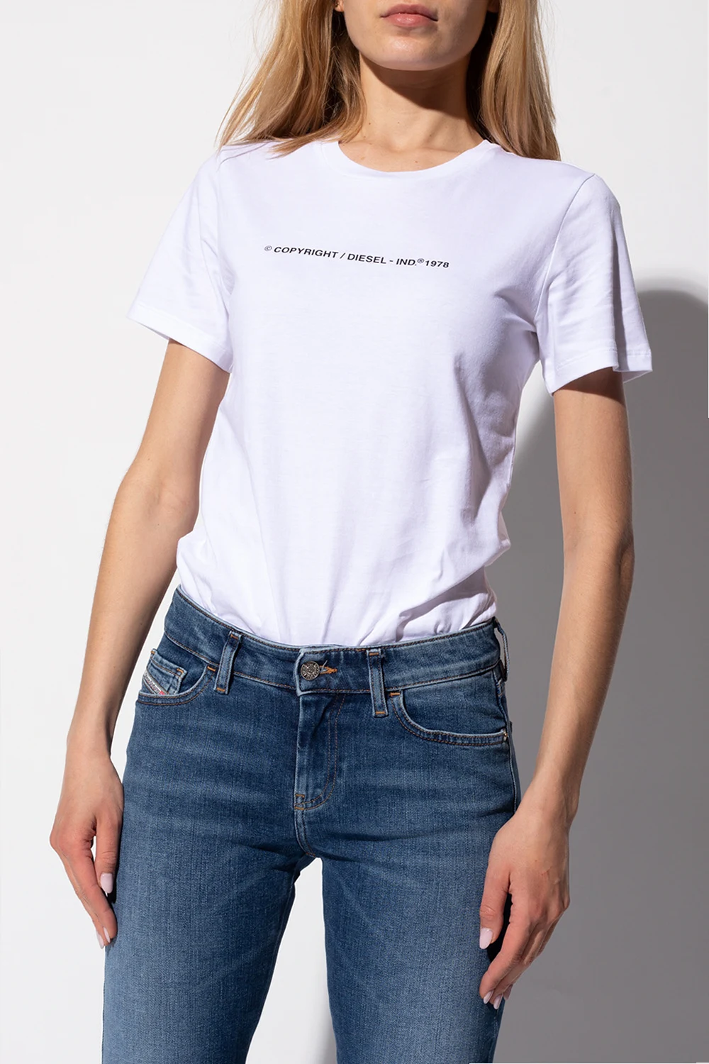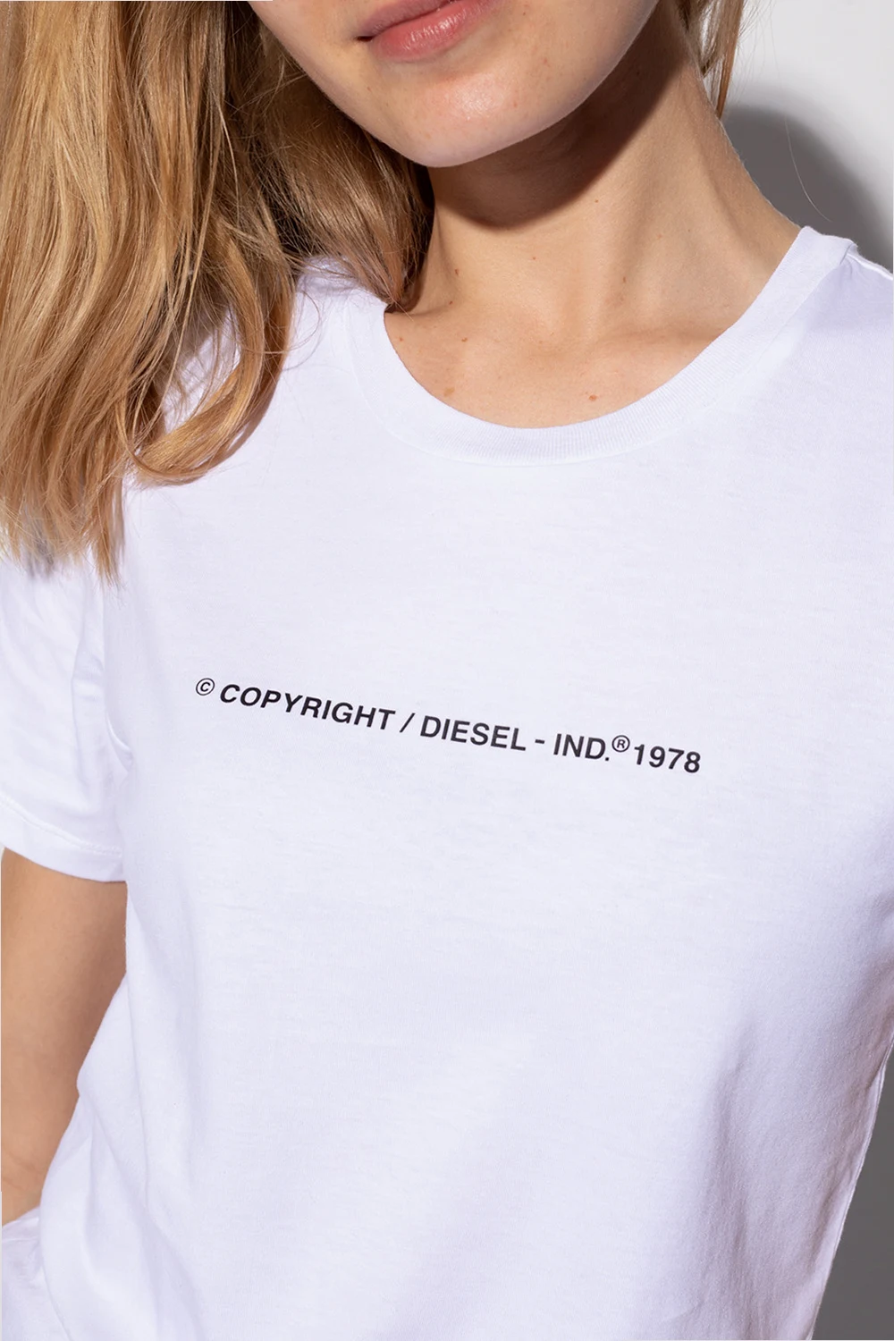 Białe body z krótkimi rękawami Diesel. Wykonane z bawełny. Zapinane na zatrzaski. Ozdobione czarnym nadrukiem z logo. Okrągły dekolt.
