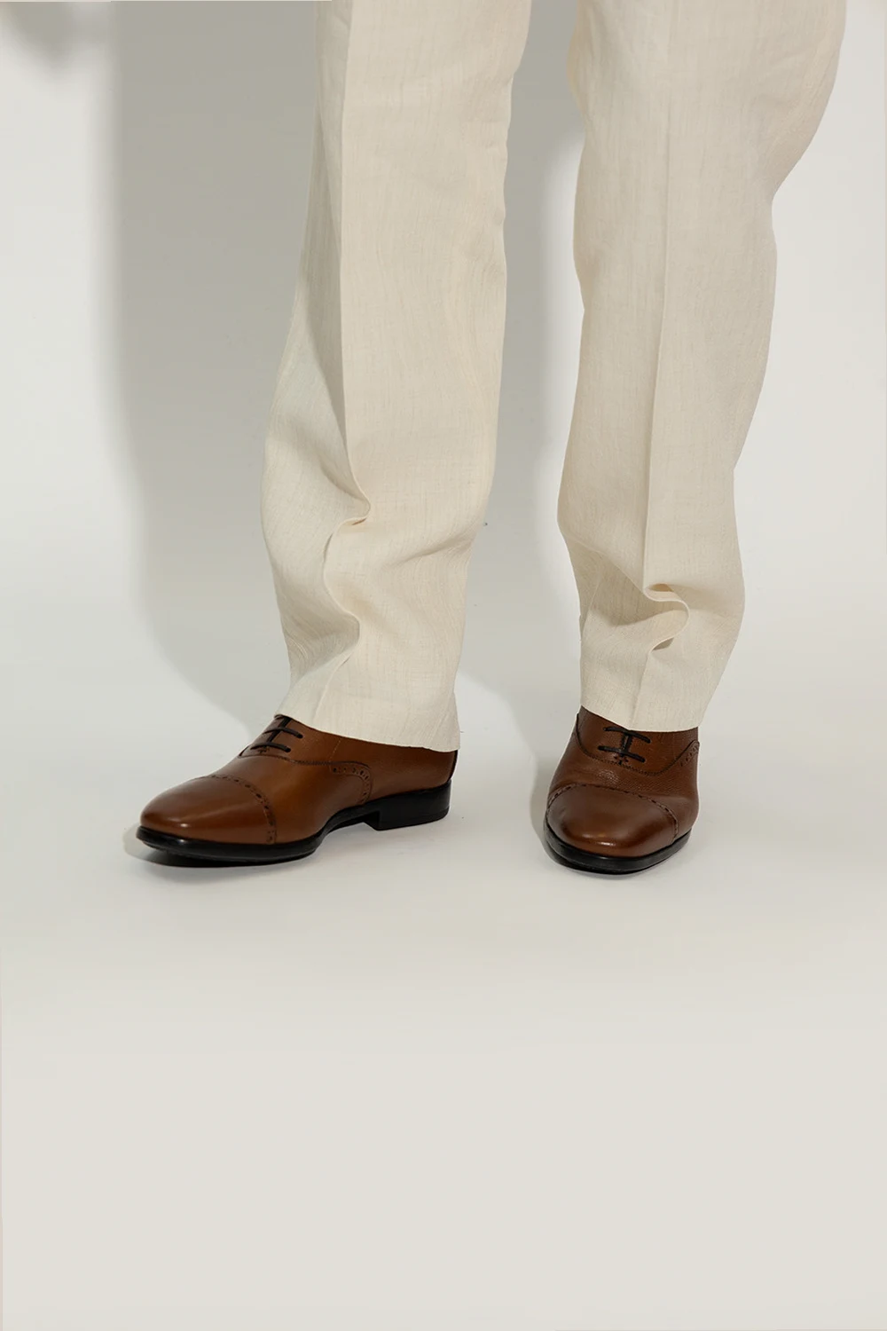 Brązowe, sznurowane buty, model ‘Riley’ FERRAGAMO. Wykonane ze skóry. Ozdobione wytłoczonym logo. Czarna, gumowa podeszwa.