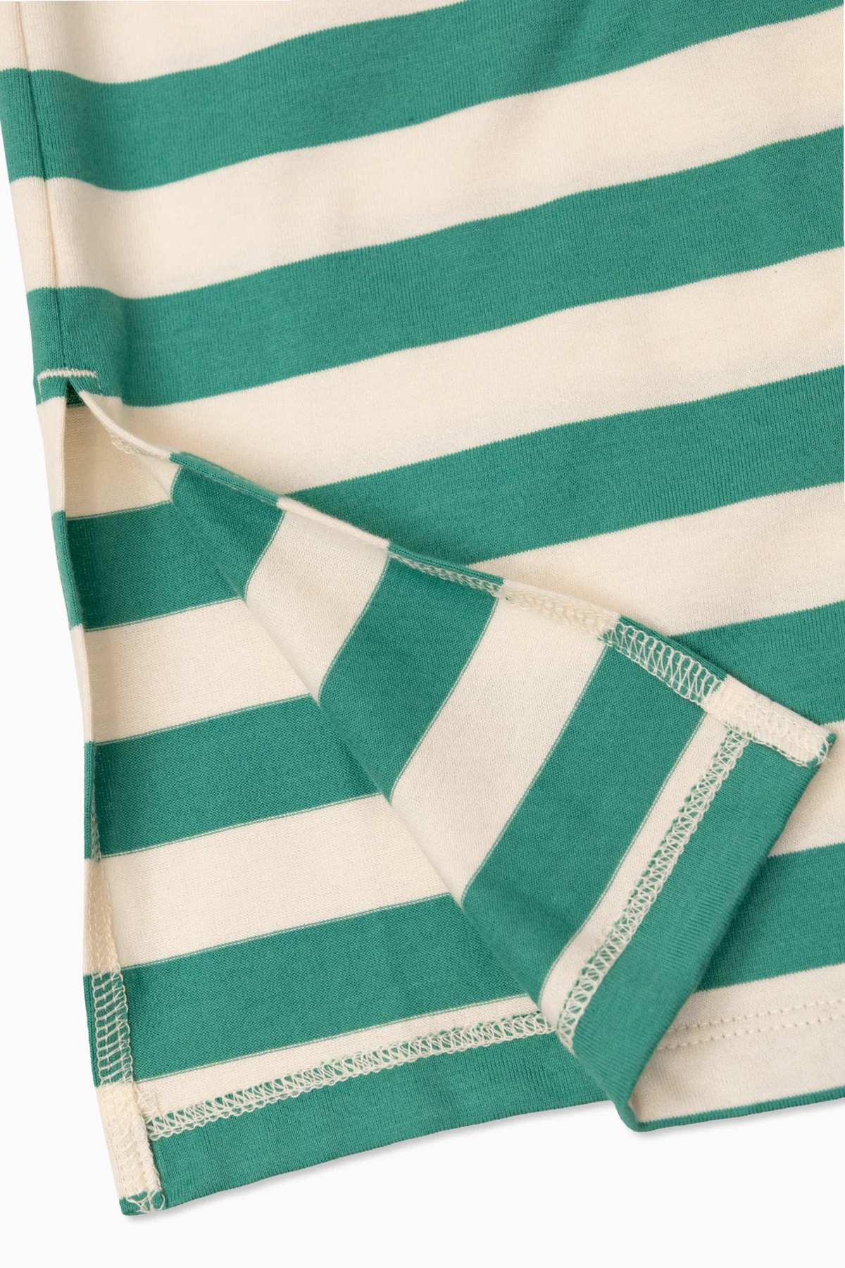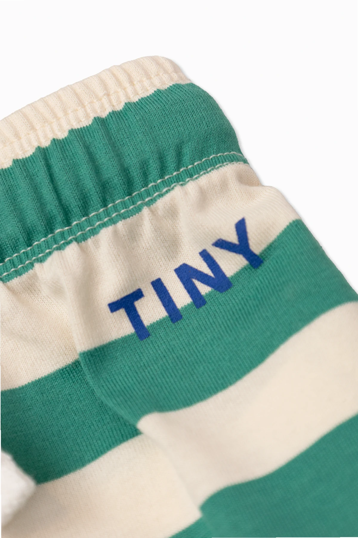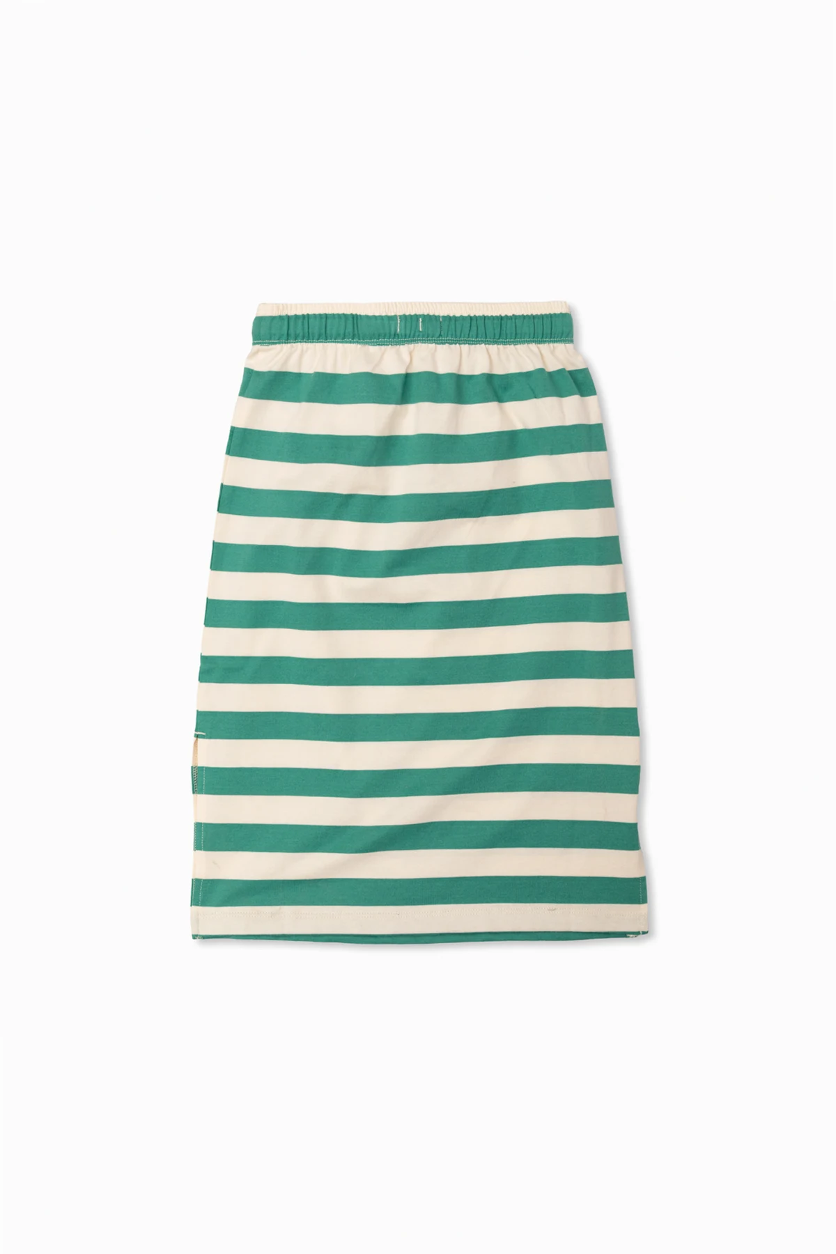 Charakterystyczny wzór w poziome zielono-kremowe paski nadaje spódnicy unikalnego uroku, a detale takie jak napis "TINY" w niebieskim kolorze oraz małe rozcięcia po bokach podkreślają jej wyjątkowość. Starannie wykonane obszycia świadczą o wysokiej jakości tego produktu, będącego kwintesencją rzemiosła Tiny Cottons.