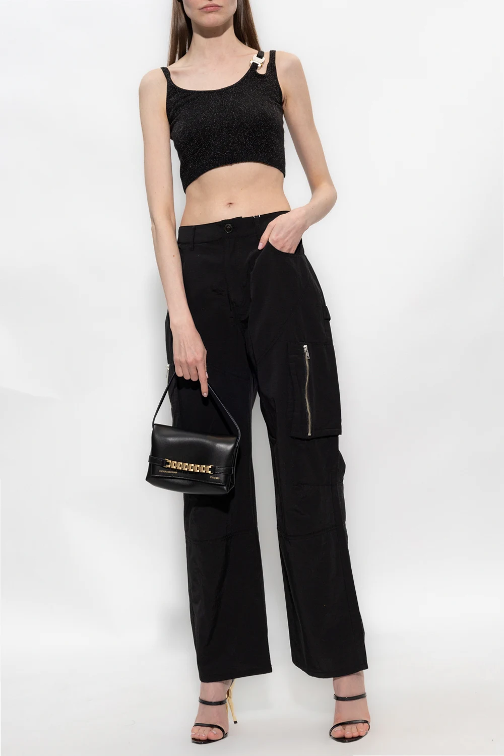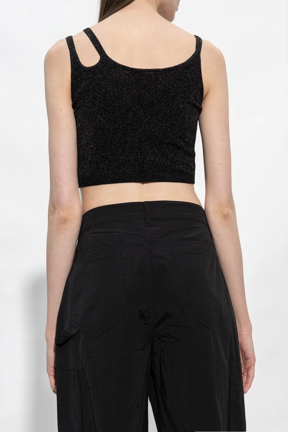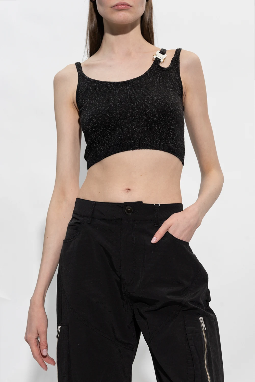 Czarny, krótki top na ramiączkach 1017 ALYX 9SM. Wykonany z połyskującego materiału. Jedno ramiączko ozdobione charakterystyczną klamrą w kolorze srebrno-złotym.