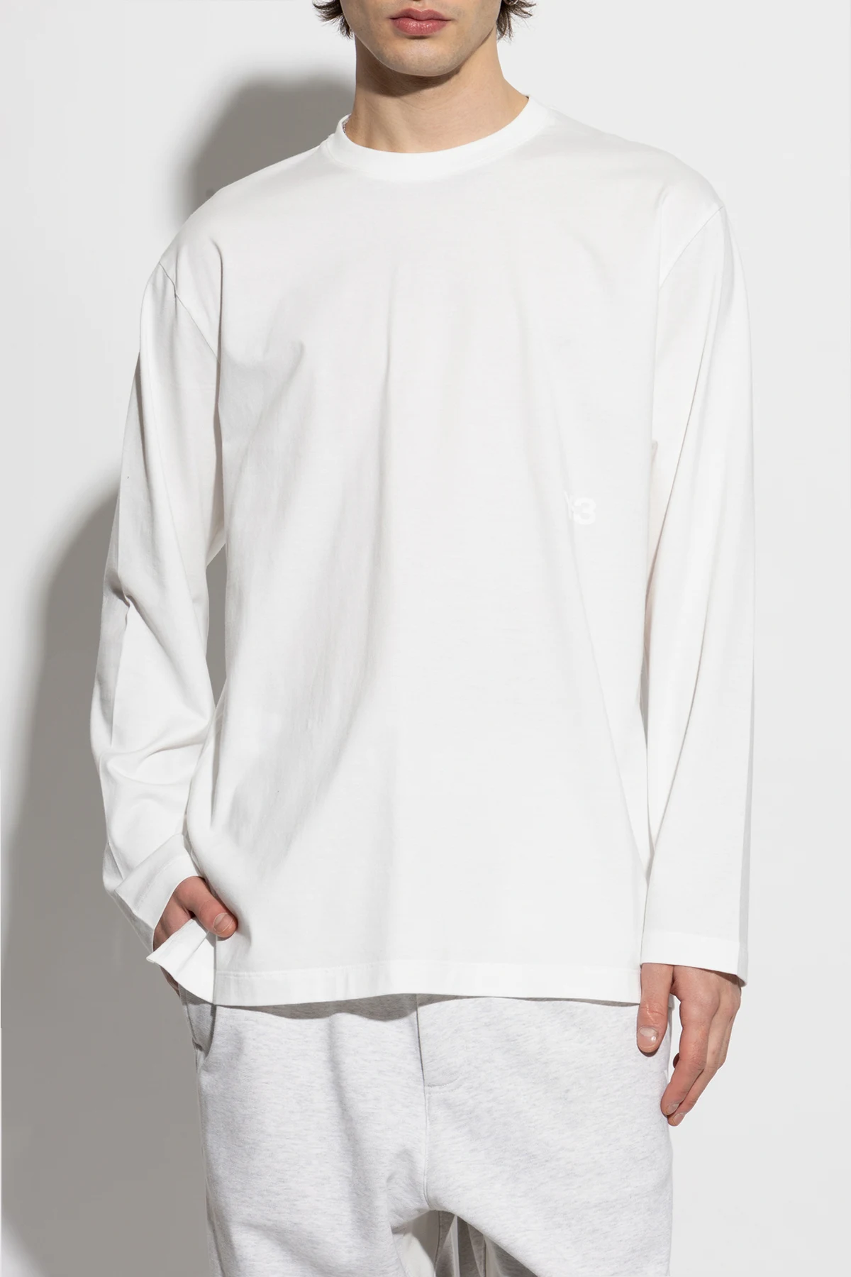 Prosty, klasyczny krój z długimi rękawami i okrągłym dekoltem harmonijnie współgra z dominującym białym kolorem, tworząc minimalistyczną, a zarazem wyrafinowaną sylwetkę. Delikatne, tonalne logo "Y-3" usytuowane po lewej stronie przodu dodaje subtelnego, lecz wymownego akcentu.