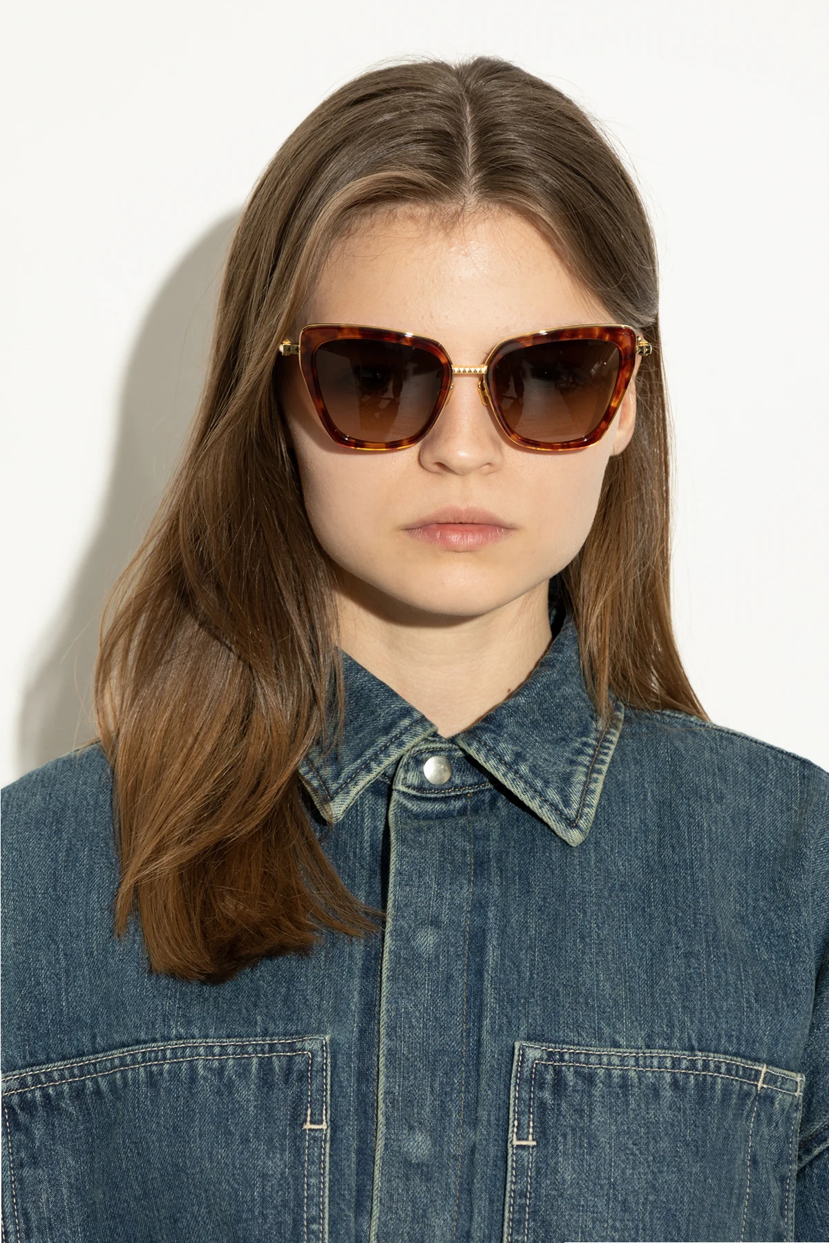 Wykonane z najwyższej jakości acetatu i metalu , okulary te zapewniają trwałość i komfort noszenia. Metalowe zauszniki ozdobione subtelnymi złotymi detalami, dopełniają luksusowego charakteru, a lekko przyciemniane brązowe szkła chronią przed szkodliwym promieniowaniem UV.