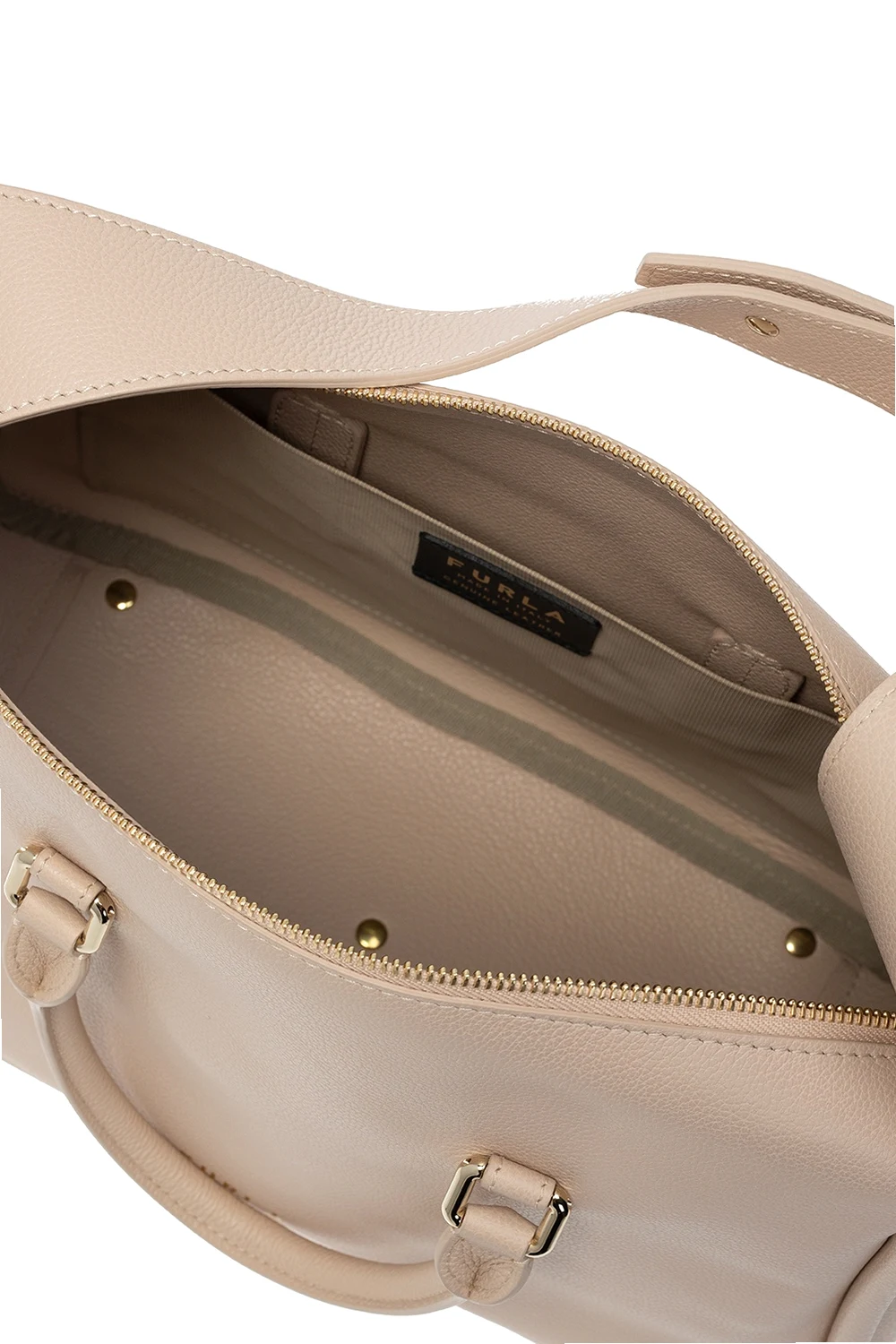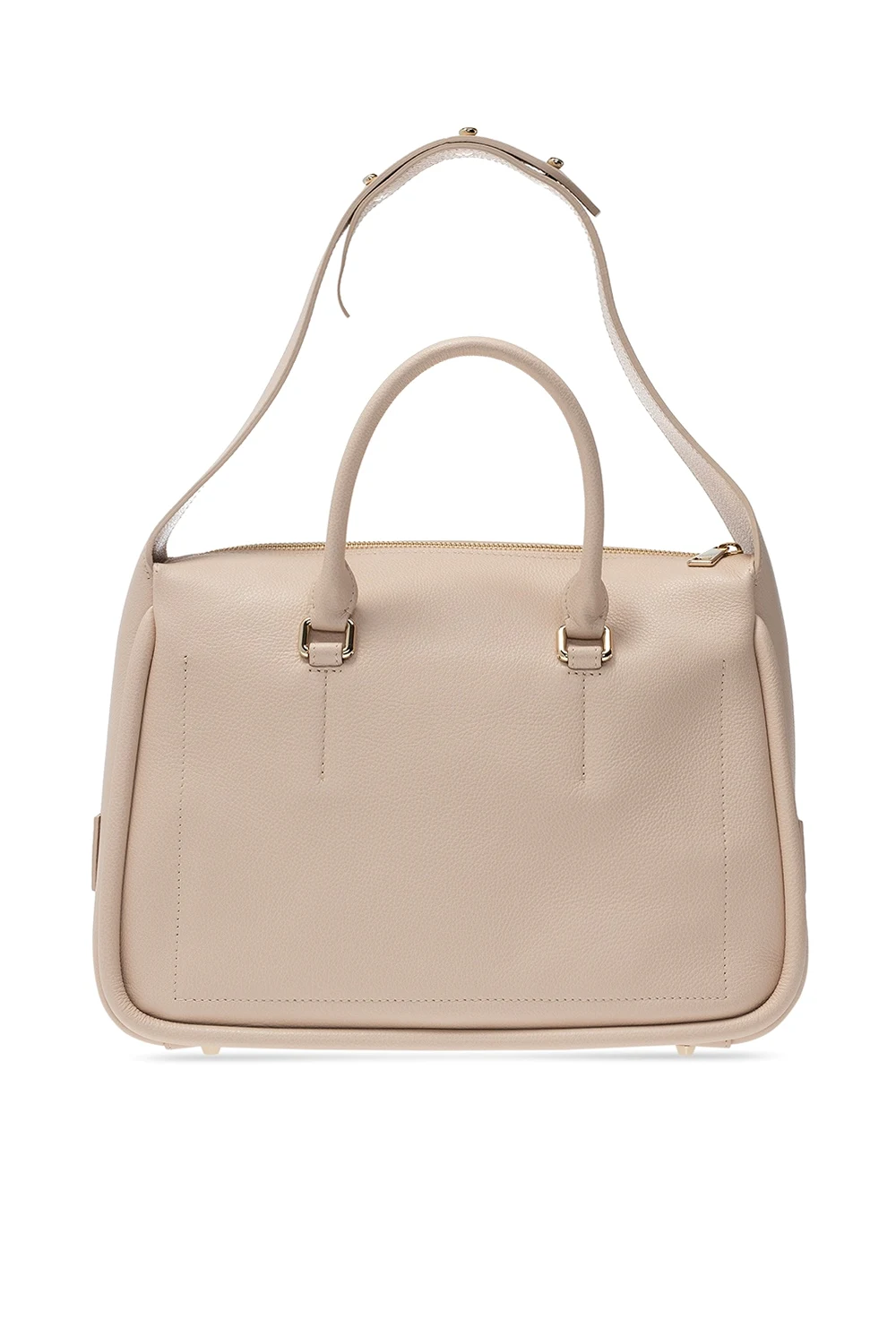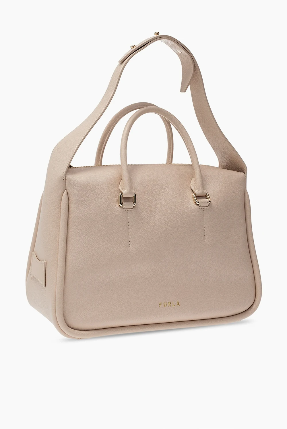 Jasnoróżowa torba na ramię, model ‘Ester’ Furla. Wykonana ze skóry o specjalnej fakturze. Zamykana na zamek. Ozdobiona nadrukowanym logo w kolorze złotym. Pasek na ramię. Dwie półokrągłe rączki. Wewnątrz komora z wsuwaną kieszenią. Metalowe wykończenie w kolorze złotym.