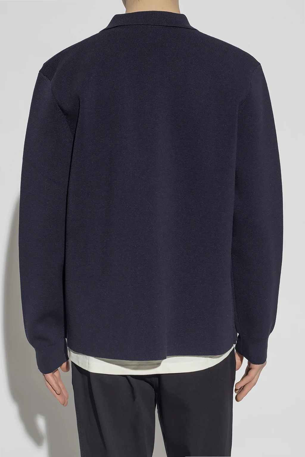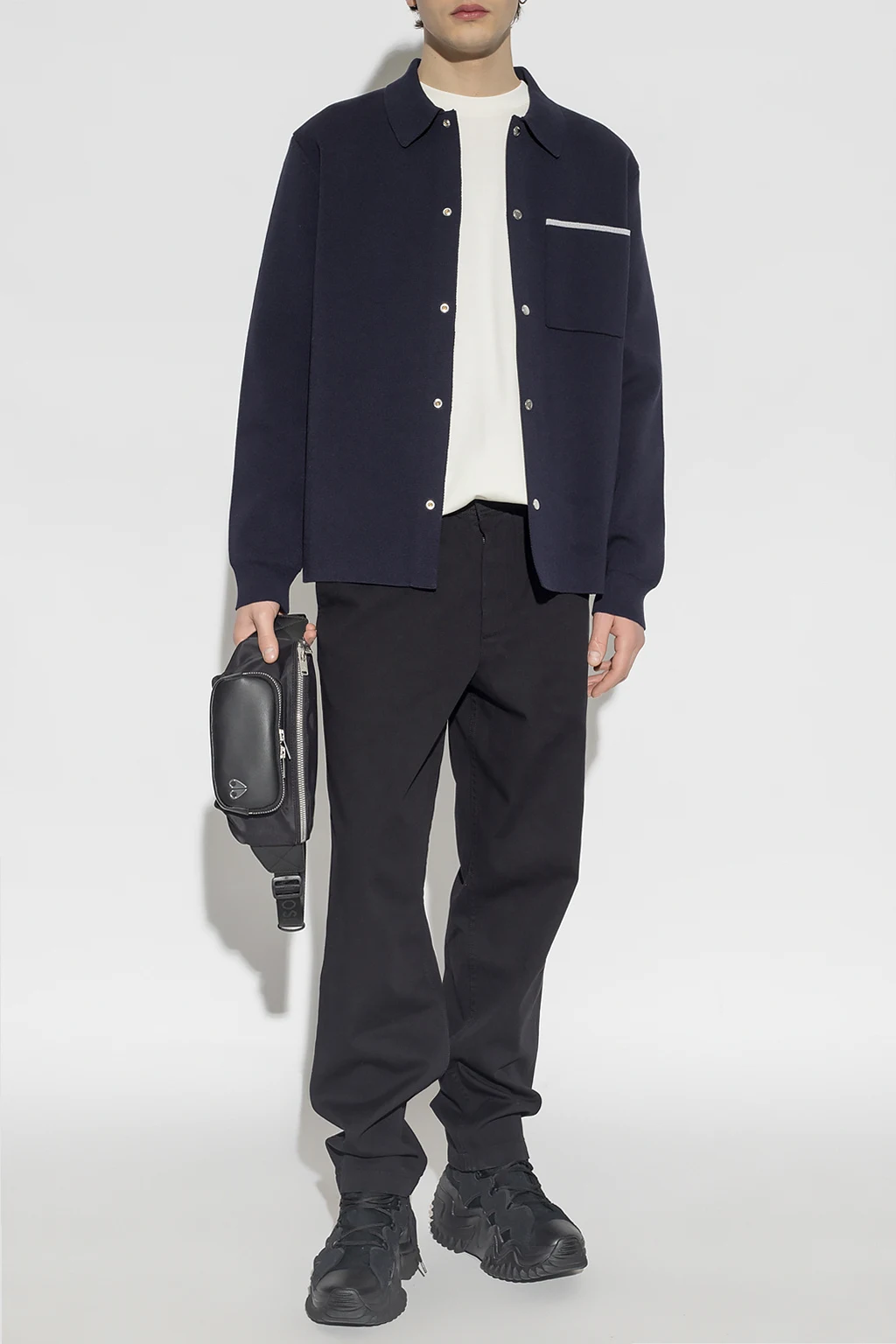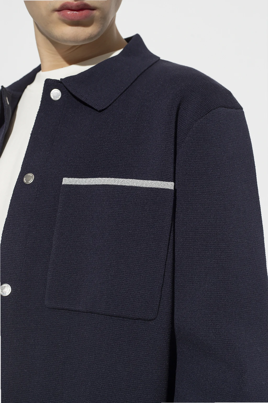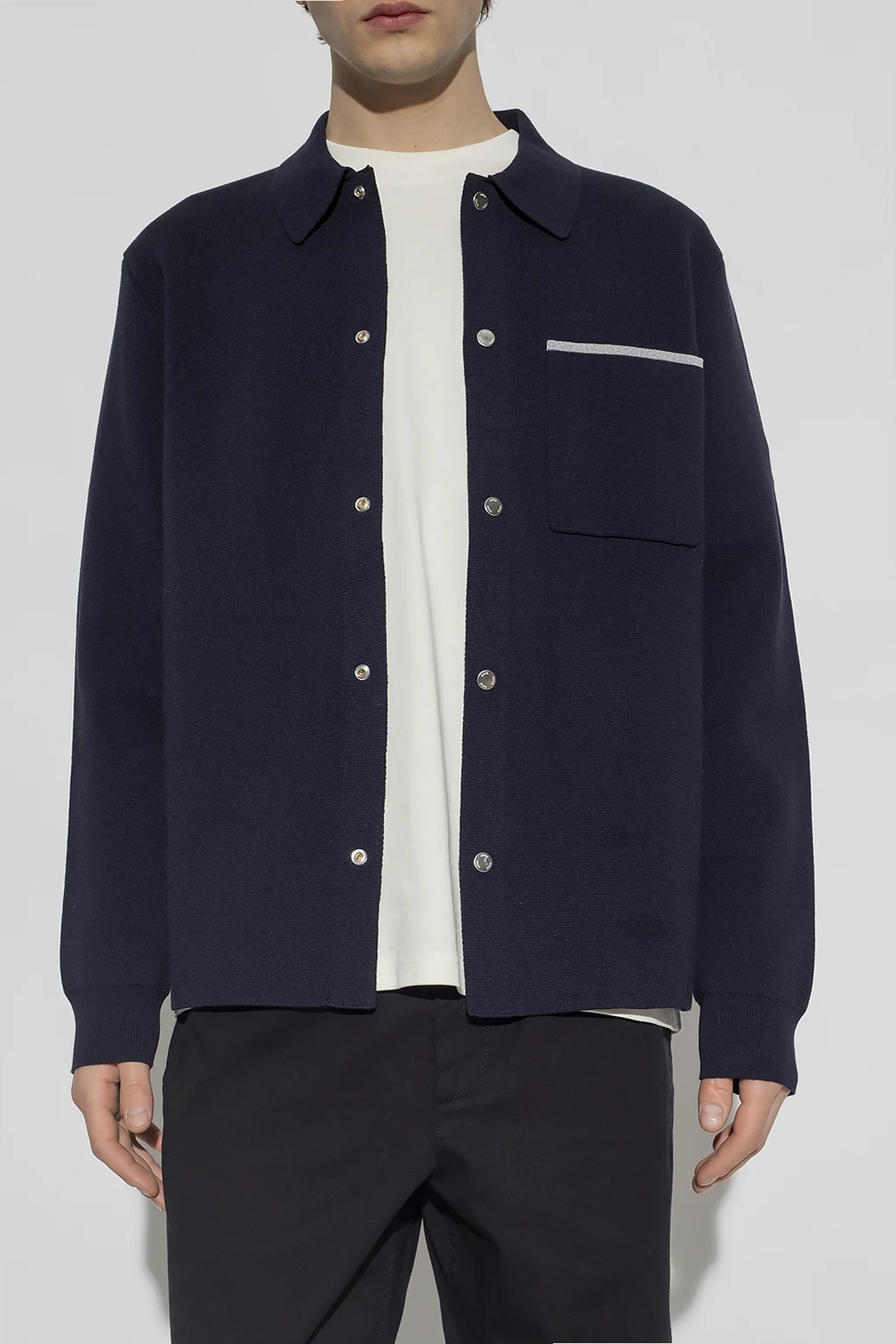 Granatowa koszula, model ‘Eric Milano’ Norse Projects. Wykonana z mieszanki bawełny. Zapinana na zatrzaski. Z przodu wsuwana kieszeń z szarym wykończeniem. Długie rękawy zakończone ściągaczem.