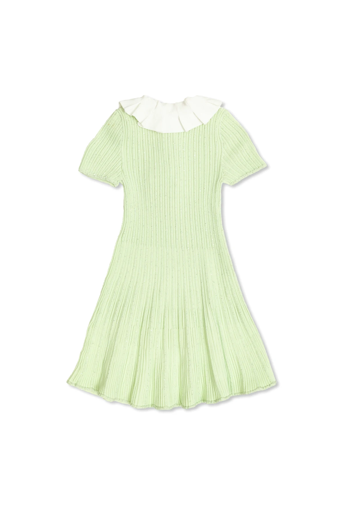 Sukienka charakteryzuje się klasycznym, dziewczęcym krojem z rozszerzanym dołem, co nadaje jej niepowtarzalnego uroku. Krótkie rękawy oraz prążkowany materiał wzbogacają jej teksturę i subtelny wygląd. Wyróżnia się także delikatnym białym kołnierzykiem ozdobionym elegancką kokardką, a dekoracyjne guziki w kształcie kwiatków z perłowym środkiem dodają jej wyjątkowości.