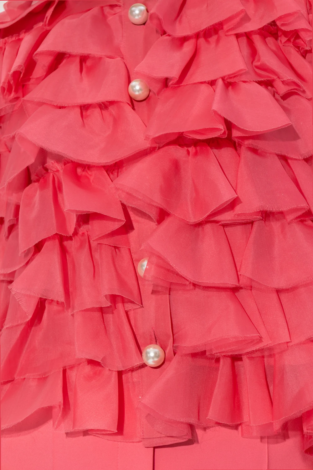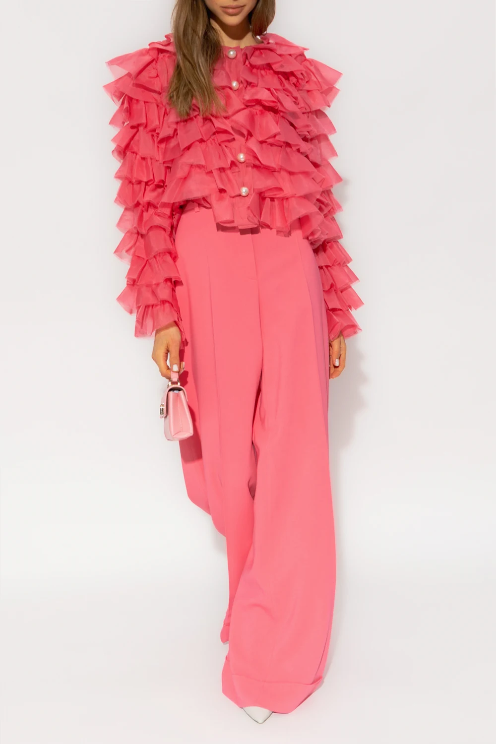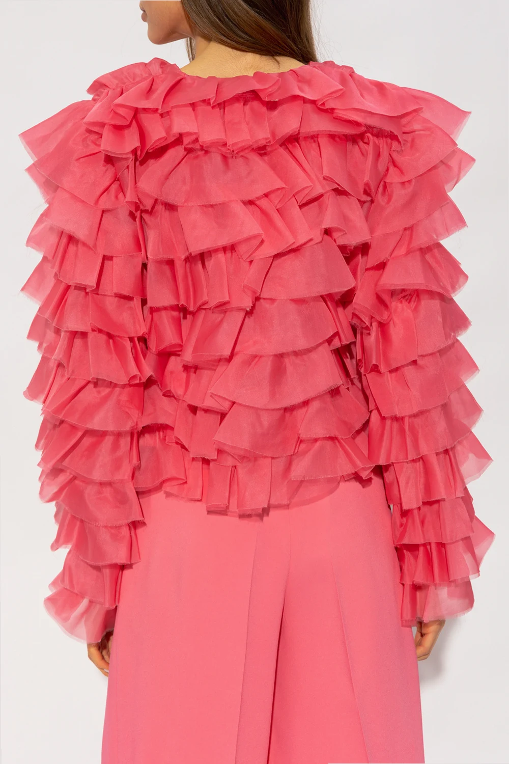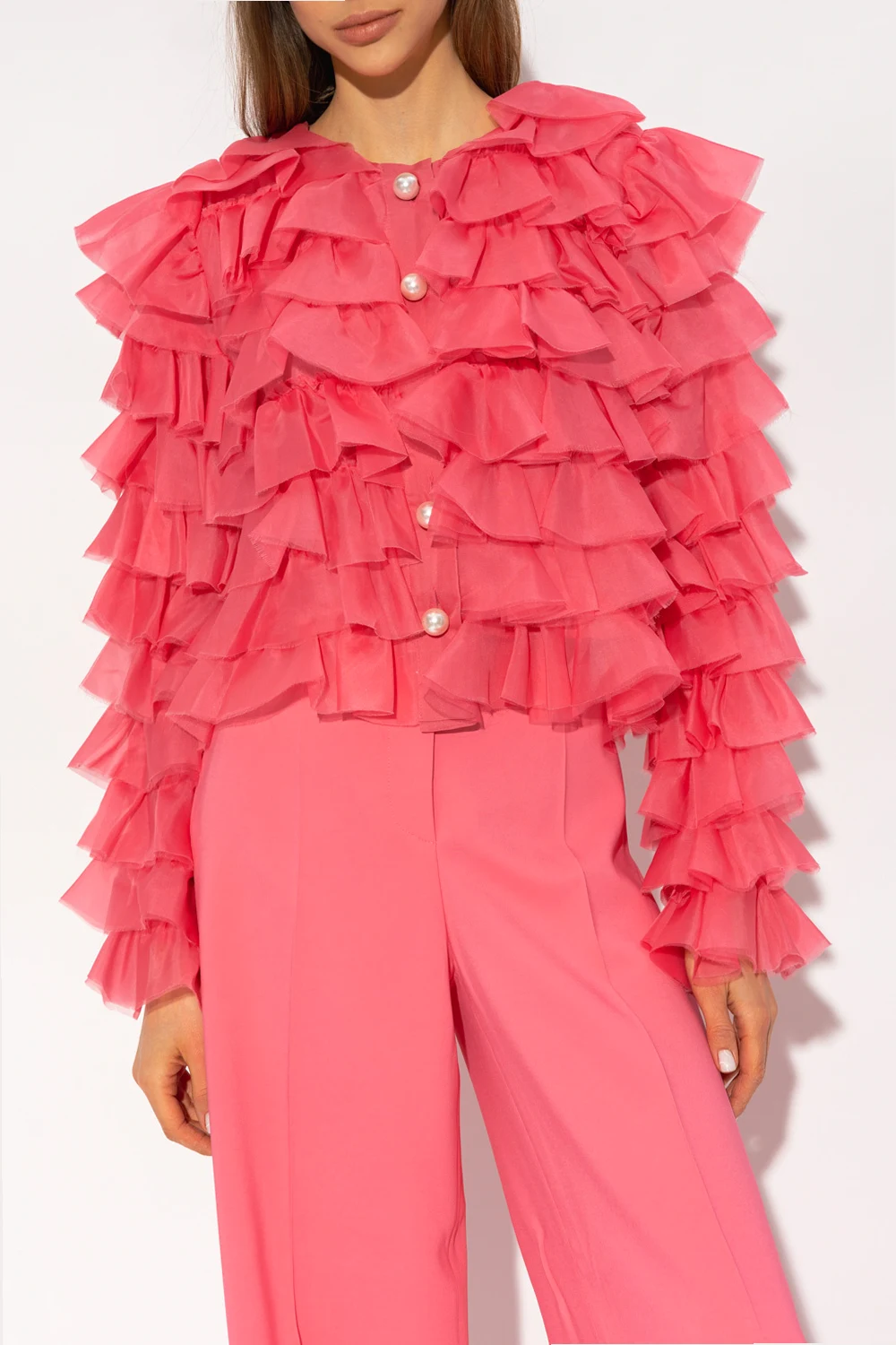 Różowy top z falbanami, model ‘Gro’ Custommade. Zapinany na perłowe guziki. Okrągły dekolt. Długie rękawy.