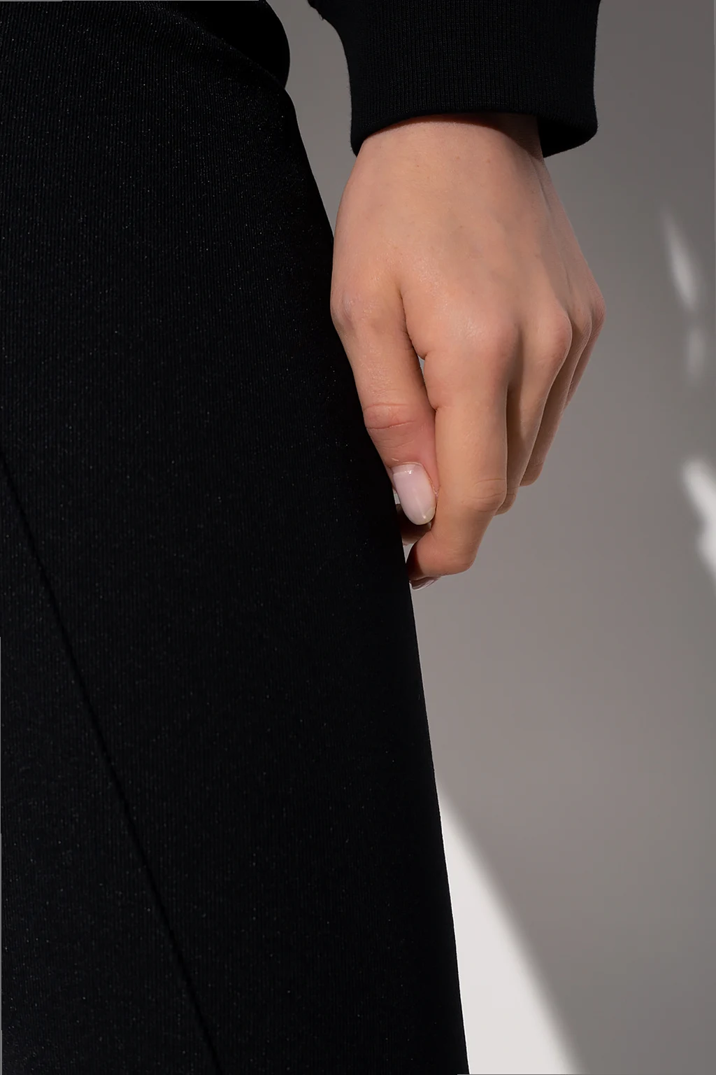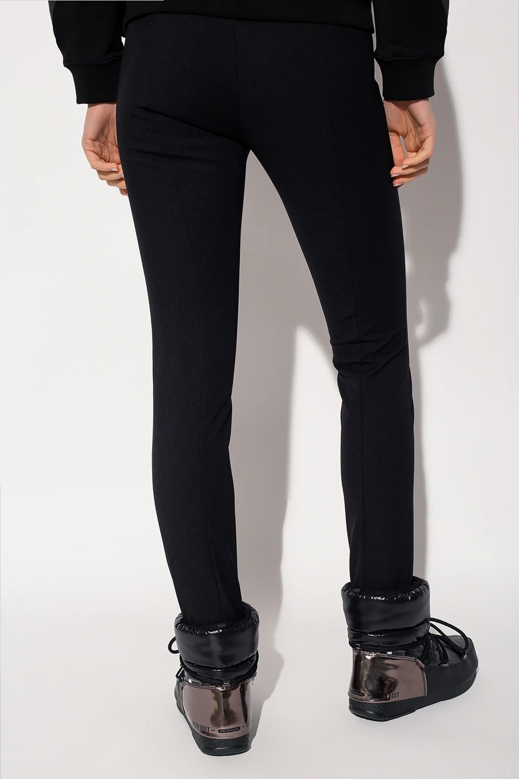 Czarne spodnie w kant Moncler. Zapinane na zamek, haftkę i zatrzask. Długie, zwężane nogawki z wycięciami.