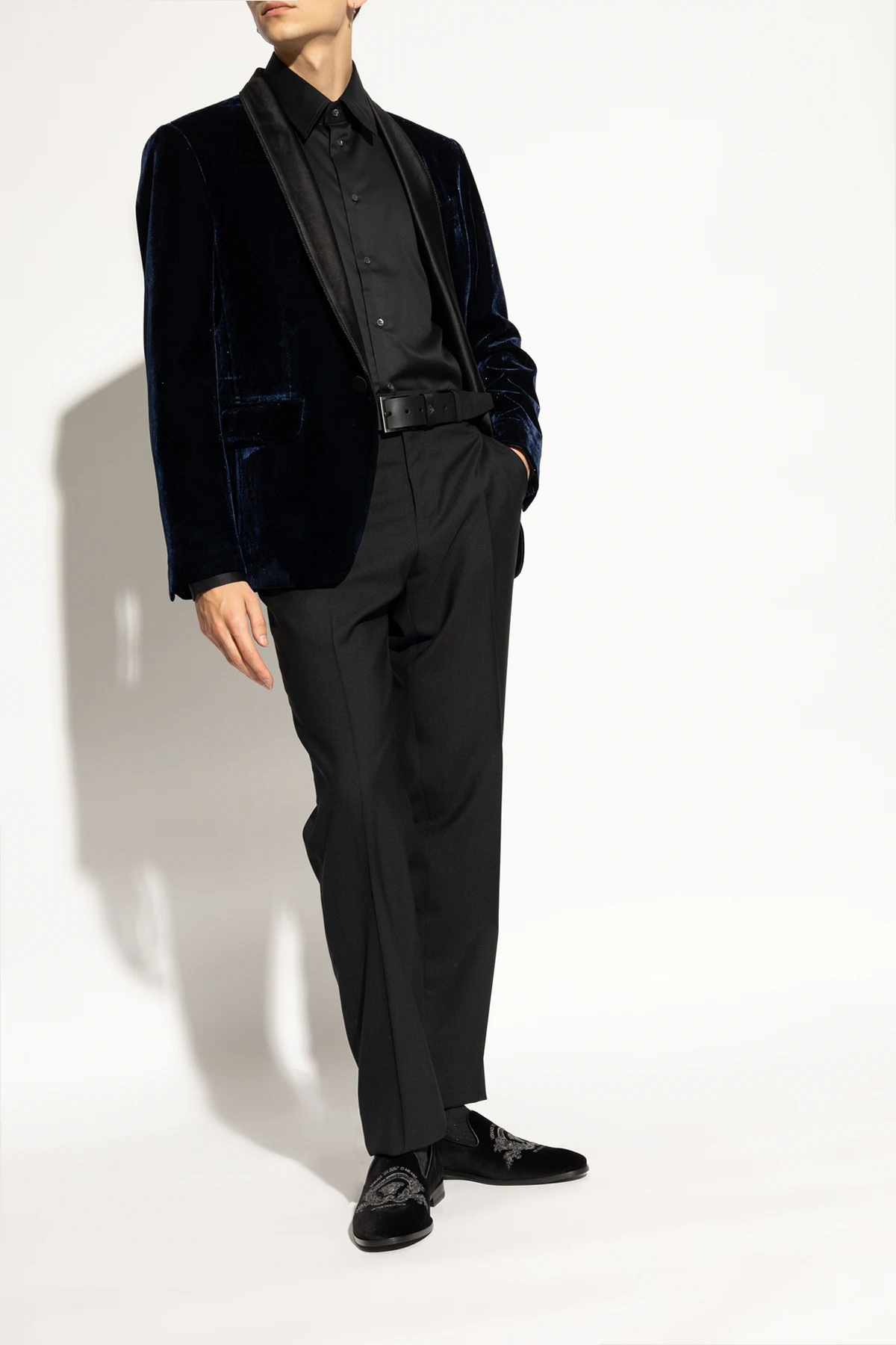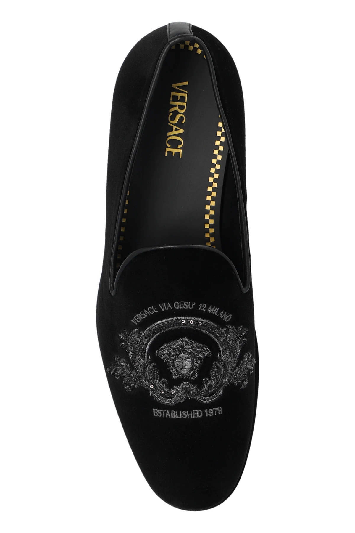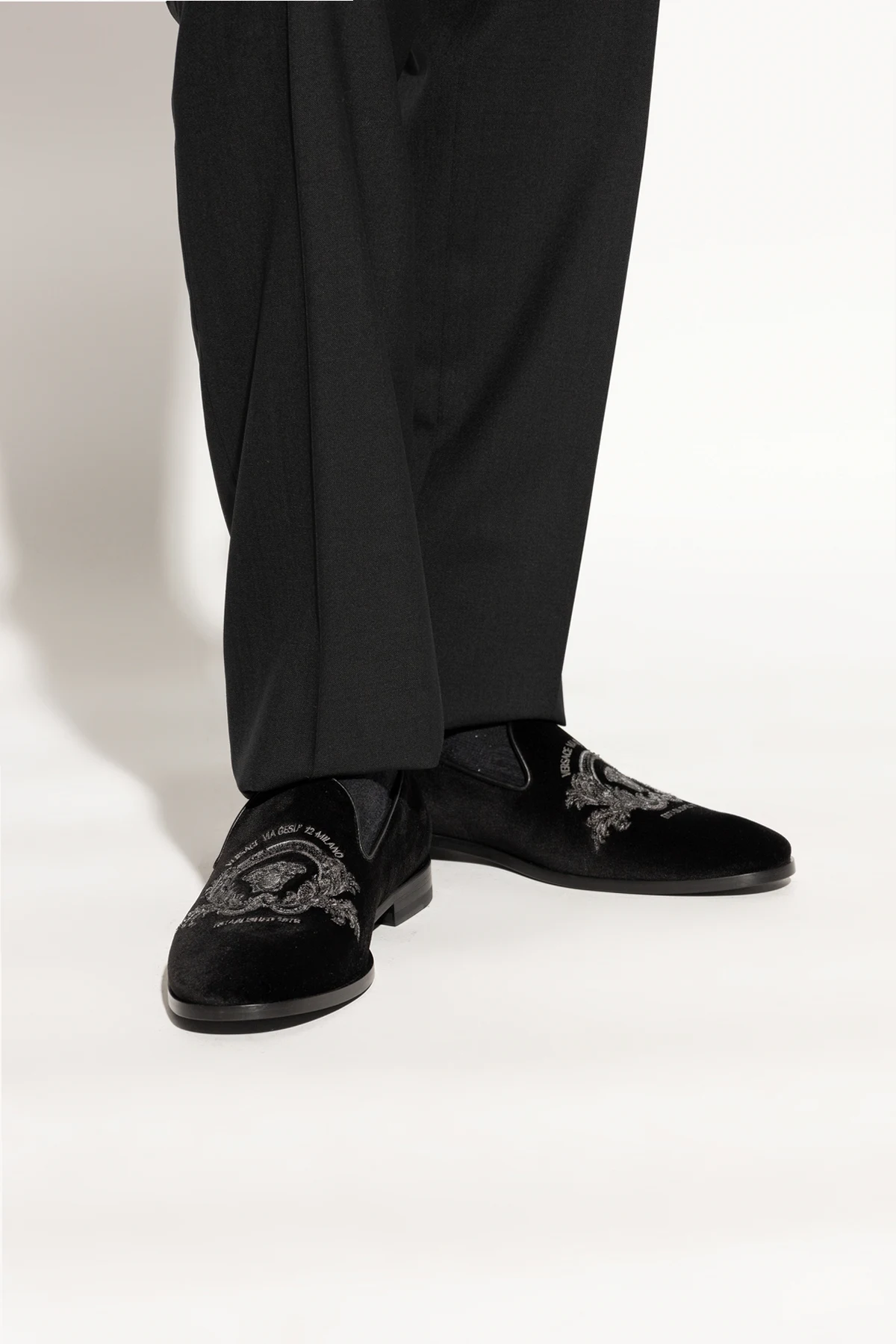 Prezentujemy Państwu buty typu ‘loafers’ od Versace , synonimie luksusu i niepowtarzalnego stylu. Te czarne, eleganckie obuwie zostało wykonane z najwyższej jakości materiałów, łącząc w sobie zamszową lub aksamitną teksturę zewnętrzną z miękką, skórzaną wyściółką. Charakterystyczny dla marki Versace dbałość o detale uwidacznia się w wyrafinowanym haftem ozdabiającym przód buta, co dodaje im unikatowego charakteru.