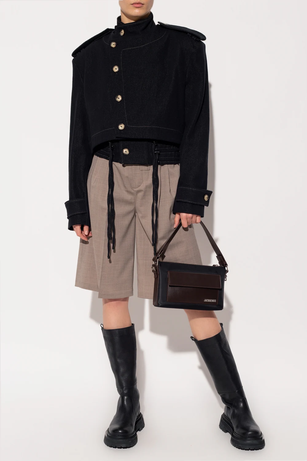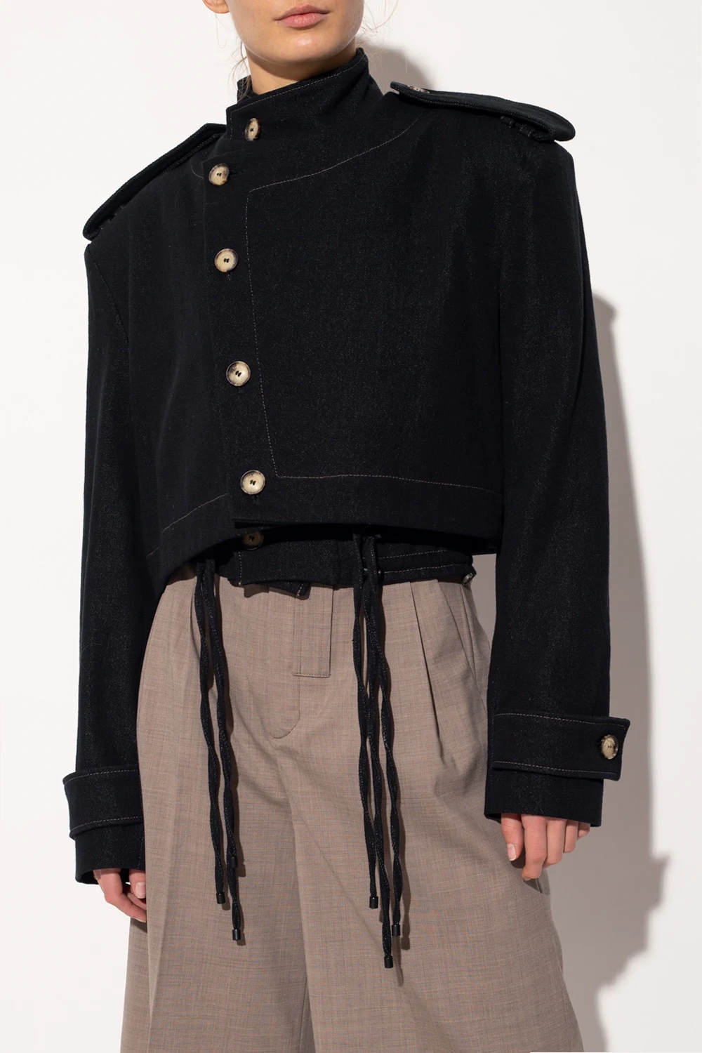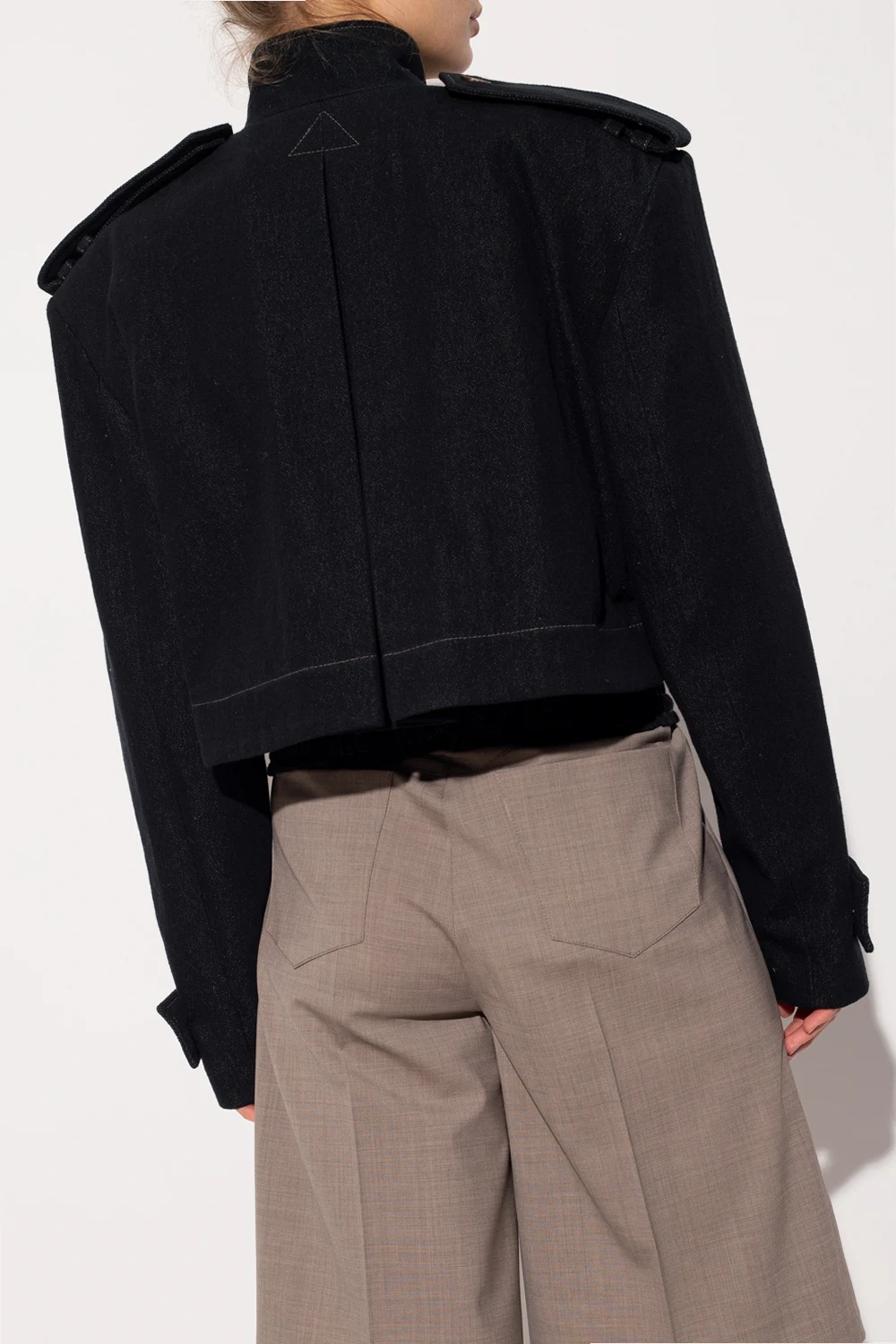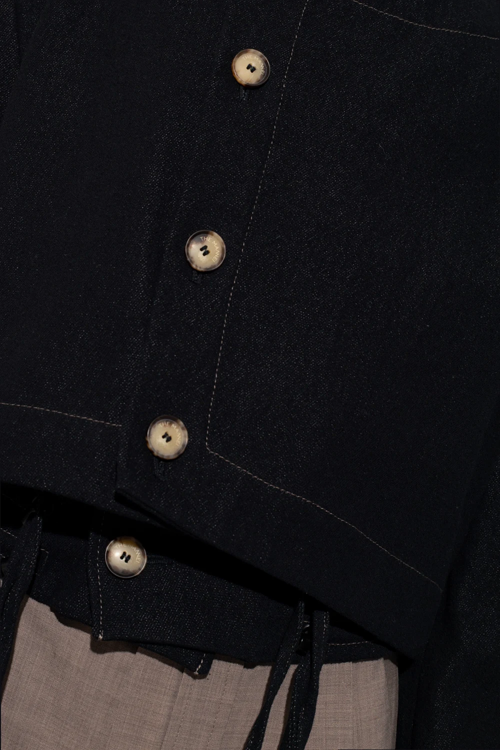 Czarna, jeansowa kurtka ze stójką, model ‘Aqaba’ The Mannei. Wykonana z bawełny. Zapinana na guziki. Dekoracyjne obszycia. Na dole wszyta guma ściągana trokami. Długie rękawy.