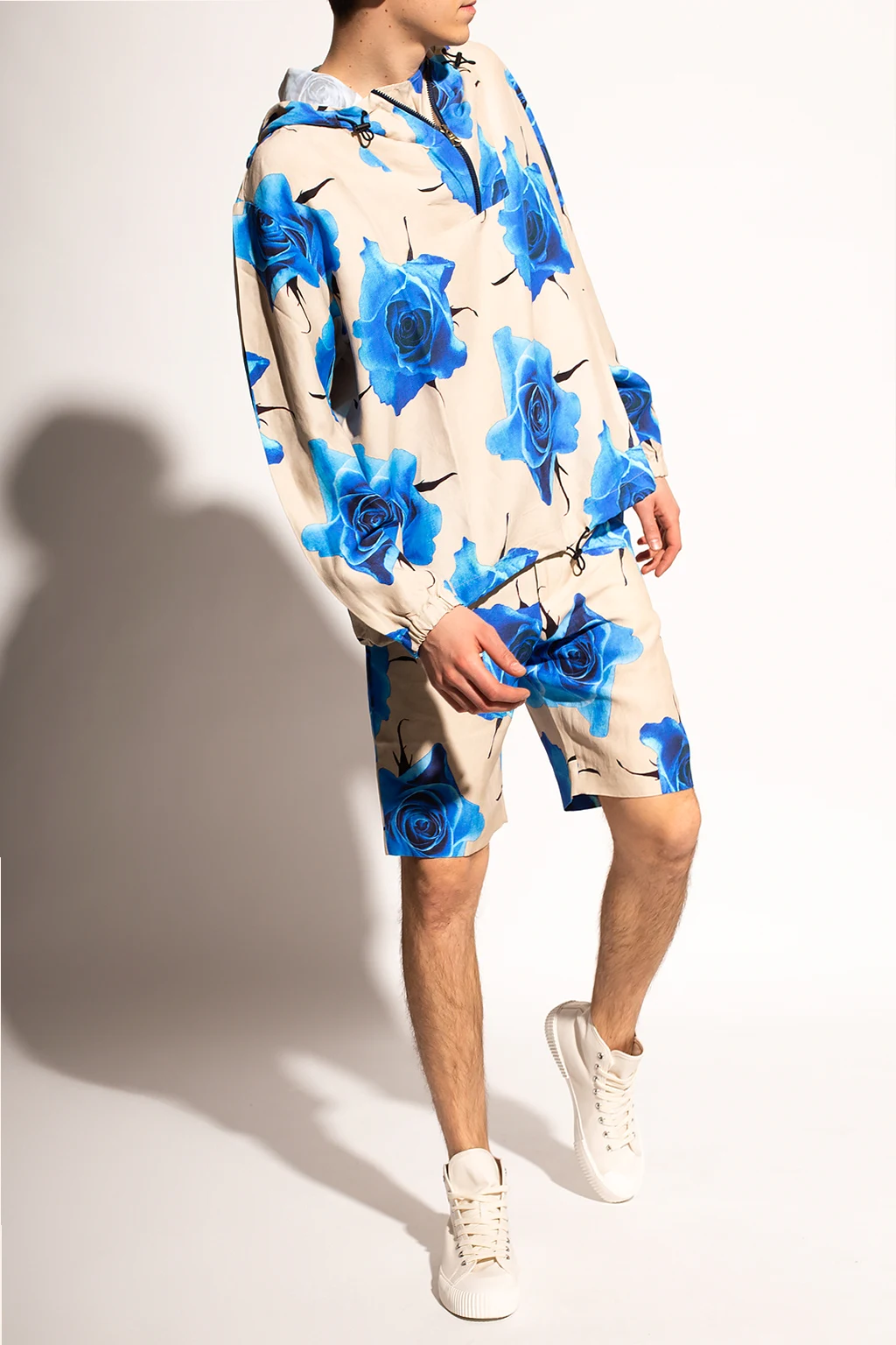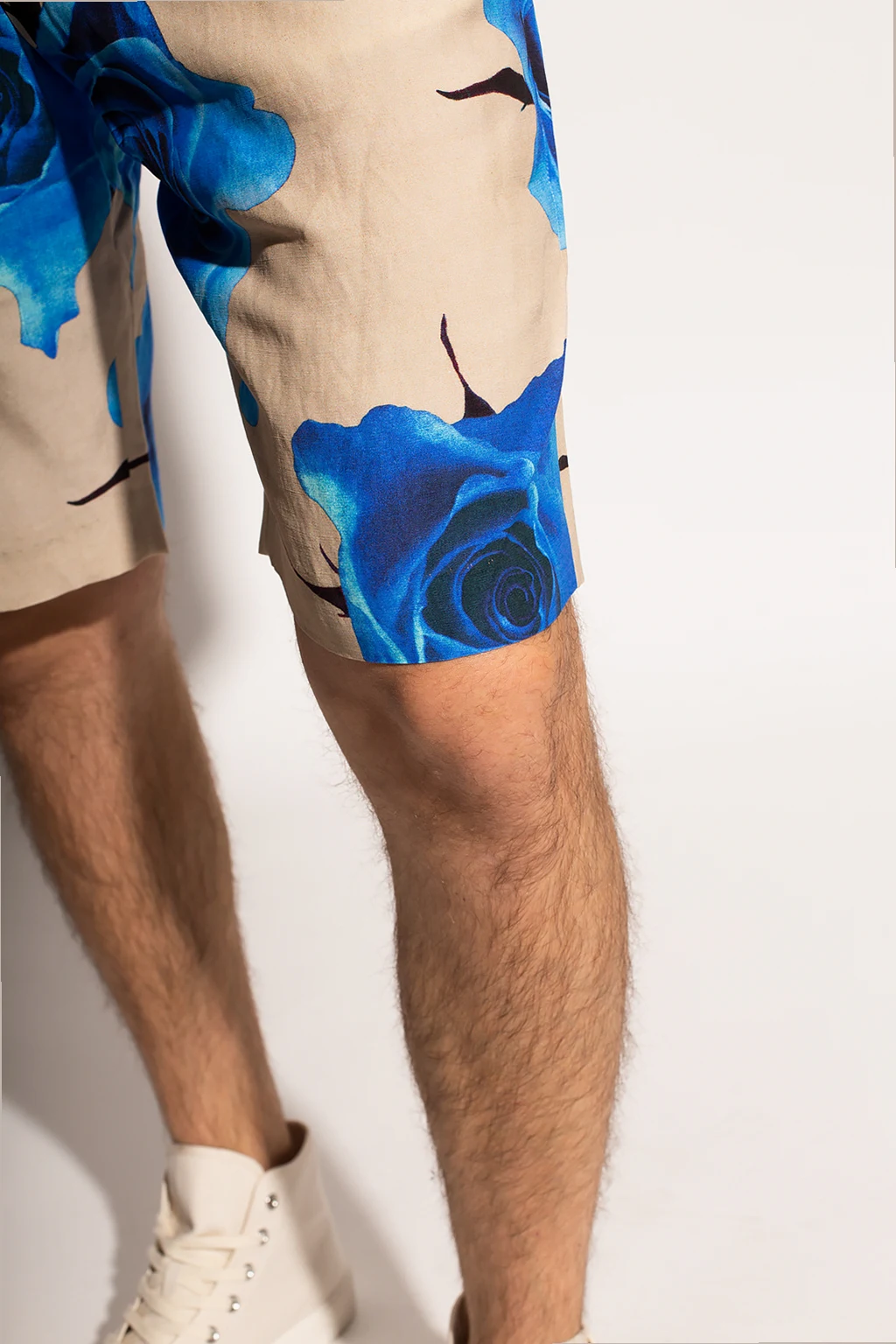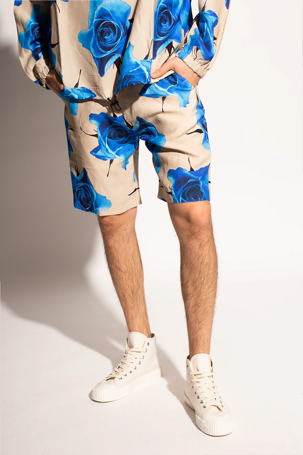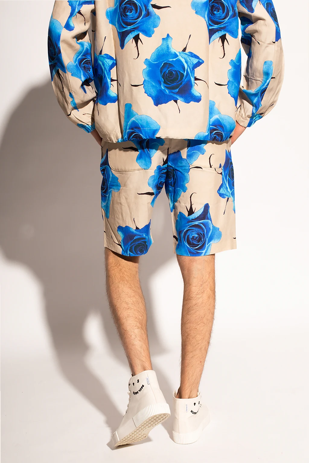 Beżowo-niebieskie, bawełniane szorty Paul Smith. Zapinane na guzik i na zamek oraz ściągane trokami. Cztery wsuwane kieszenie: dwie z przodu i dwie z tyłu. Ozdobione nadrukowanym wzorem z motywem kwiatowym.
