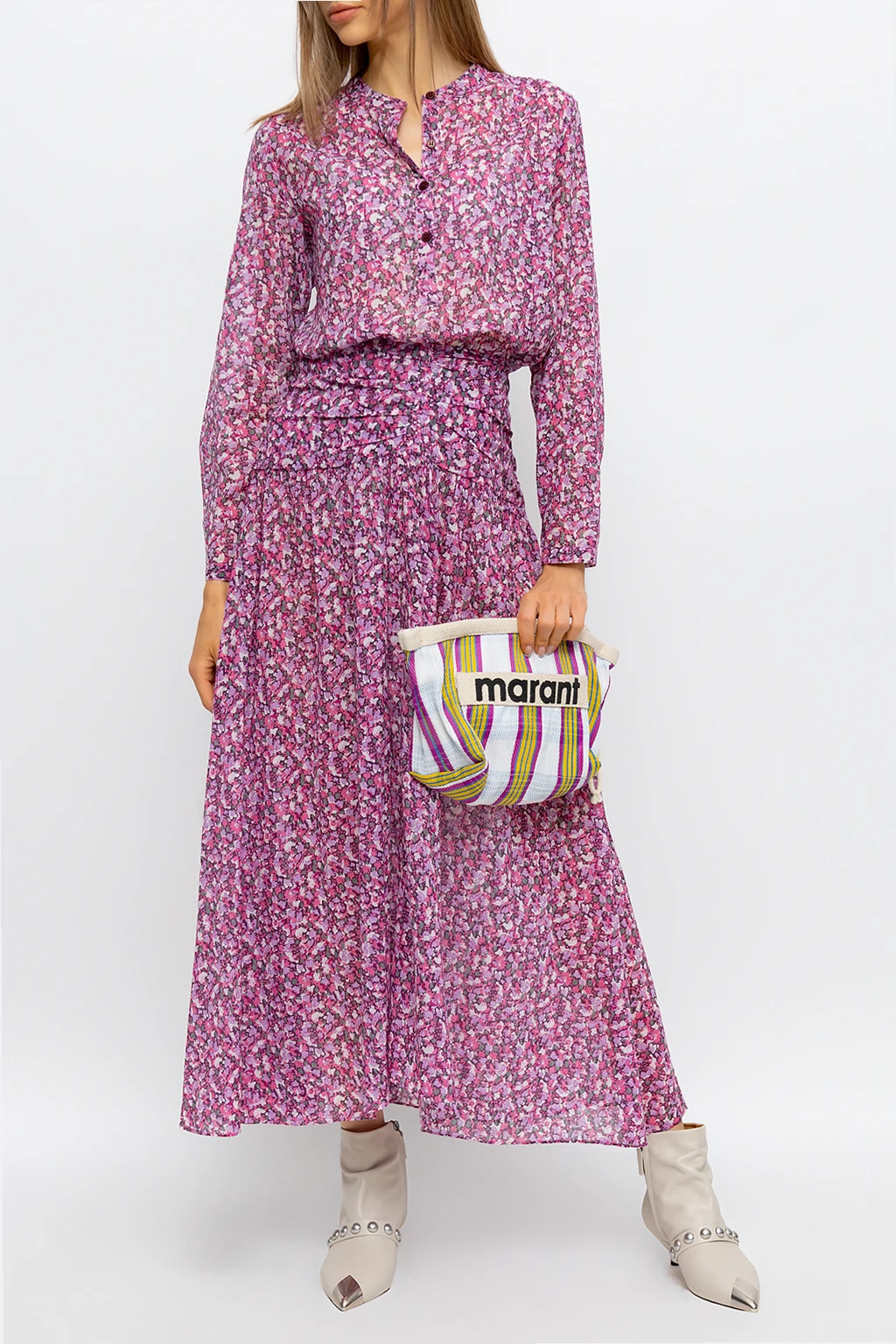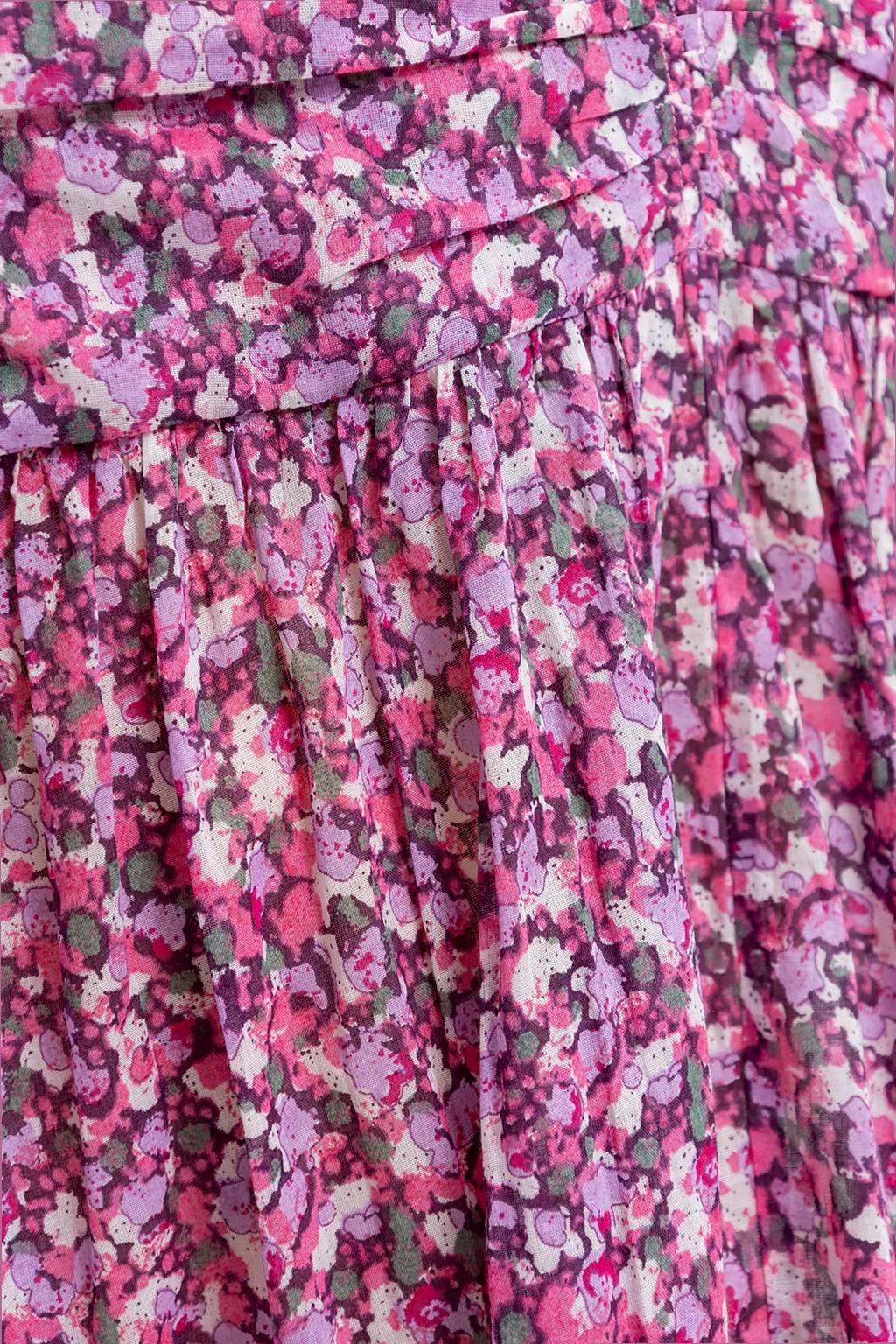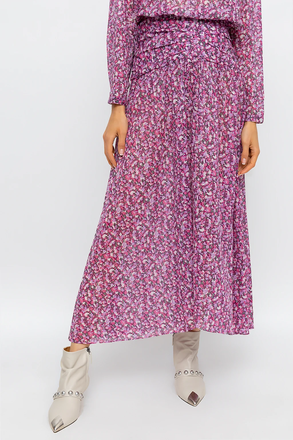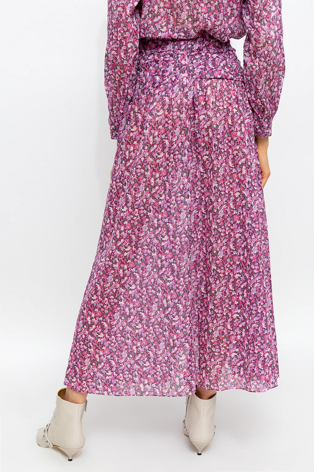Różowa, długa spódnica, model ‘Marino’ Isabel Marant Etoile. Wykonana z bawełny organicznej. Zapinana z boku na kryty zamek oraz haftkę. Ozdobiona kolorowym wzorem z motywem kwiatowym. Dekoracyjnie marszczona góra i rozszerzany dół.