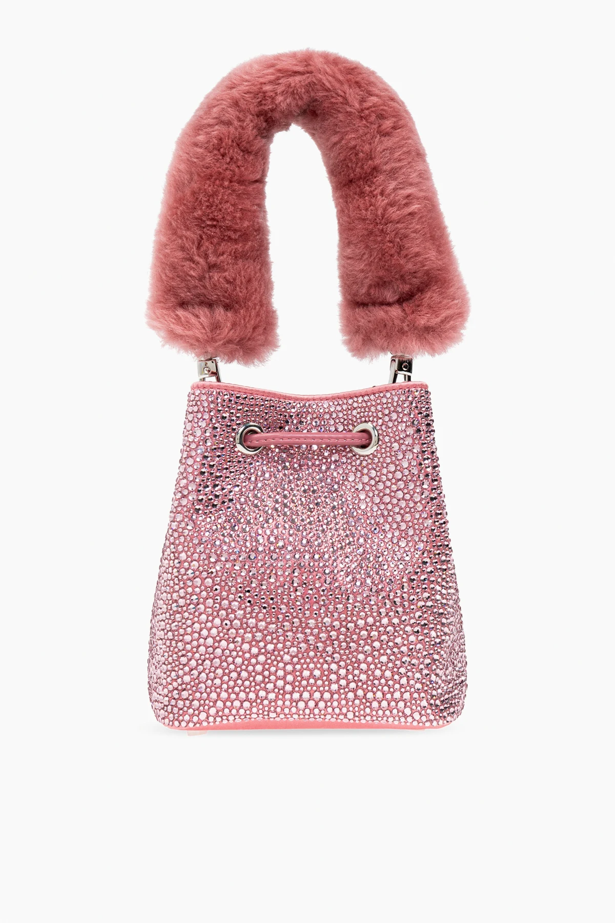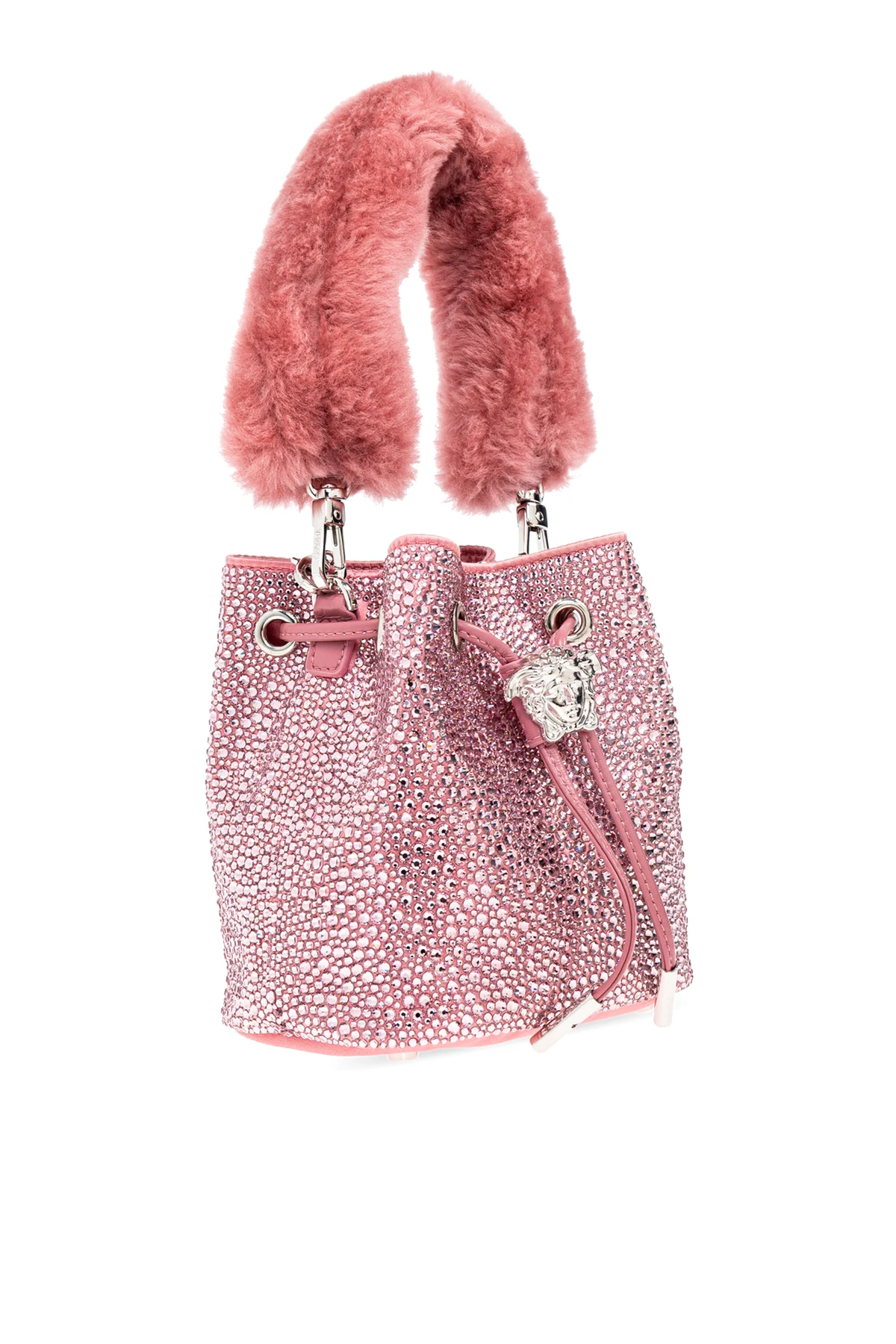 Wykonana z wyselekcjonowanych materiałów, w tym wiskozy i jedwabiu, torba zachwyca bogactwem błyszczących kryształków. Uroku dodaje puszysty, różowy uchwyt, a srebrne logo Medusa subtelnie podkreśla prestiż marki.