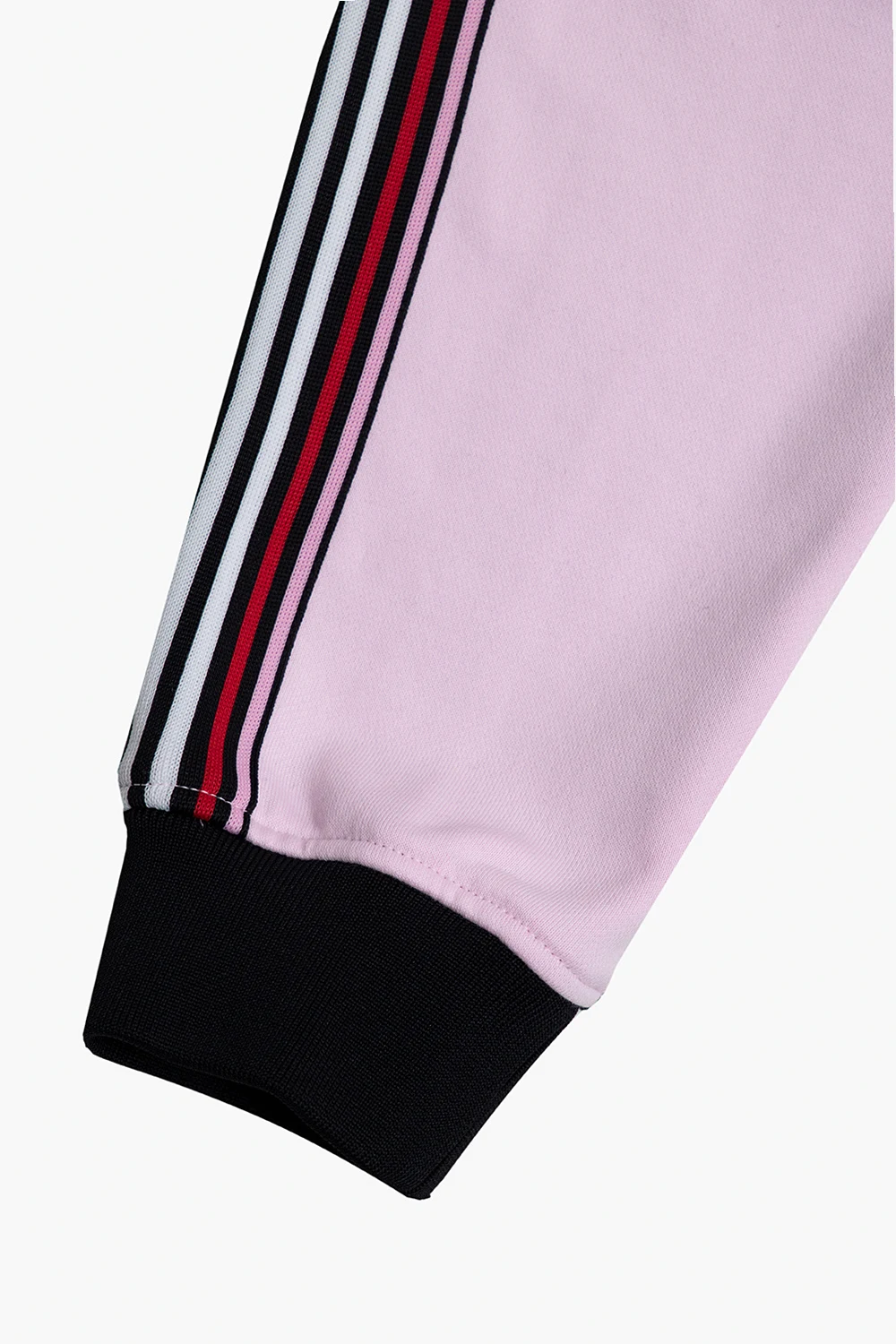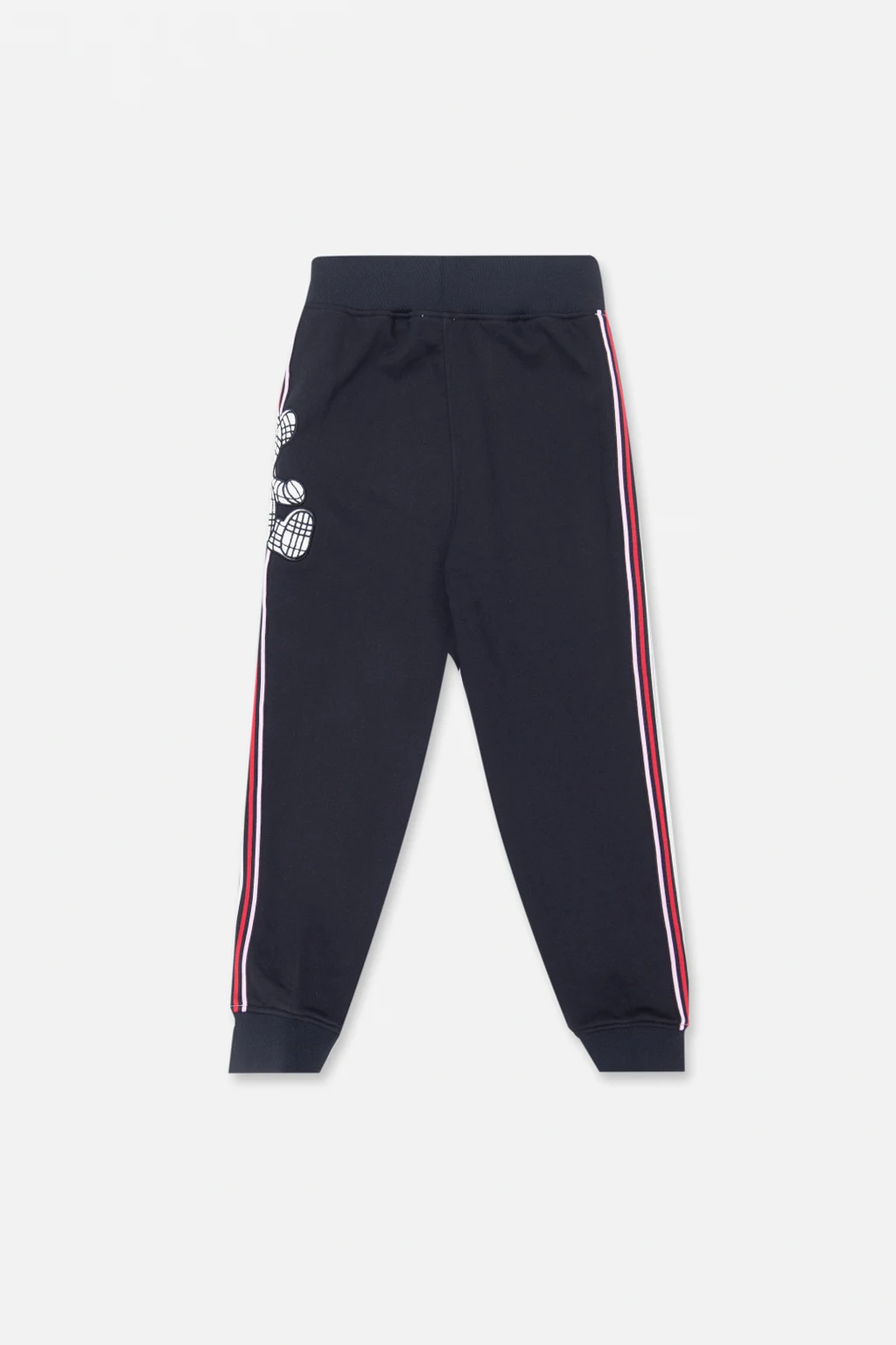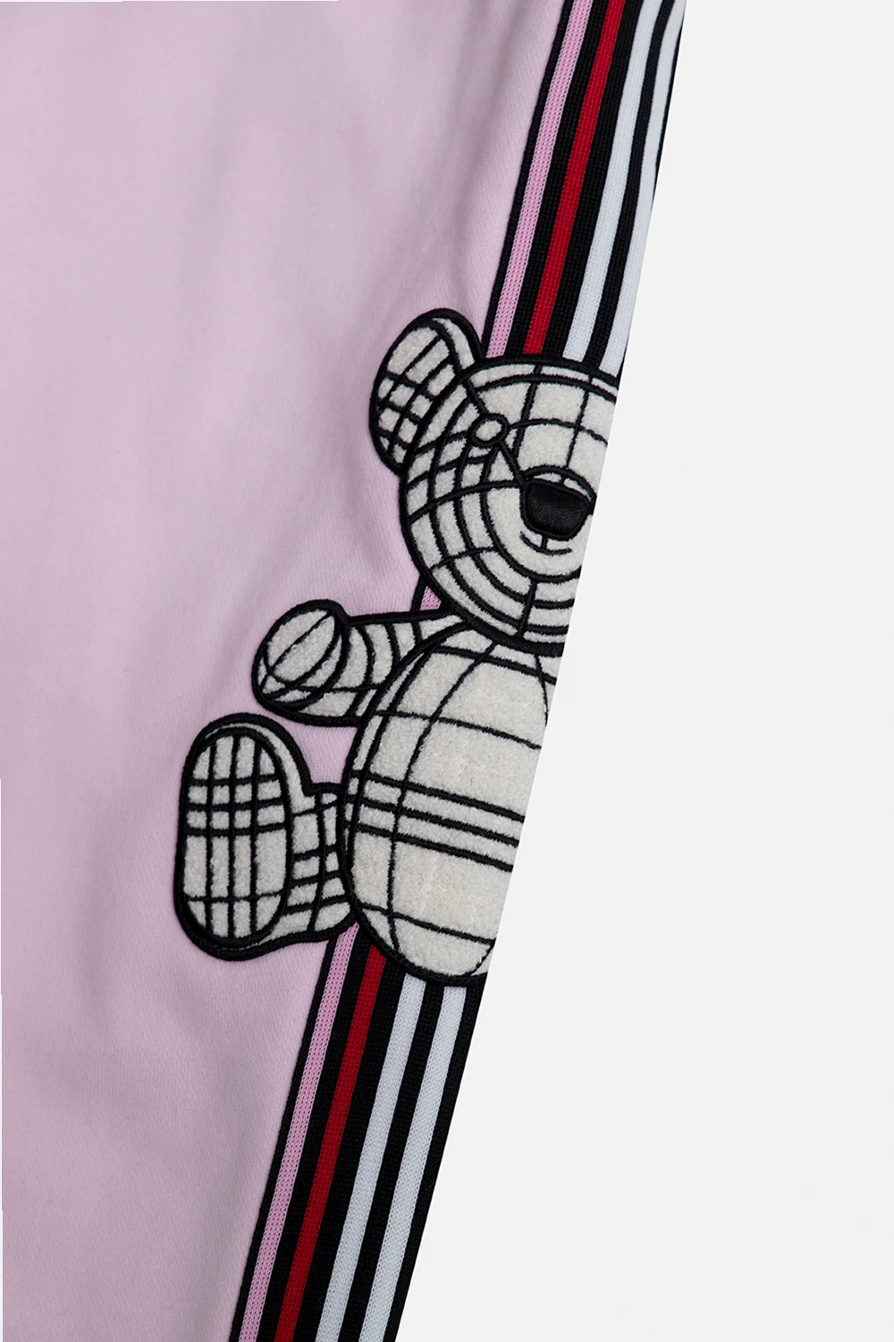 Różowo-czarne, bawełniane spodnie dresowe Burberry. W pasie wszyta guma. Ozdobione naszywką z charakterystycznym motywem misia i kolorowymi lampasami. Nogawki zakończone ściągaczem.