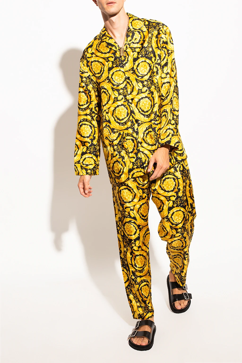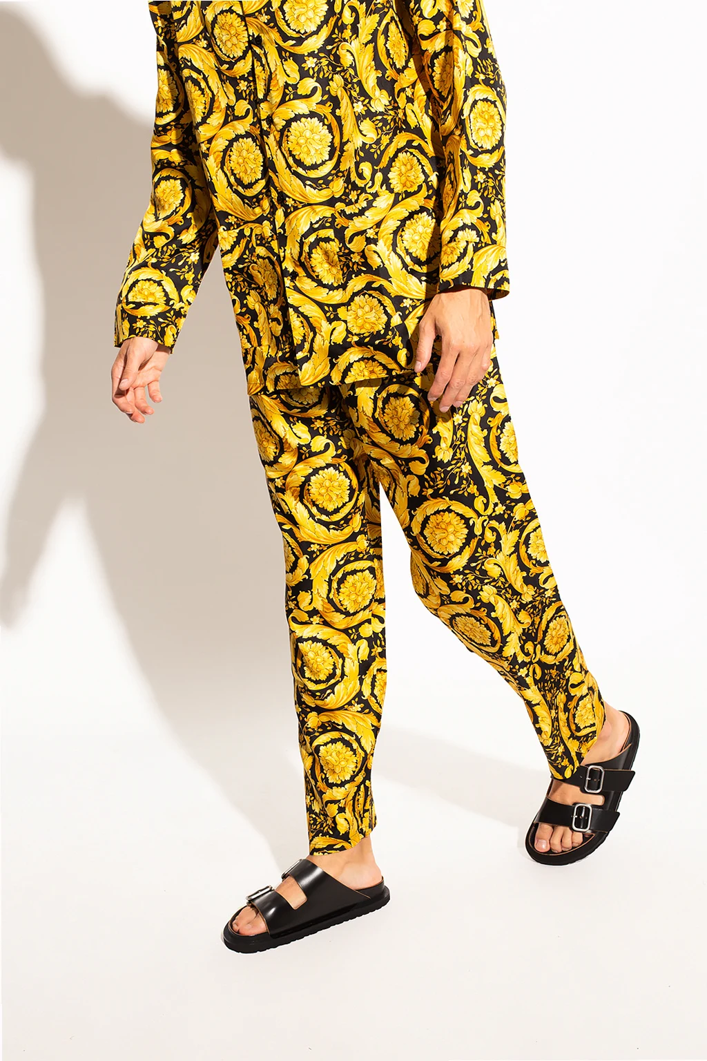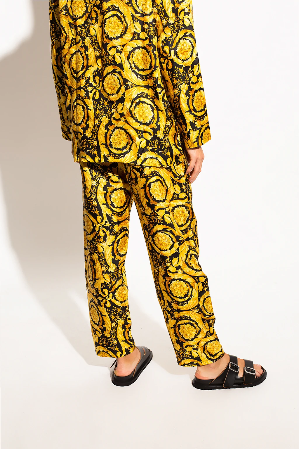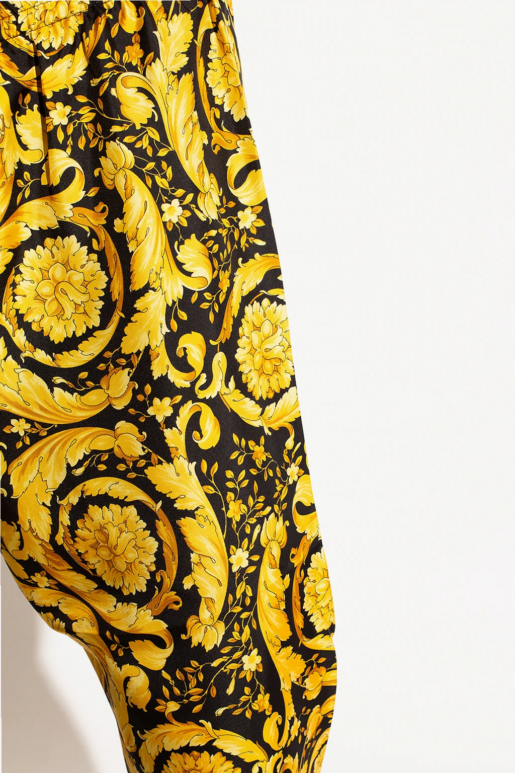 Czarno-pomarańczowy, jedwabny dół od piżamy Versace. W pasie wszyta guma. Ozdobiony charakterystycznym dla marki motywem barokowym.