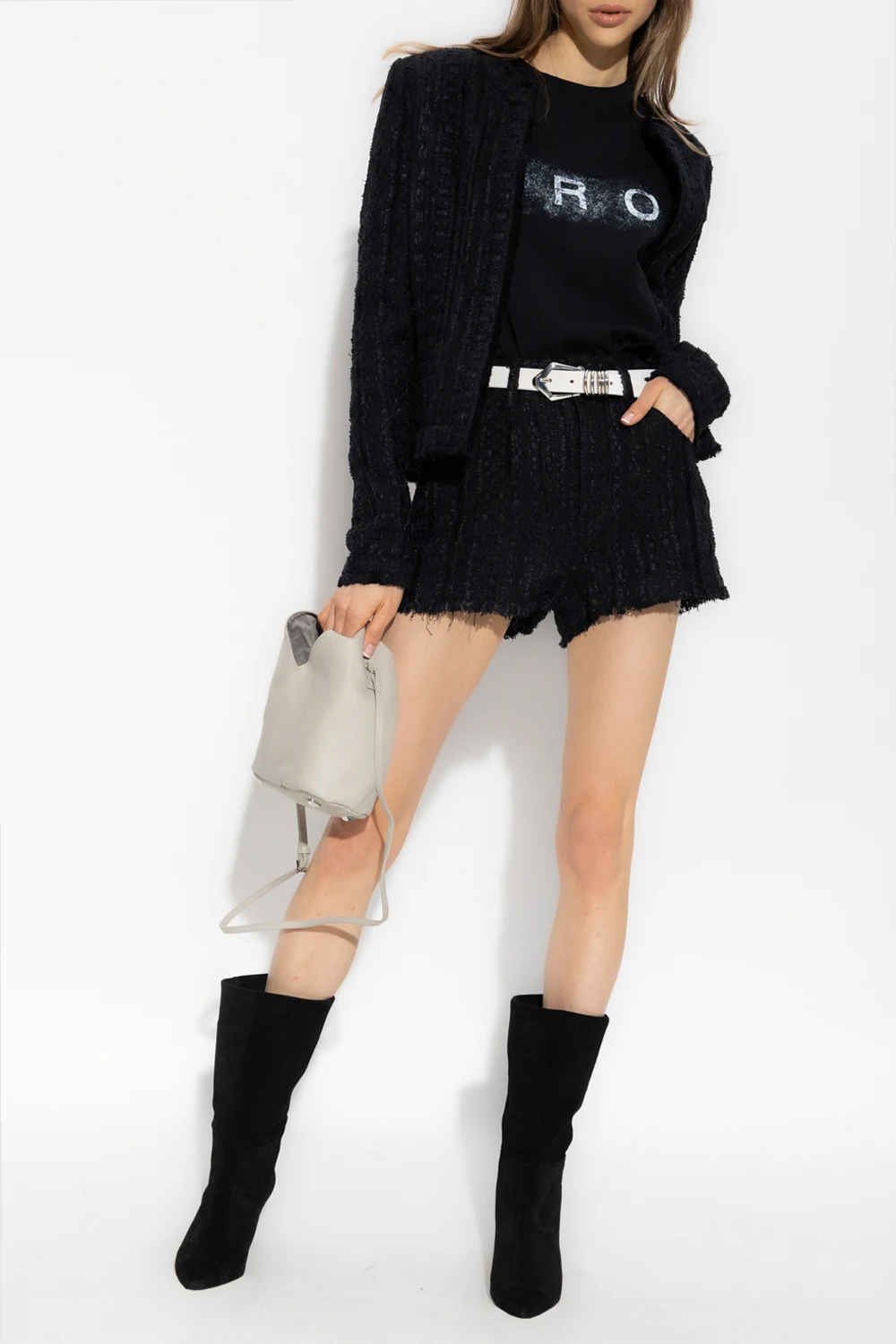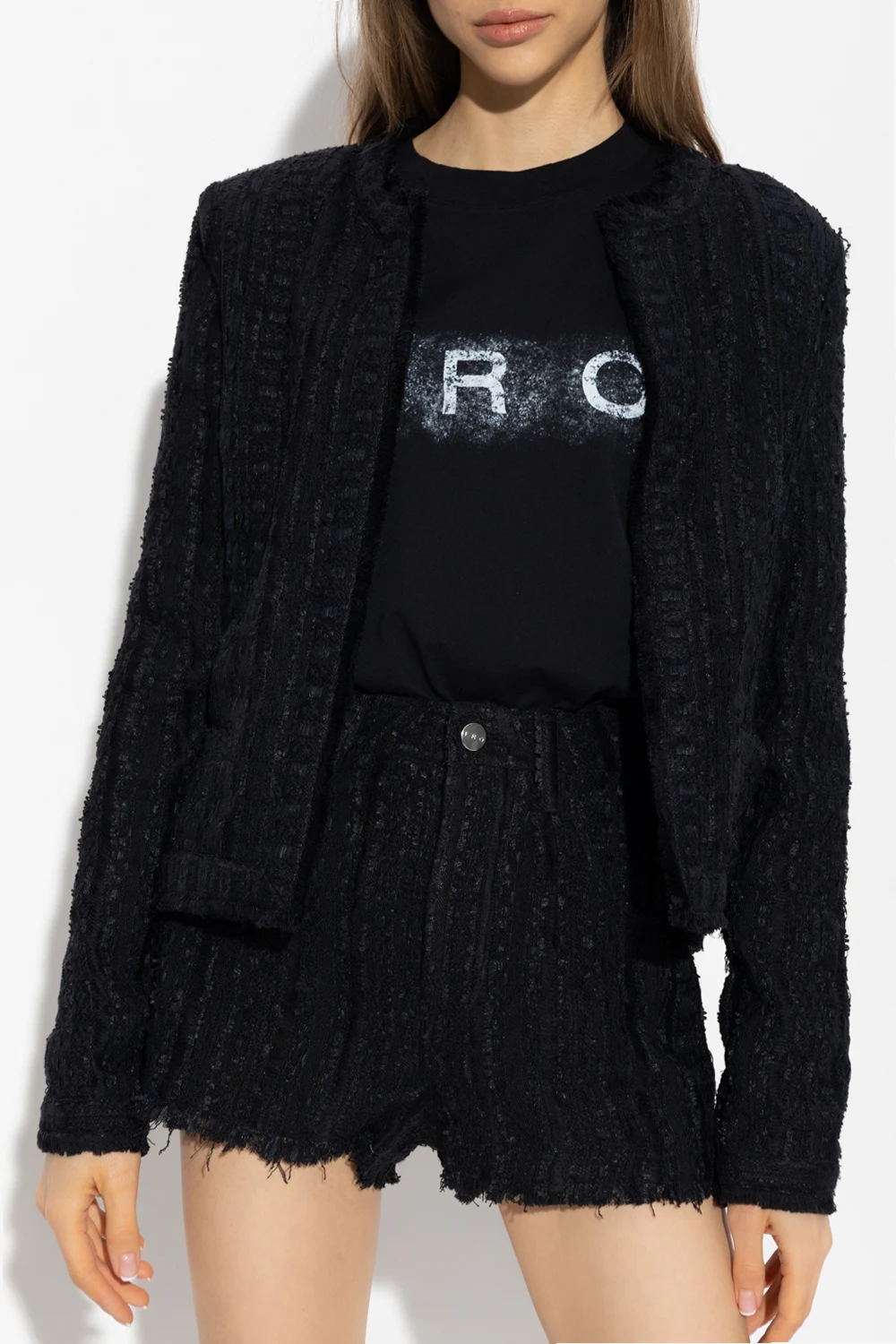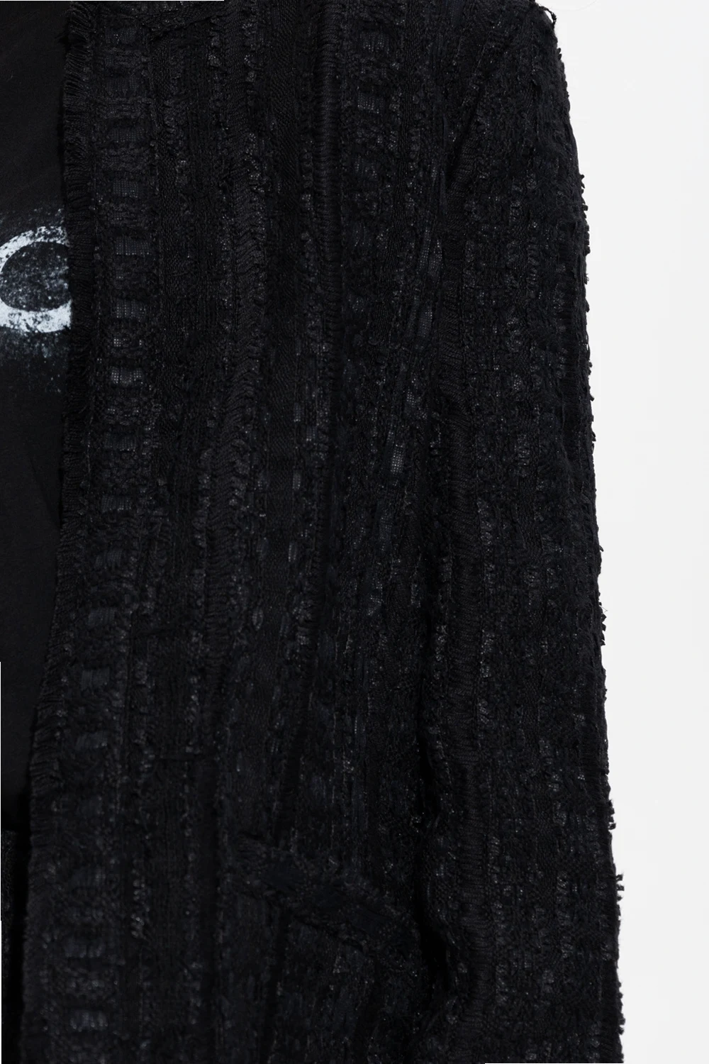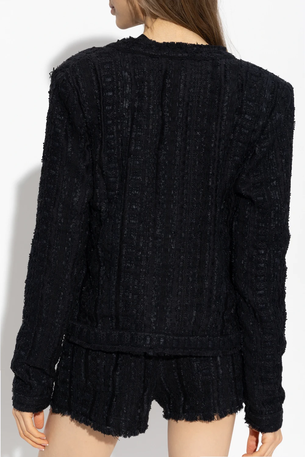 Czarna, tweedowa kurtka, model ‘Sorayan’ Iro. Wykonana z mieszanki bawełny. Dwie wsuwane kieszenie. Przód, długie rękawy oraz dół wykończone krótkimi frędzlami.