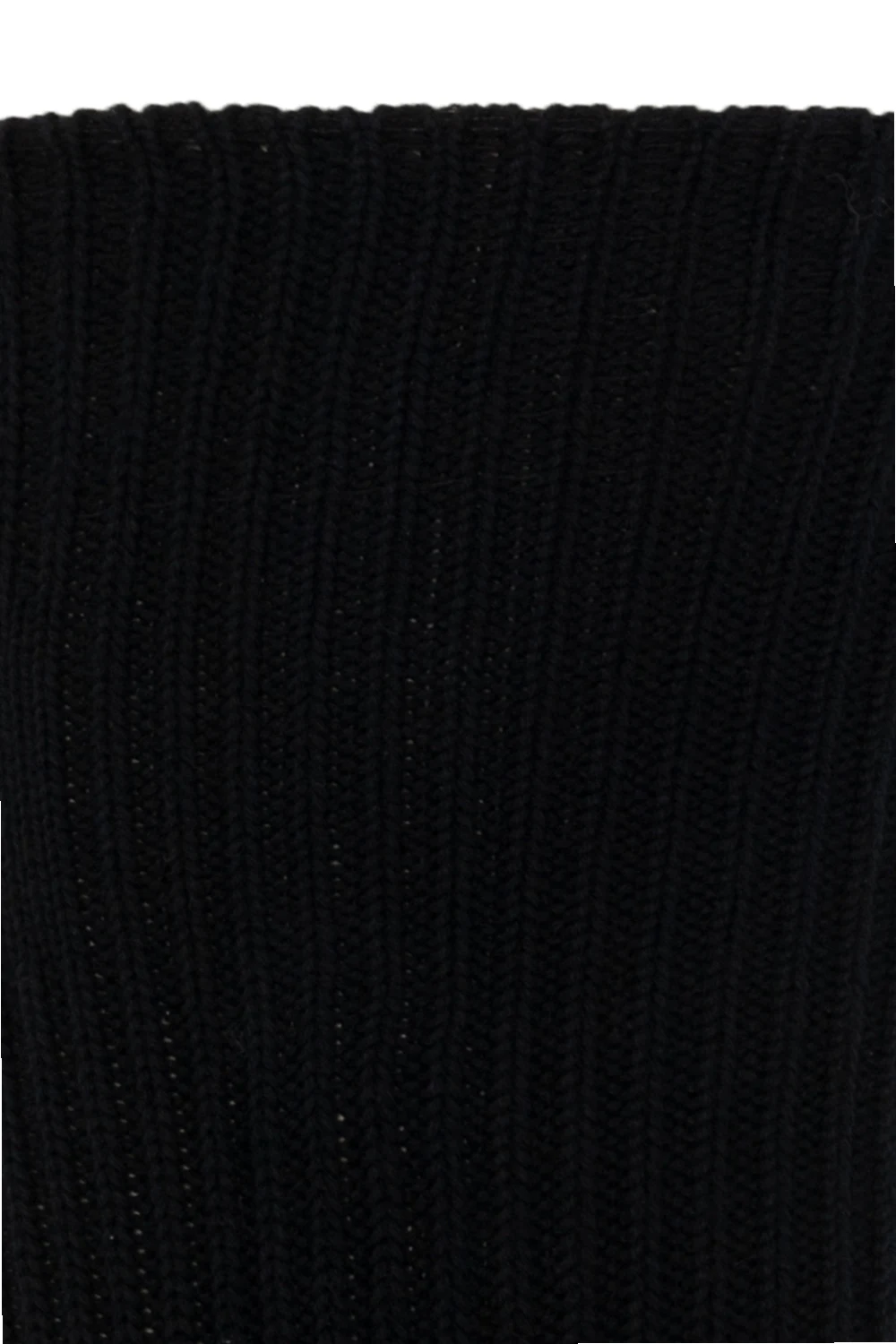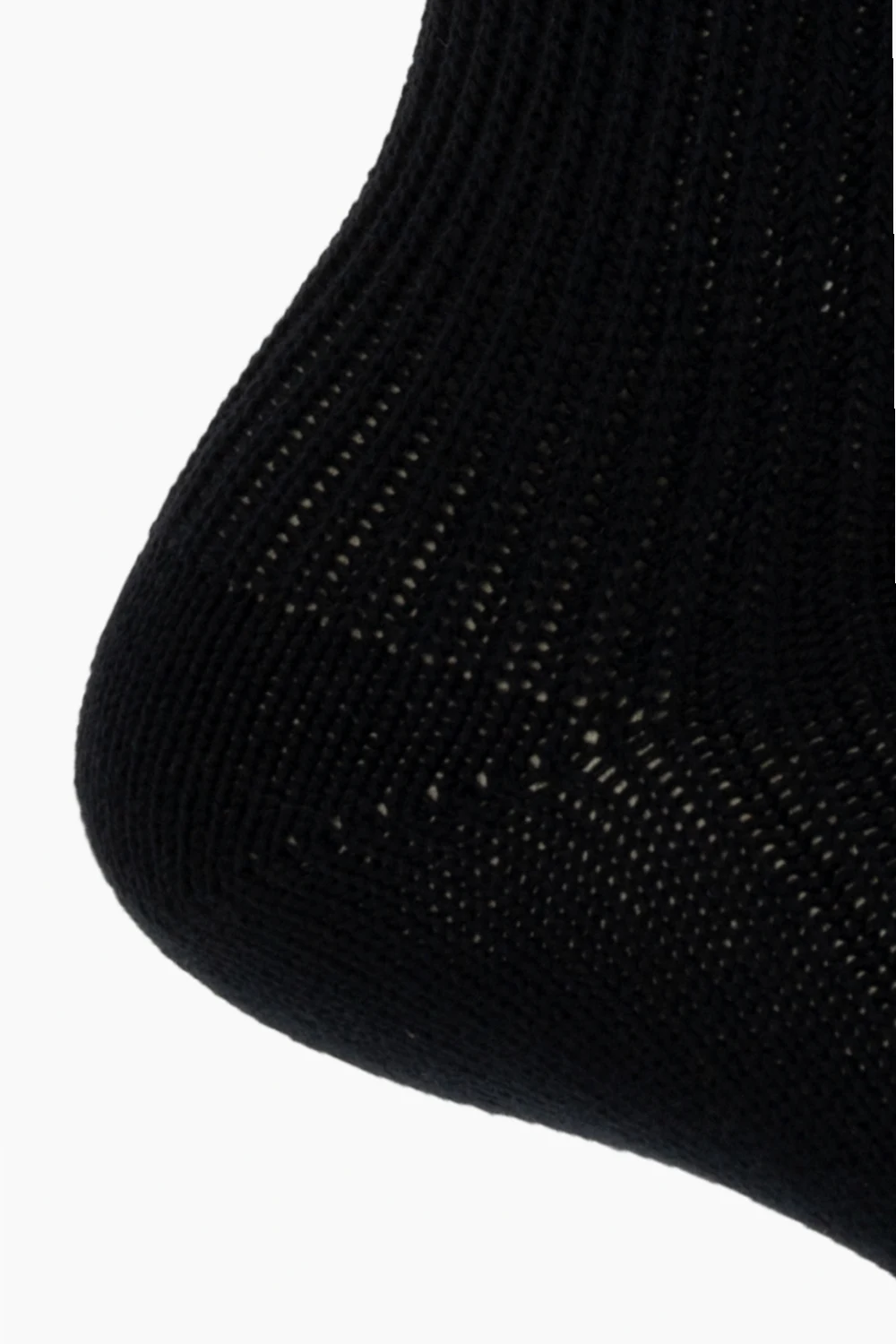 Czarne, prążkowane skarpety Yohji Yamamoto. Wykonane z wełny. Ozdobione wzorem z logo w kolorze białym. Wykończone ściągaczem.