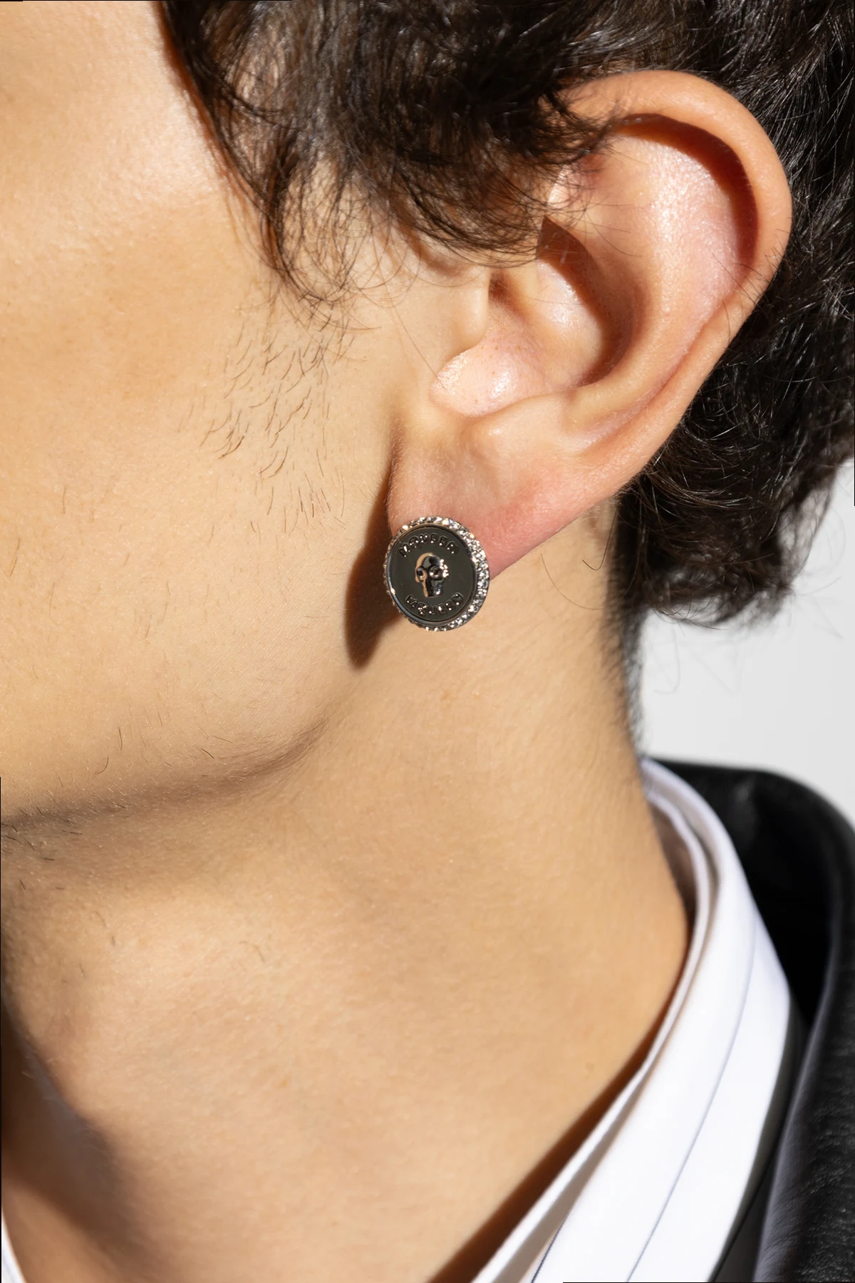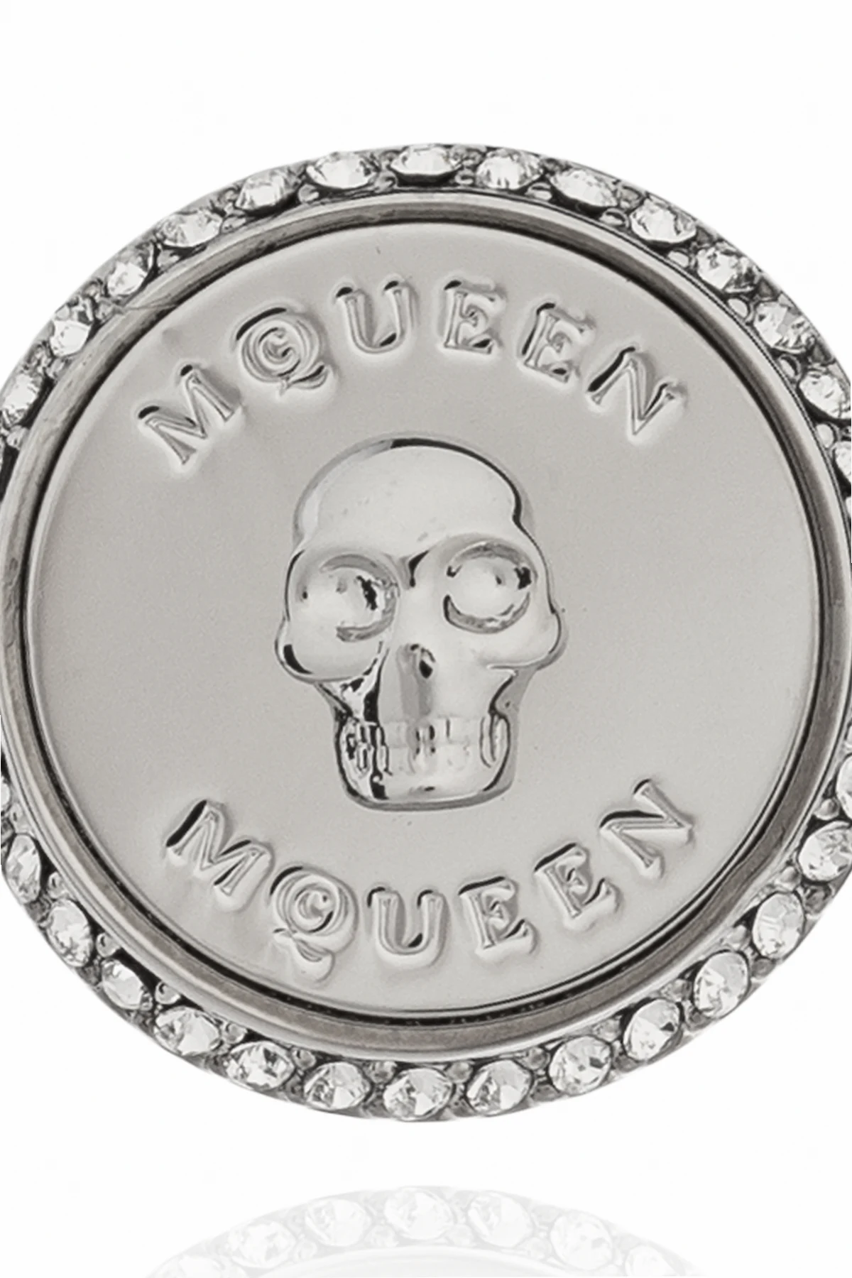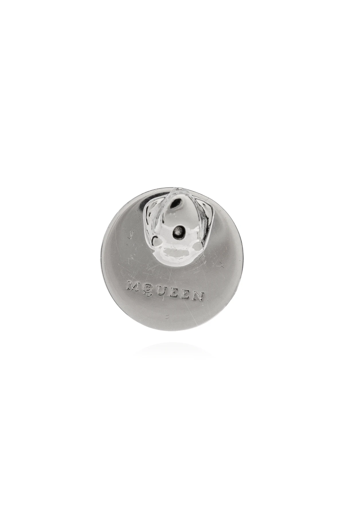 Kształt i wygląd: Kolczyk ma okrągły kształt, wykonany w dominującym srebrnym kolorze, co nadaje mu subtelny blask. Na przodzie kolczyka znajduje się wytłoczona czaszka umieszczona centralnie, otoczona napisem "MCQUEEN" zarówno na górze, jak i na dole, co podkreśla jego charakterystyczny styl.