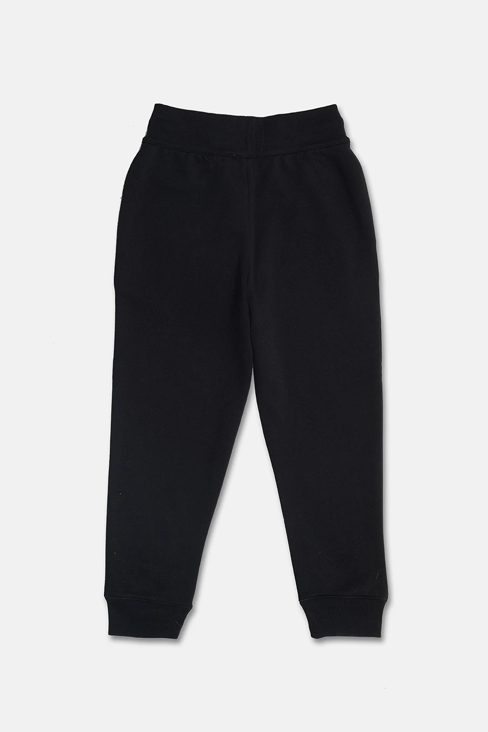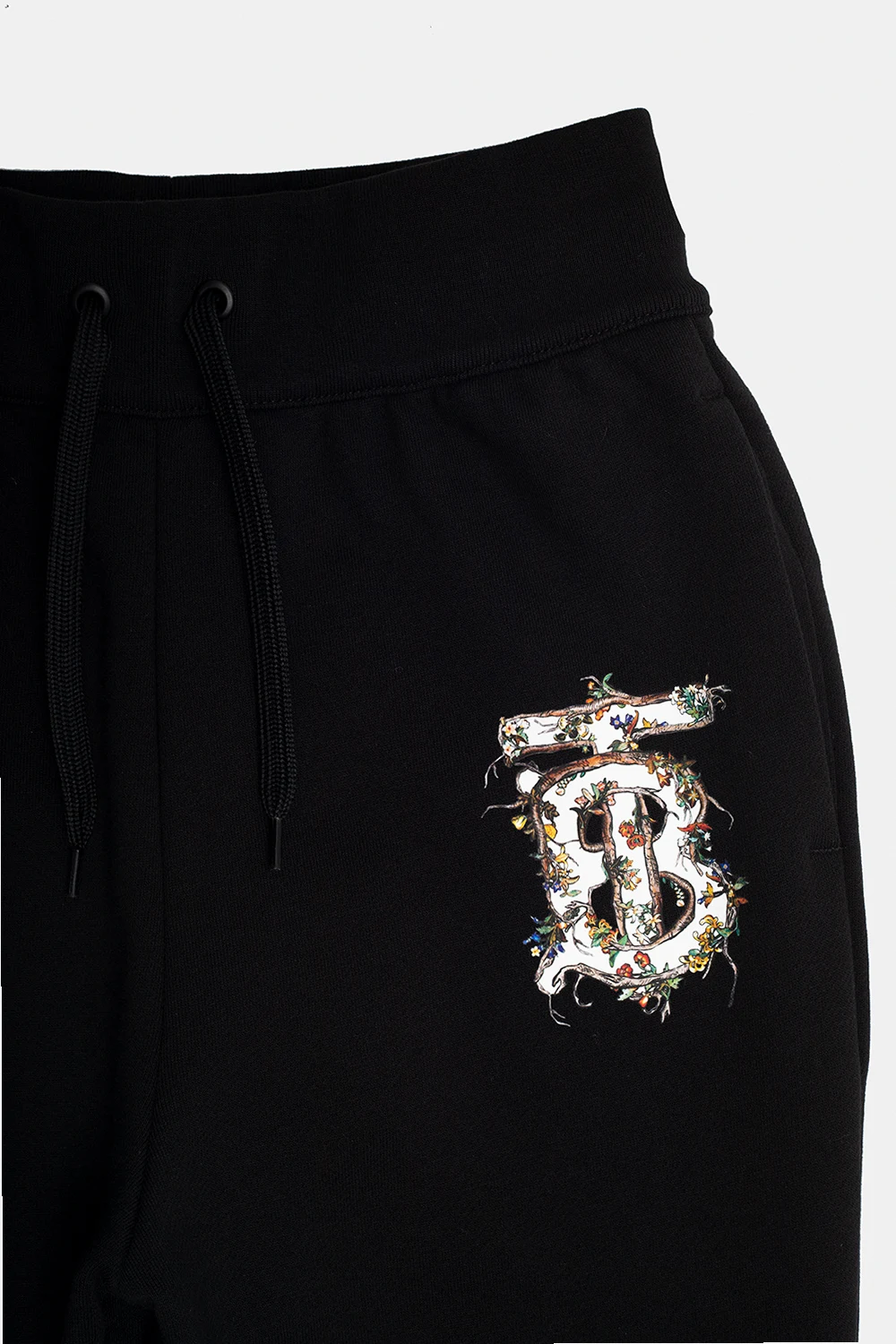 Czarne spodnie dresowe, model ‘Alba’ Burberry Kids. Wykonane z bawełny. W pasie wszyta guma ściągana trokami. Z przodu ozdobione logo z kolorowym motywem roślinnym. Dwie wsuwane kieszenie. Długie nogawki zakończone ściągaczem.