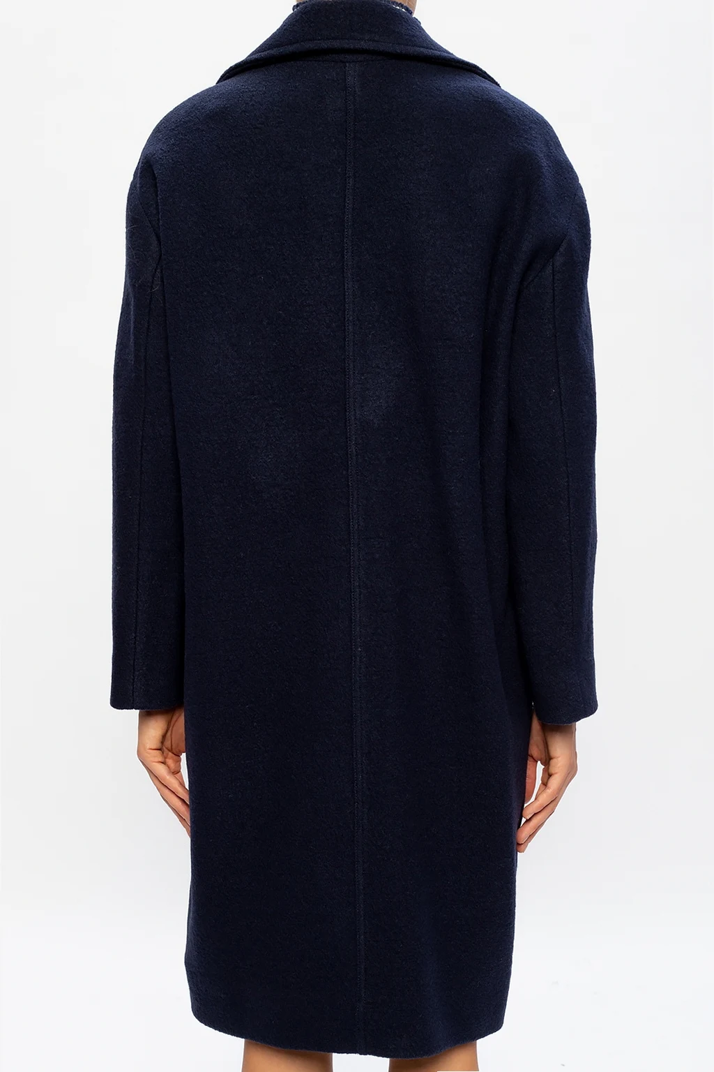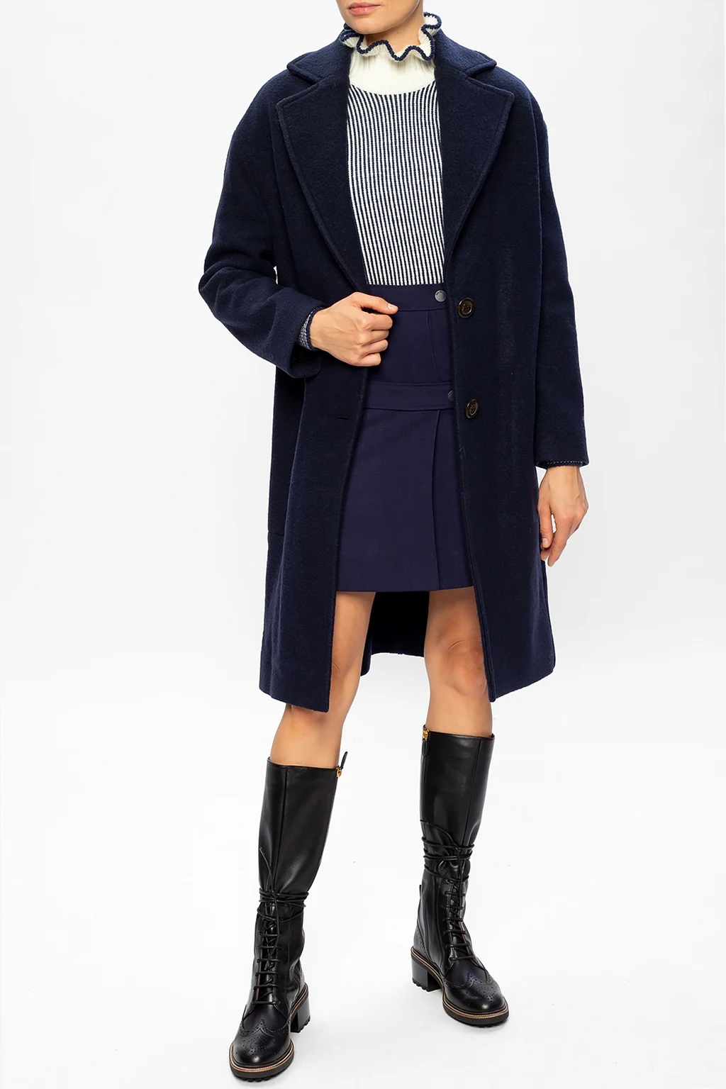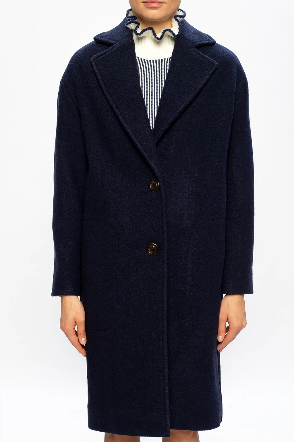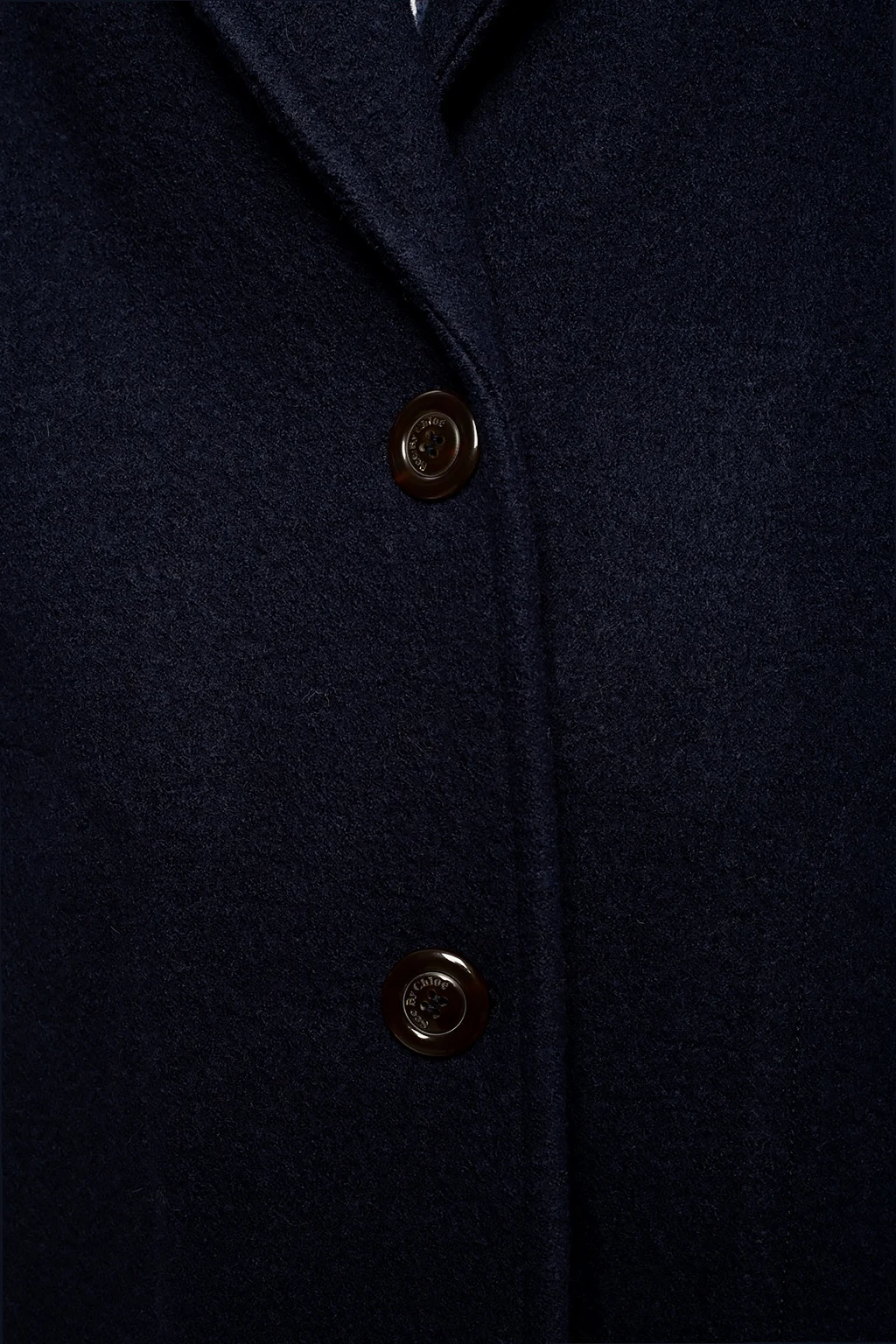 Granatowy, wełniany płaszcz z otwartymi klapami See By Chloé. Zapinany na guziki. Z przodu dwie wsuwane kieszenie.