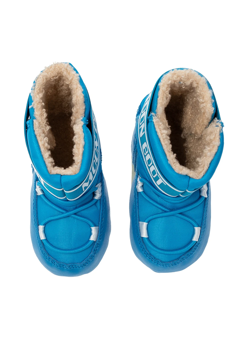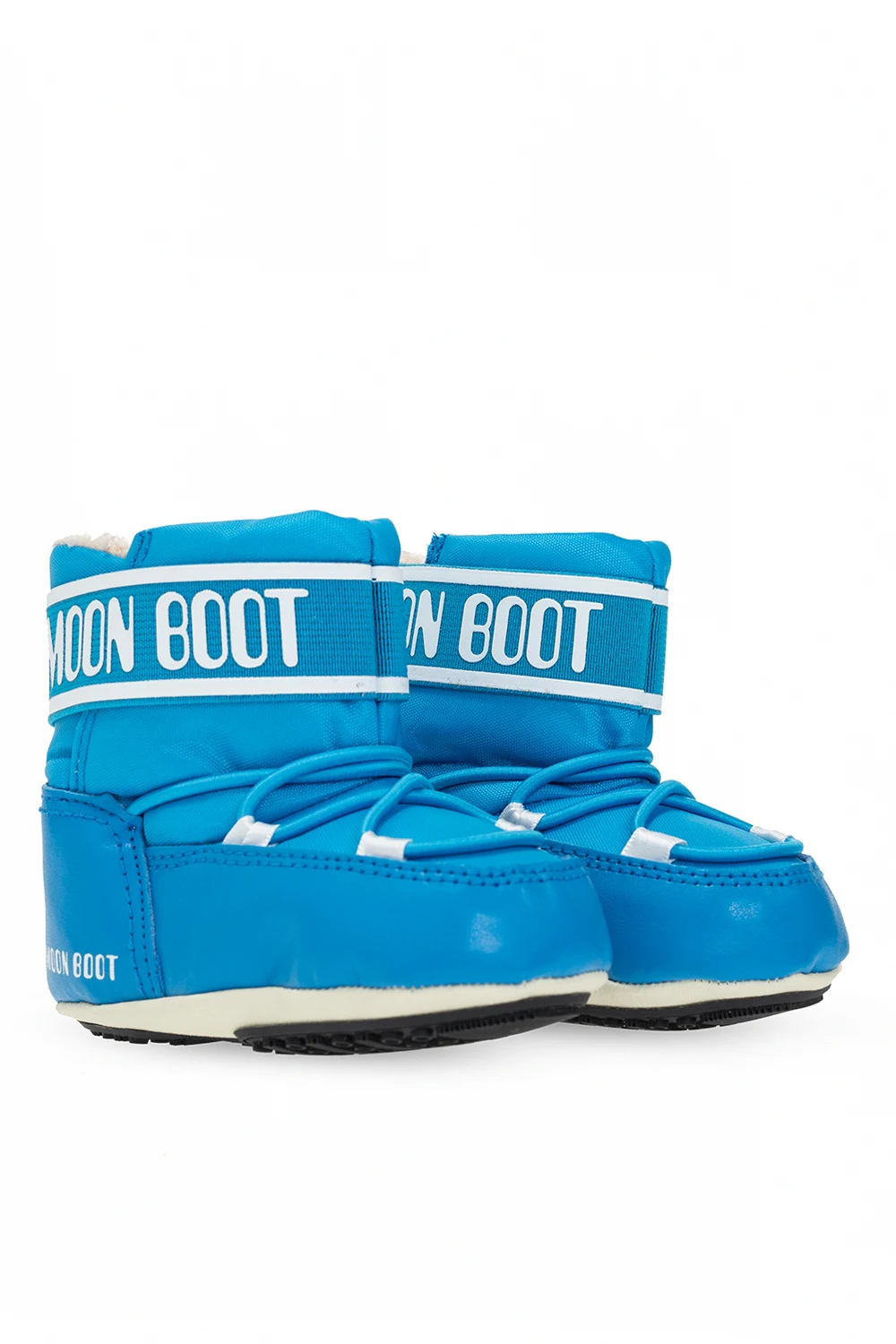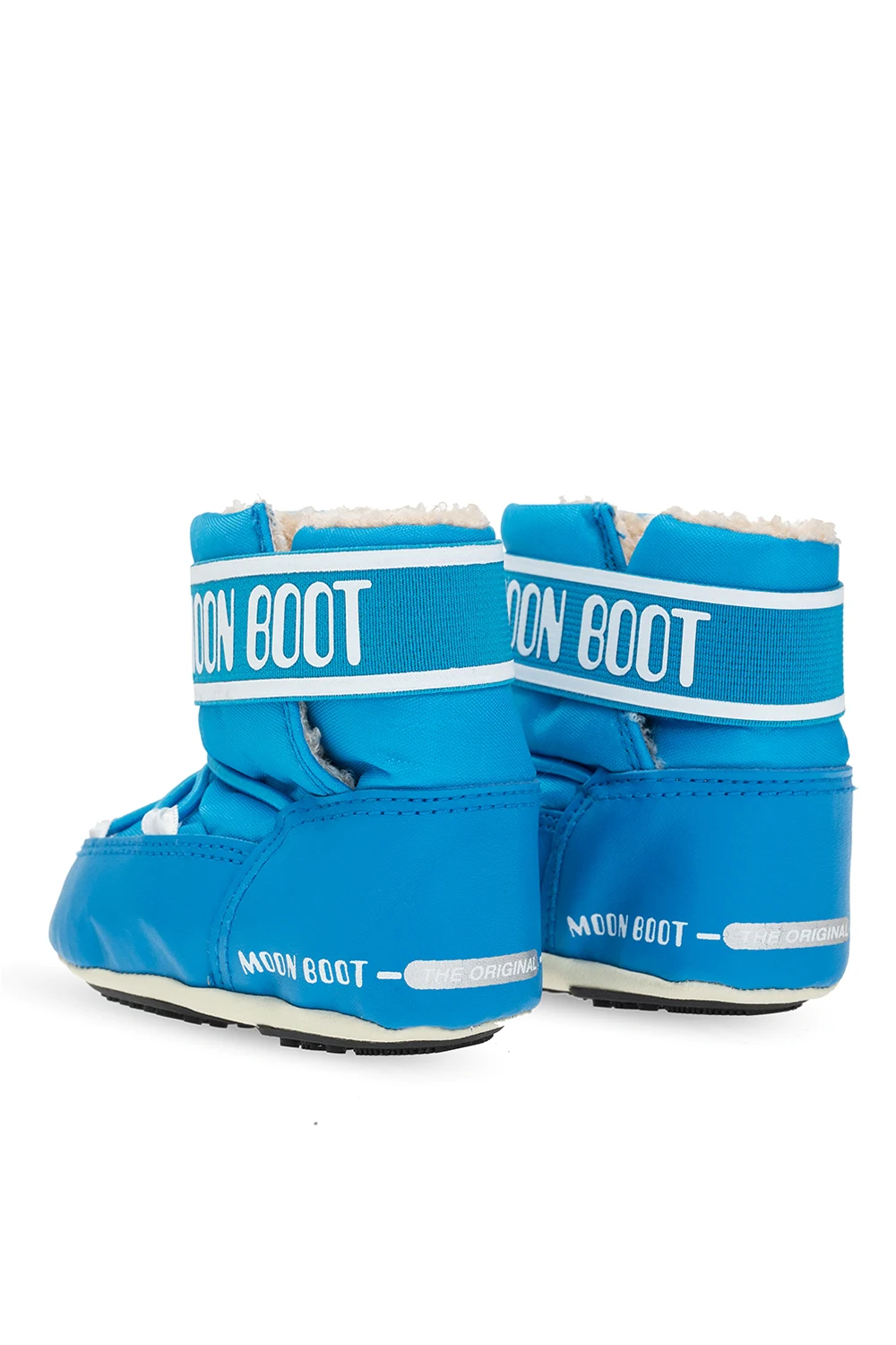 Niebieskie śniegowce, model ‘Crib 2’ Moon Boot Kids. U góry guma z nadrukowanym logo w kolorze białym. Dekoracyjne sznurowanie. Kremowo-czarna, gumowa podeszwa. Śniegowce inspirowane specyficznym kształtem i technologią butów dla astronautów, zaprojektowane w 1969 roku, kiedy pierwszy człowiek stanął na Księżycu.
