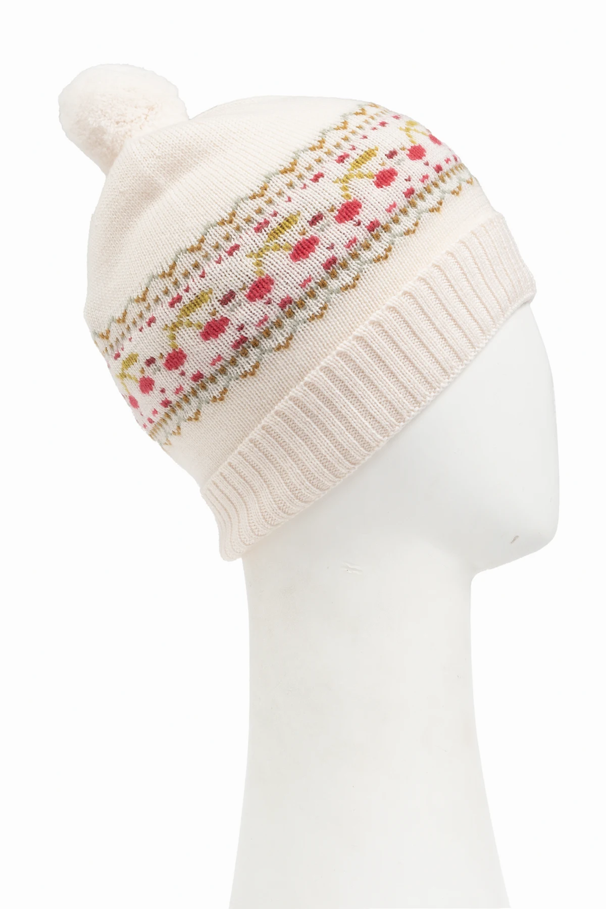 Czapka charakteryzuje się klasyczną, zaokrągloną formą z uroczym pomponem na szczycie, wykonanym z tego samego materiału. Ozdobny, kolorowy wzór w centralnej części, łączący motywy geometryczne i kwiatowe, dominuje w odcieniach różu, żółtego i zielonego, tworząc harmonijną i przyciągającą wzrok kompozycję. Dominujący kolor jasny róż nadaje czapce delikatnego i przyjemnego wyglądu, idealnego dla dzieci.