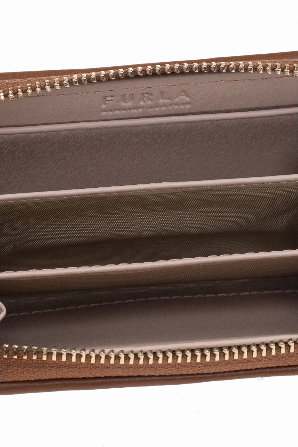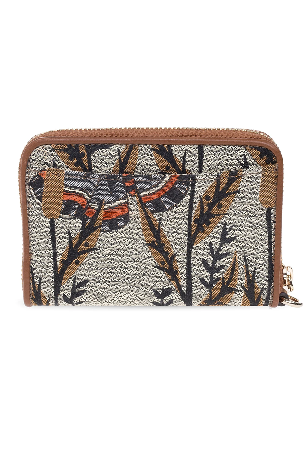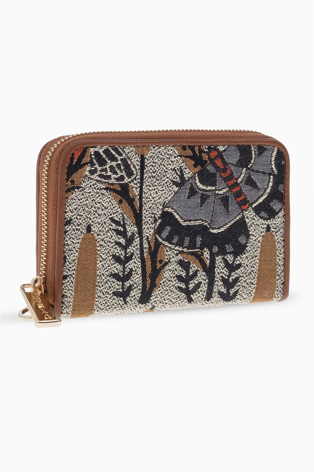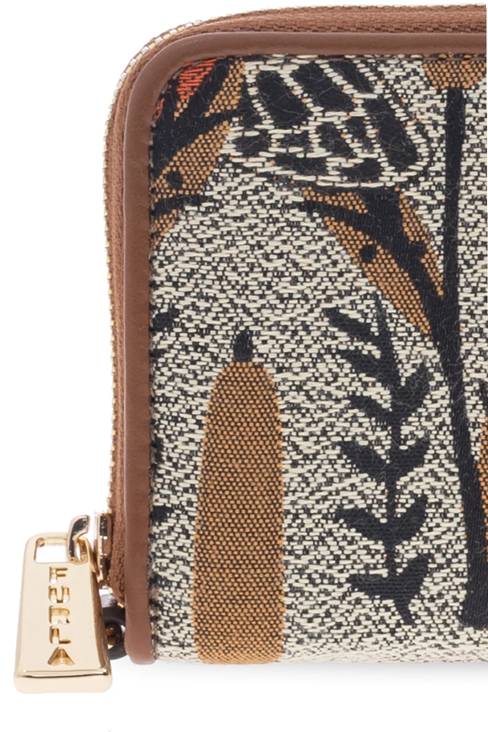Beżowo-brązowy portfel, model ‘Opportunity’ Furla. Wykonany z materiału ozdobionego żakardowym wzorem z motywem roślinnym. Zamykany na zamek. Wewnątrz trzy przegrody oraz dwie wsuwane kieszenie. Metalowe wykończenie w kolorze złotym.