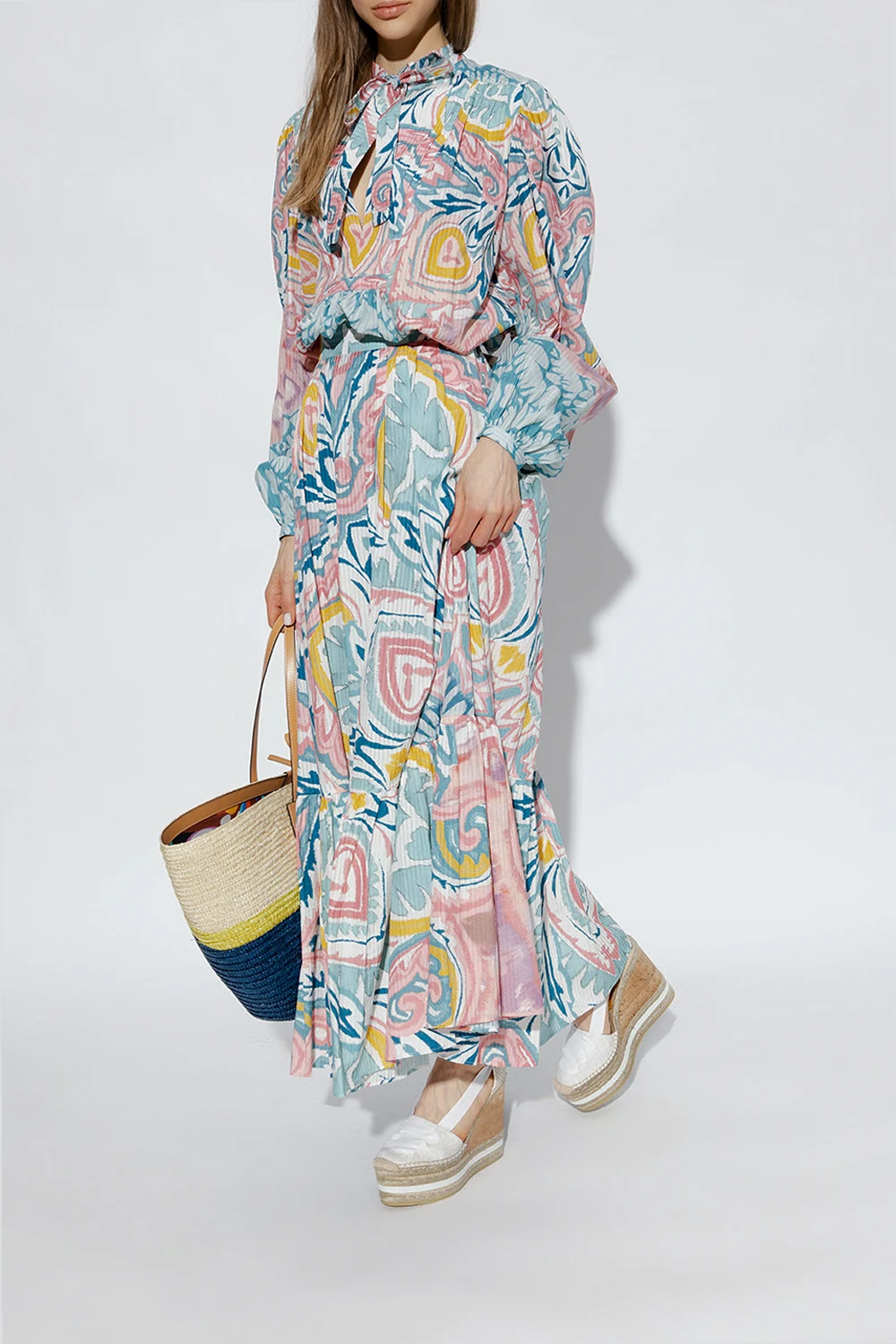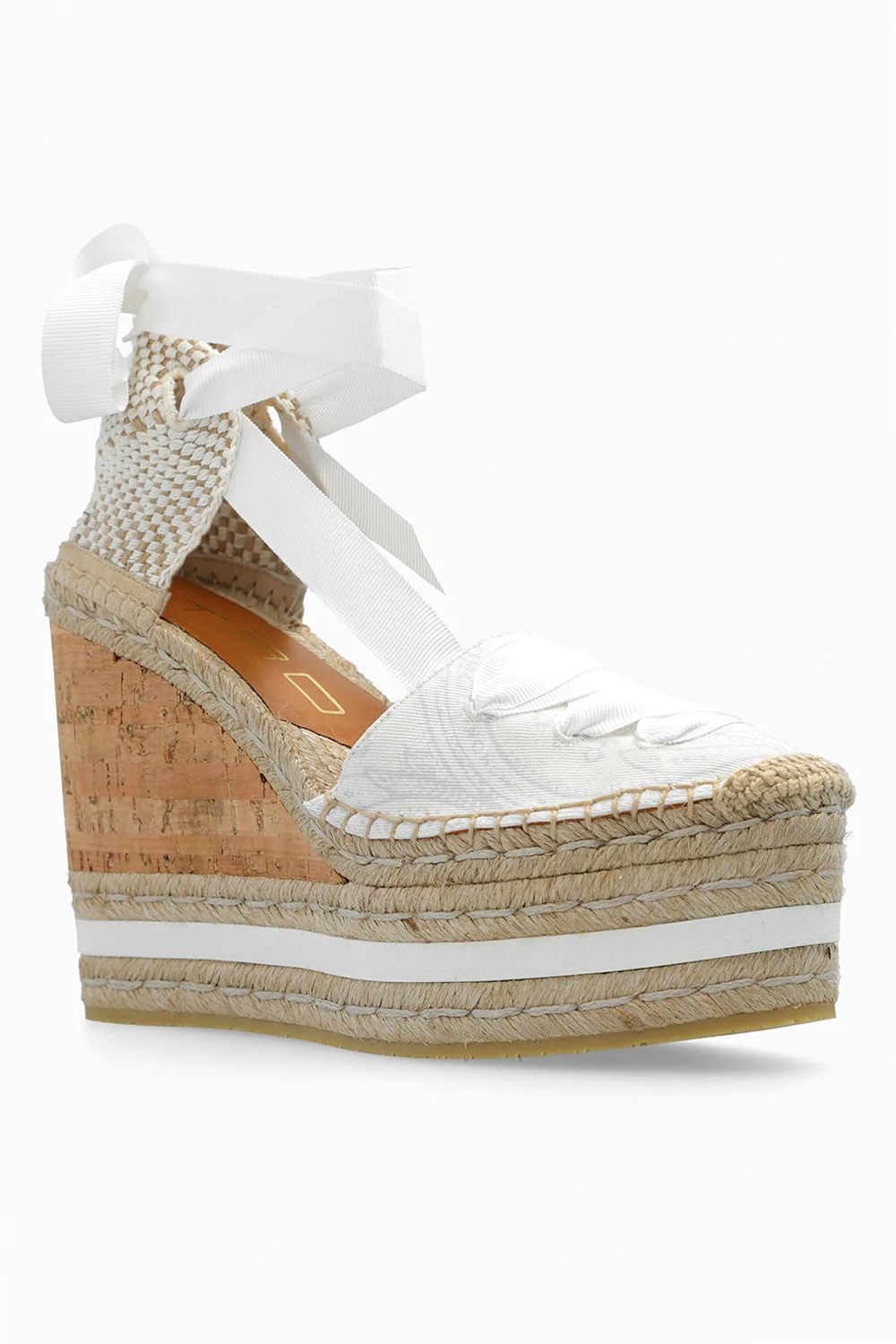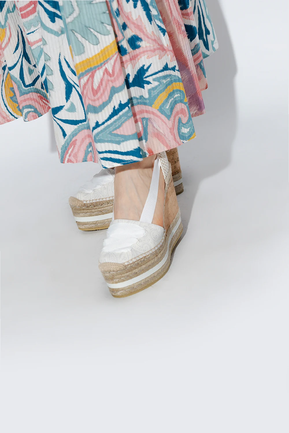 Kremowo-beżowe buty na koturnie Etro. Wykonane z płótna ozdobionego wzorem z motywem ‘paisley’. Wiązane wokół kostki rypsowym paskiem. Podeszwa wykonana z juty i korka wykończona beżową gumą.
