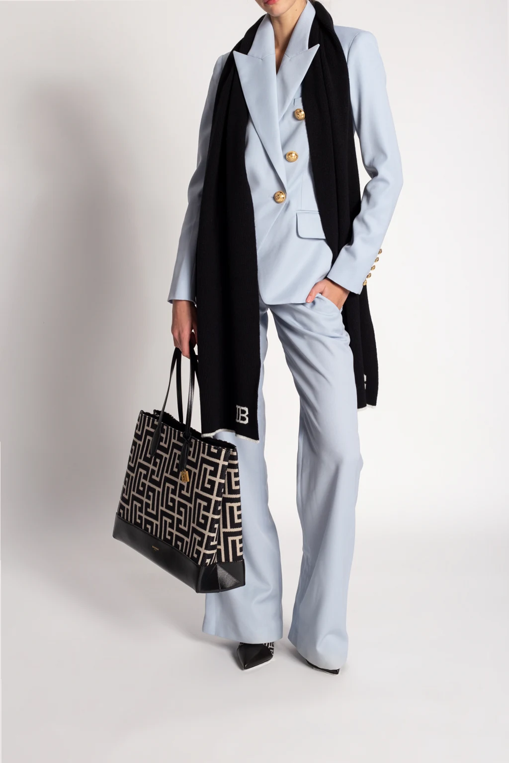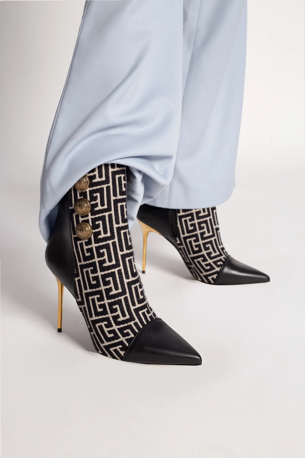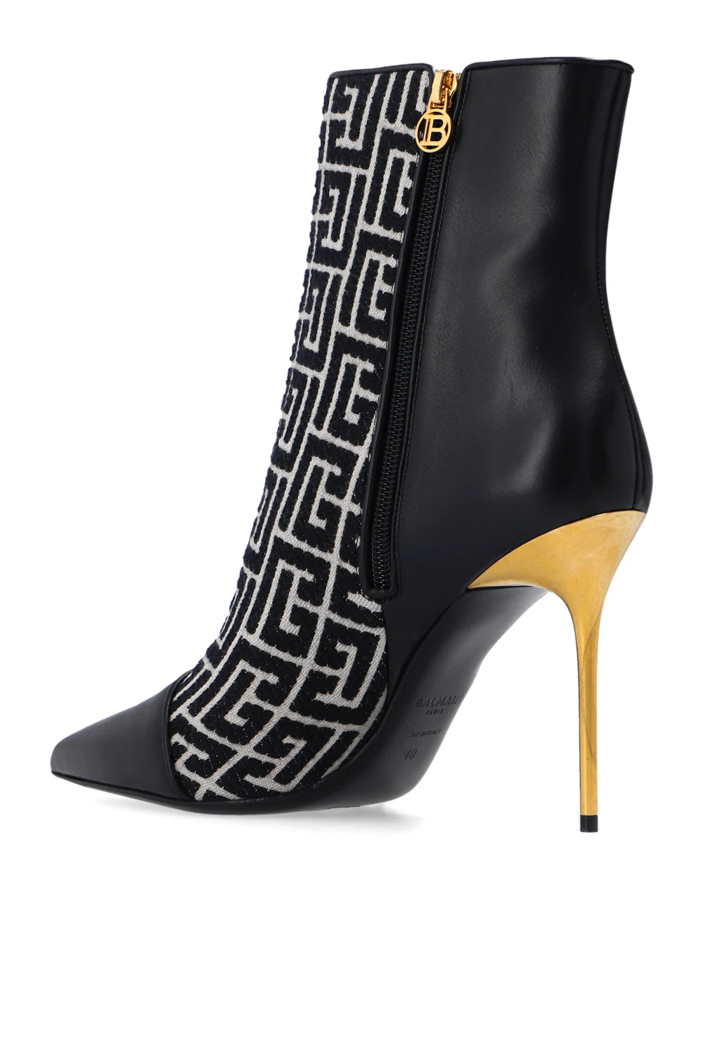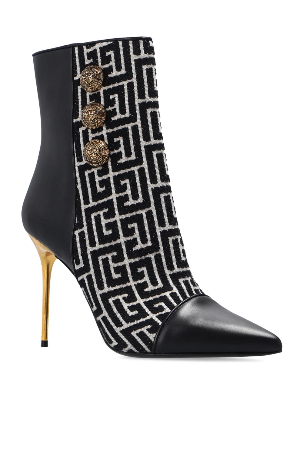 Czarno-kremowe botki Balmain. Wykonane ze skóry i materiału. Z boku zapinane na zamek. Ozdobione wzorem z monogramem ‘B’. Nosek w szpic. Czarna, skórzana podeszwa.