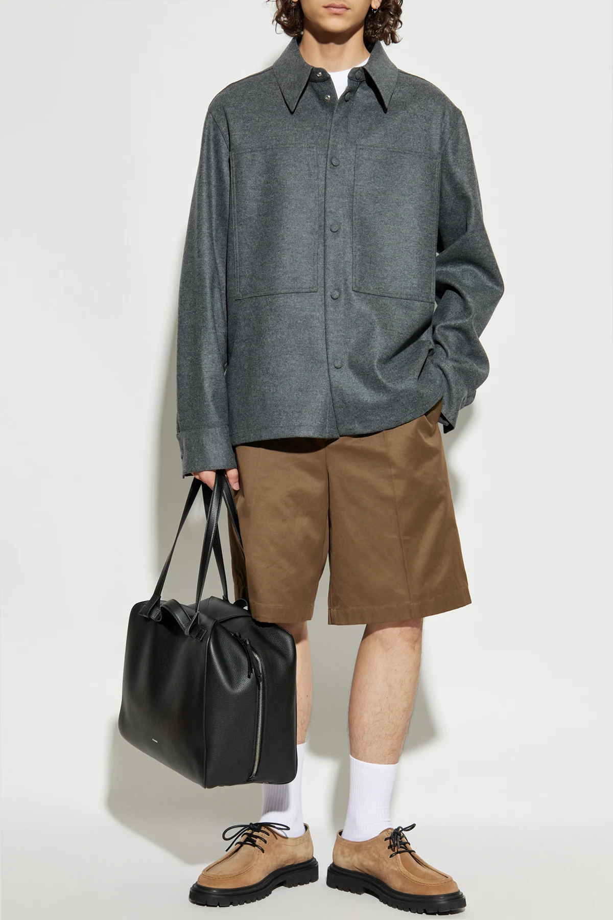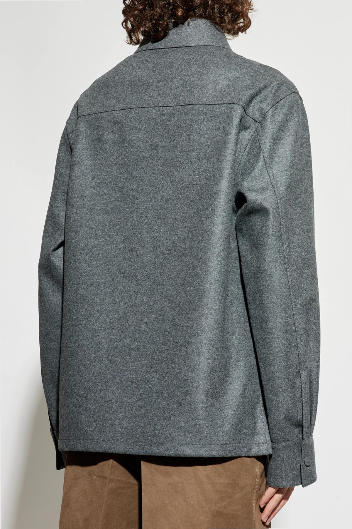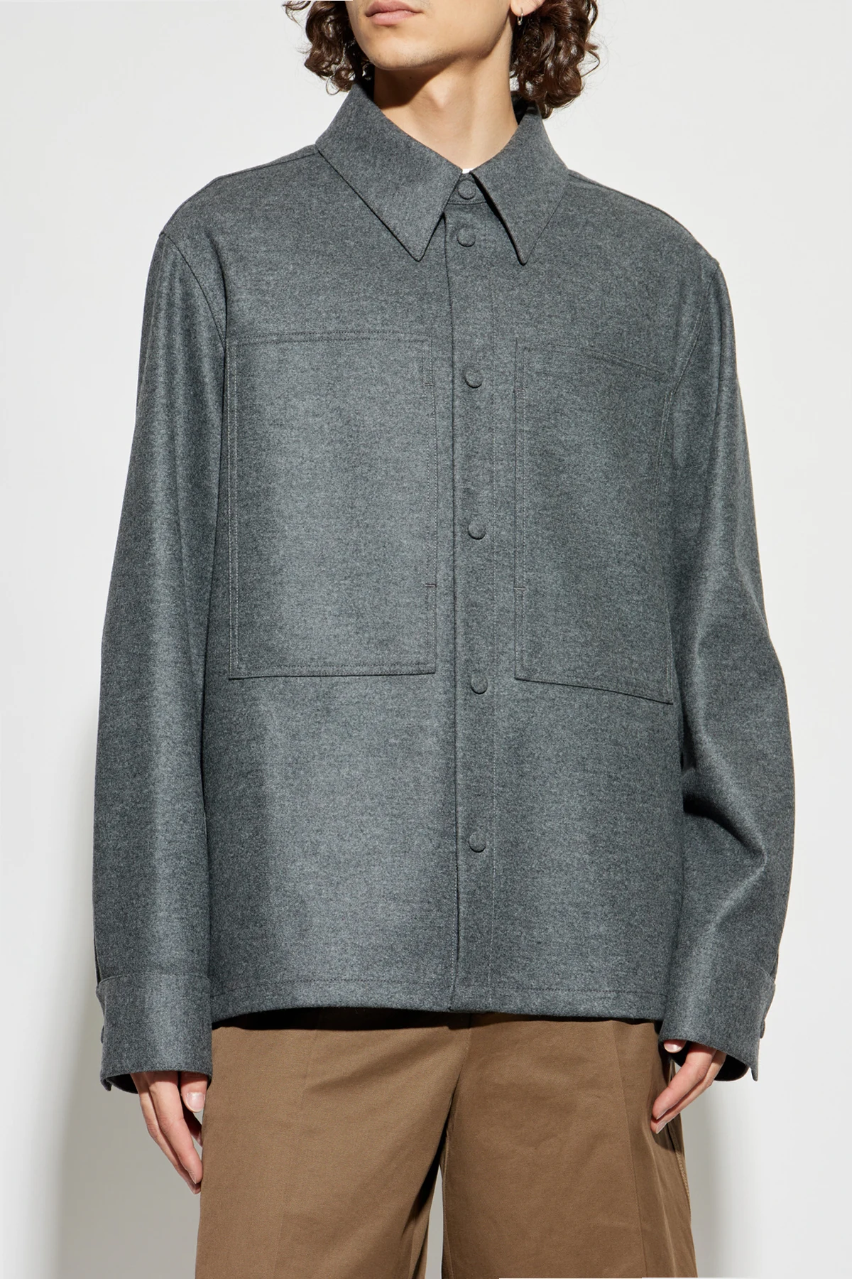 Starannie wyselekcjonowana, wysokogatunkowa wełna prezentuje się szlachetnie i miękko; jej matowa faktura nadaje subtelnej głębi. Dwie przestronne, naszyte kieszenie na piersi stanowią wyraźny akcent funkcjonalny i designerski, a guziki obleczone tym samym materiałem wprowadzają spójność oraz wyrafinowany detal. Koszula pozbawiona jest nadruków i widocznych oznaczeń, urzekając czystością formy.