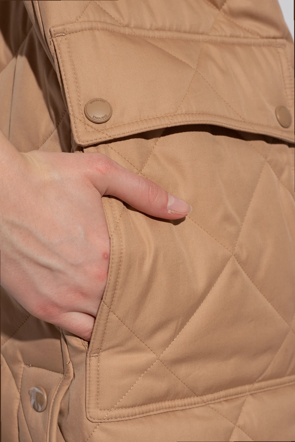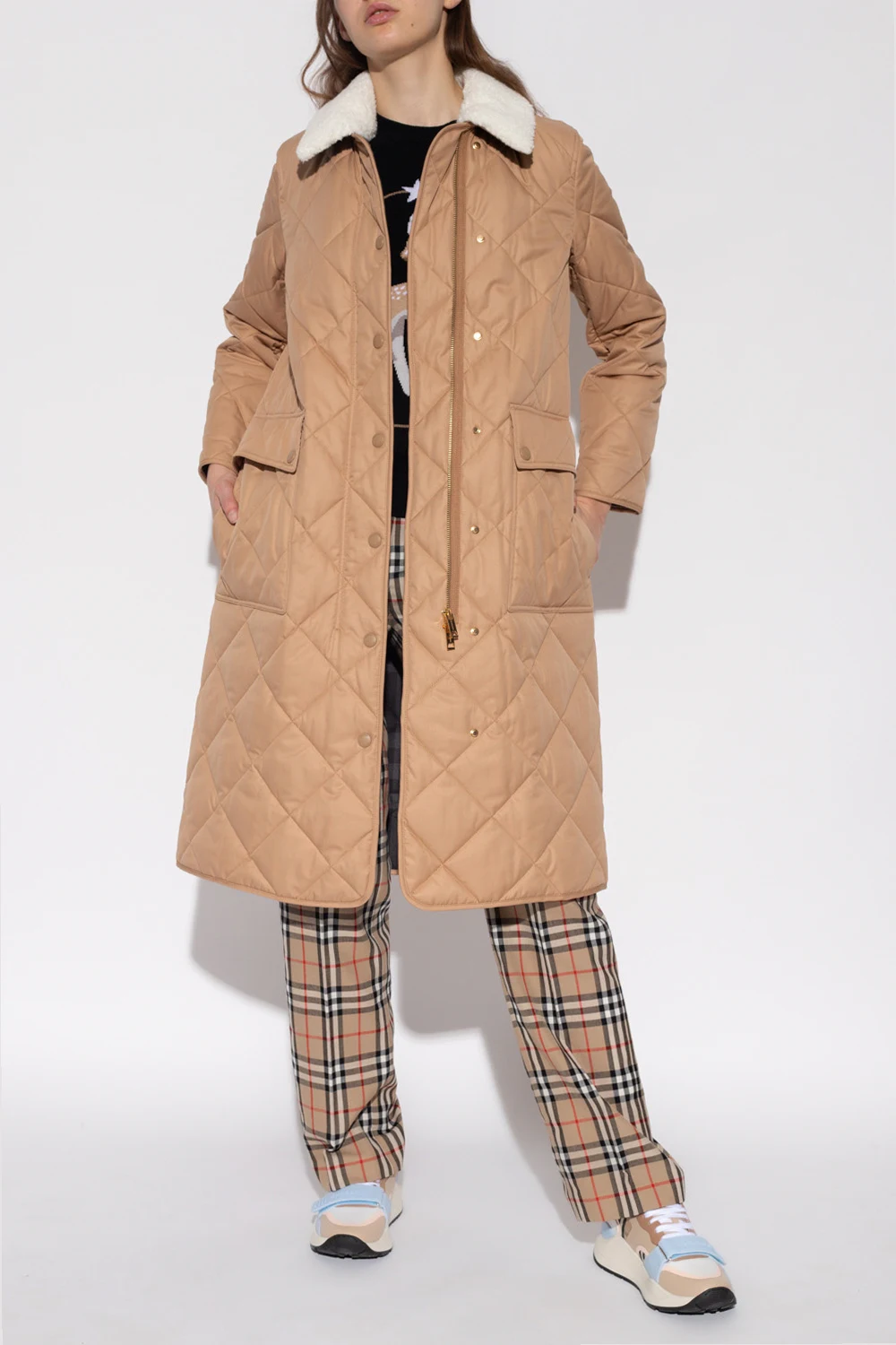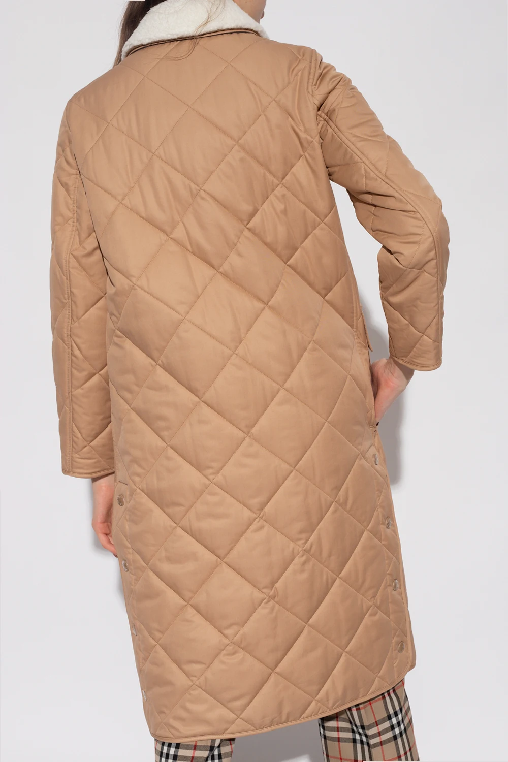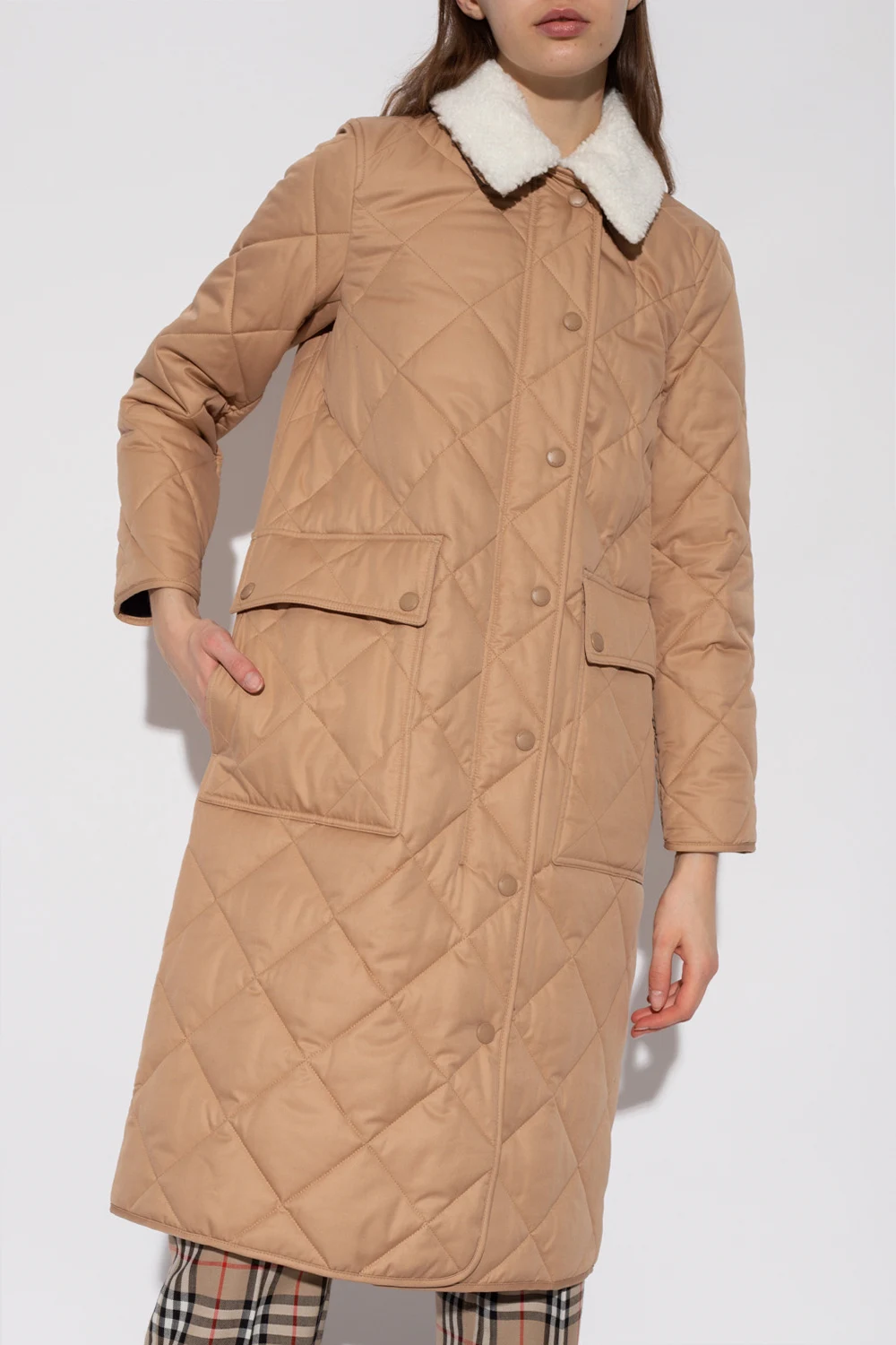 Beżowy, bawełniany, pikowany płaszcz Burberry. Zapinany na dwubiegunowy zamek i zatrzaski. Kołnierz wykończony odpinanym sztucznym futrem w kolorze białym. Z przodu cztery kieszenie, dwie z patką zapinaną na zatrzask. Po bokach zapinany na zatrzaski. Długie rękawy. Szara warstwa wewnętrzna ze wzorem w kratę.