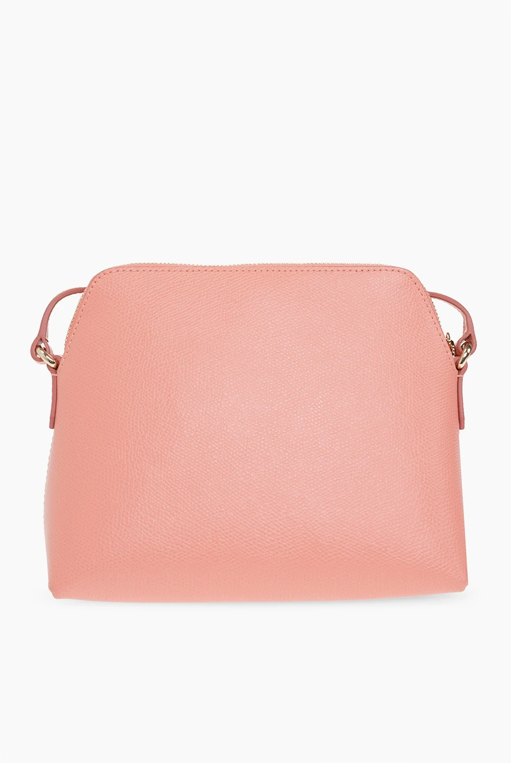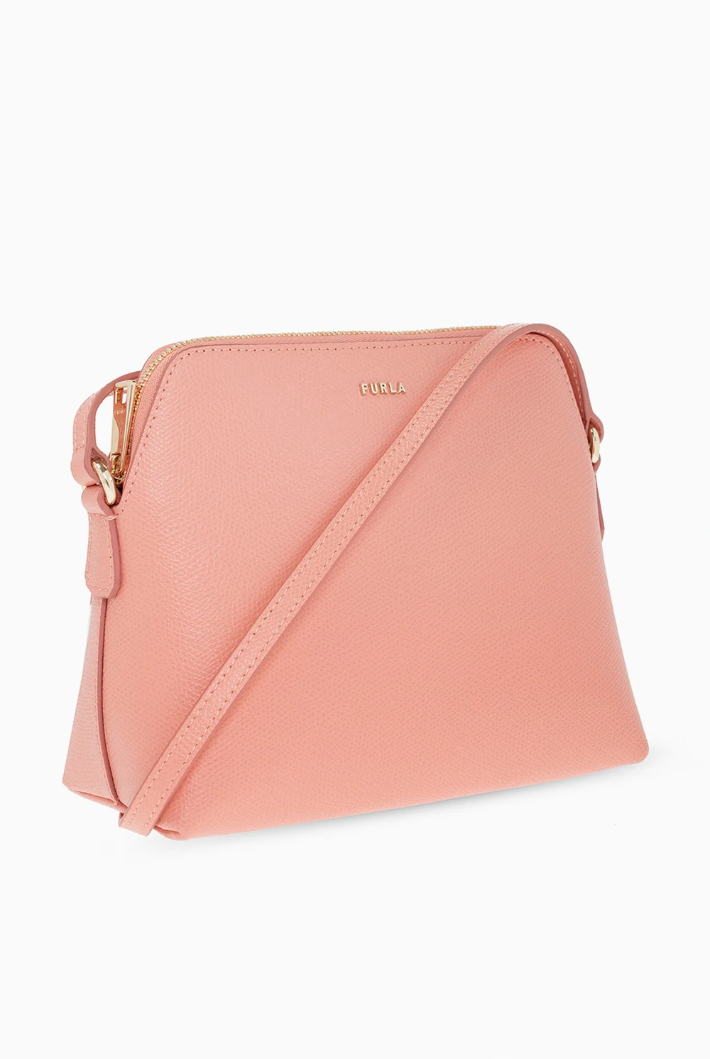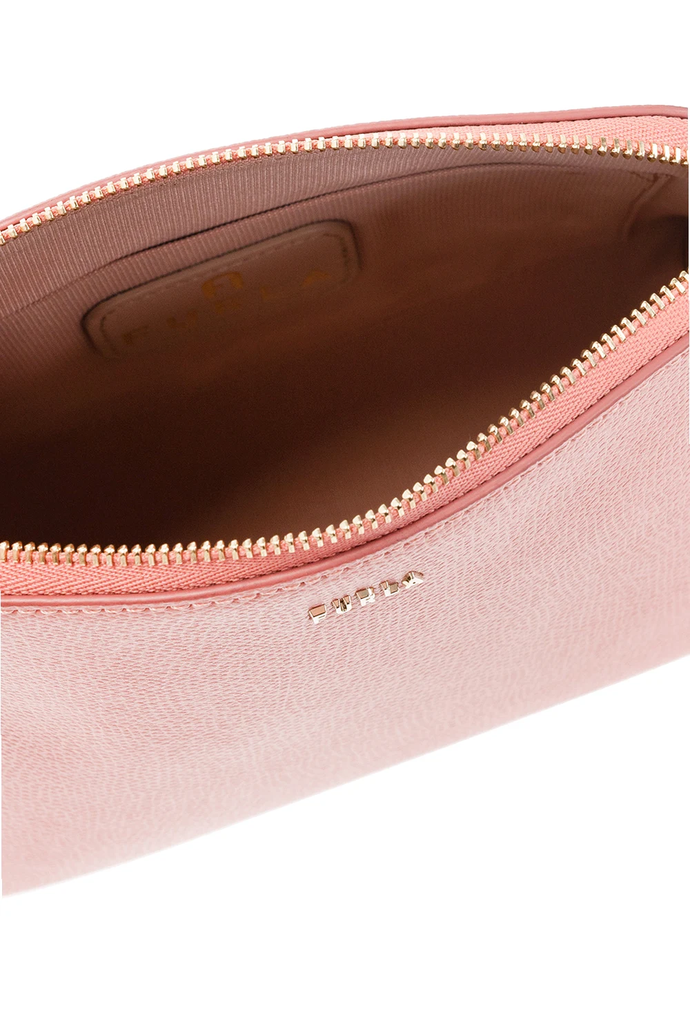 Różowa torba na ramię, model ‘Boheme’ Furla. Wykonana ze skóry. Zamykana na zamek. Z przodu metalowe logo. Regulowany pasek. Wewnątrz komora, wsuwana kieszeń i wyjmowana saszetka zamykana na zamek. Saszetka w kolorze pudroworóżowym, ozdobiona kolorowym nadrukiem z motywem kwiatowym.