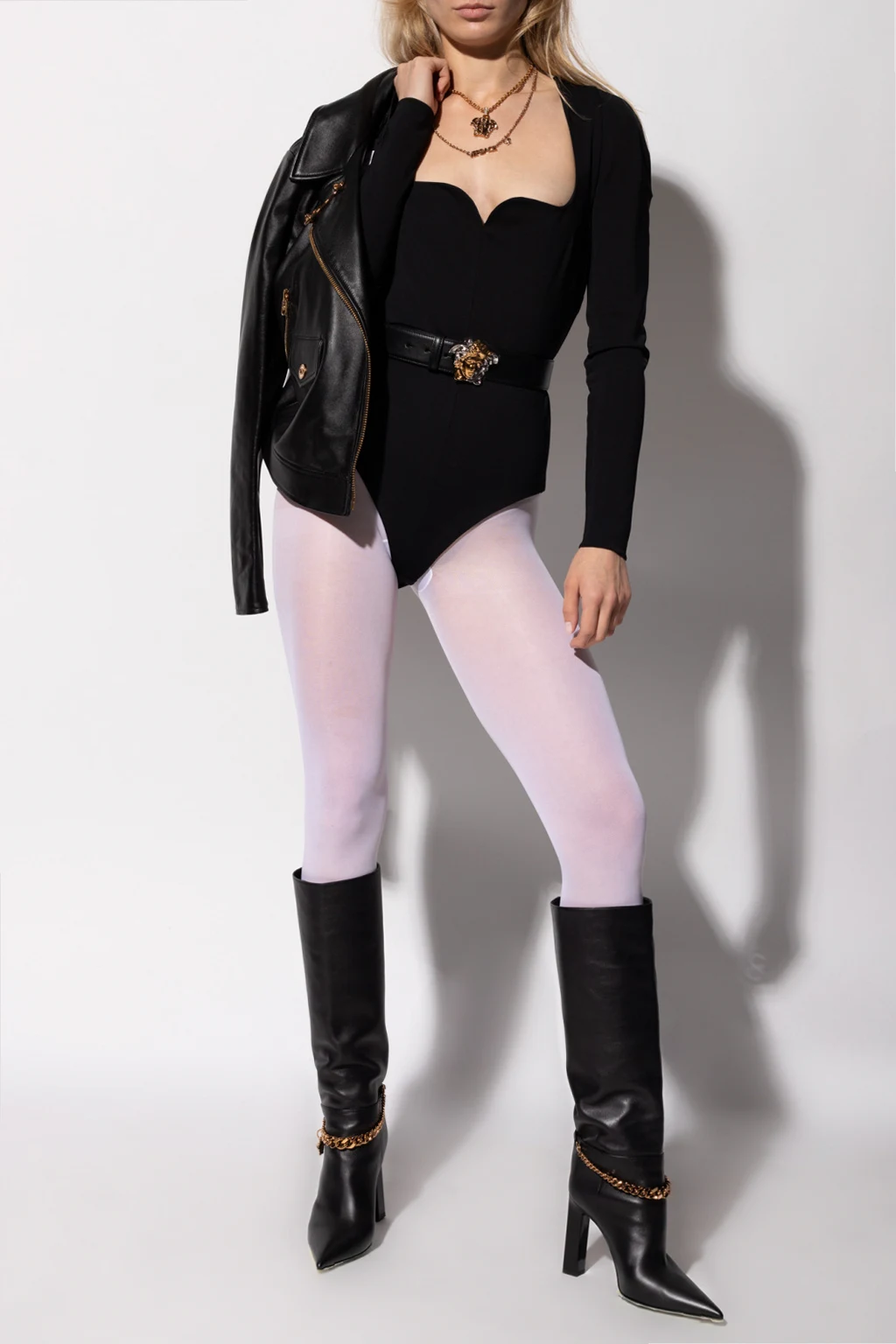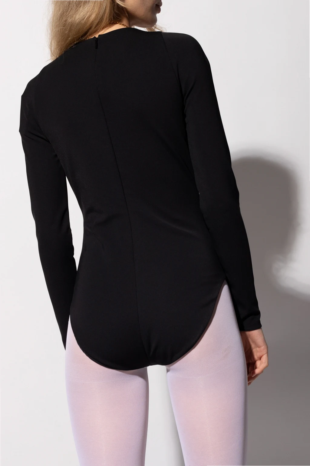 Czarne body z długim rękawem Versace. Z tyłu zapinane na zamek. Na dole zapinane na haftki.