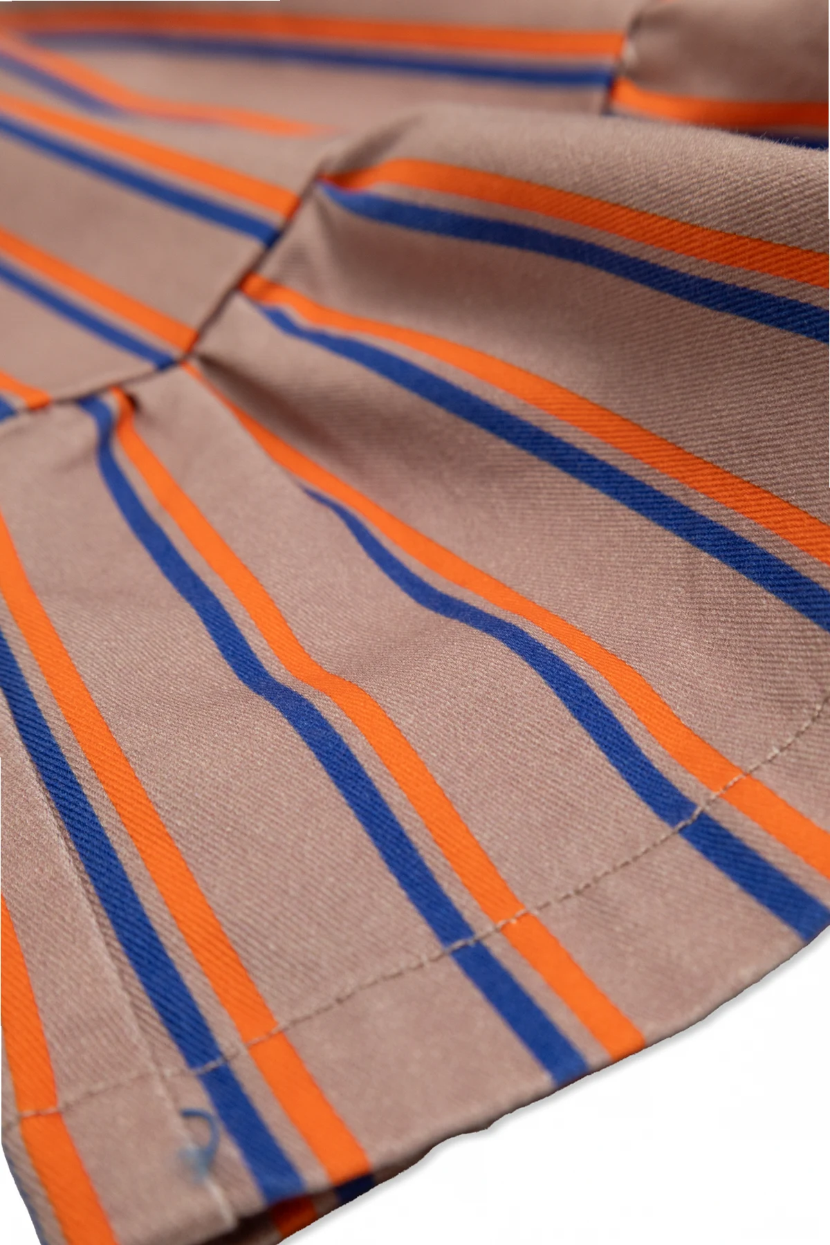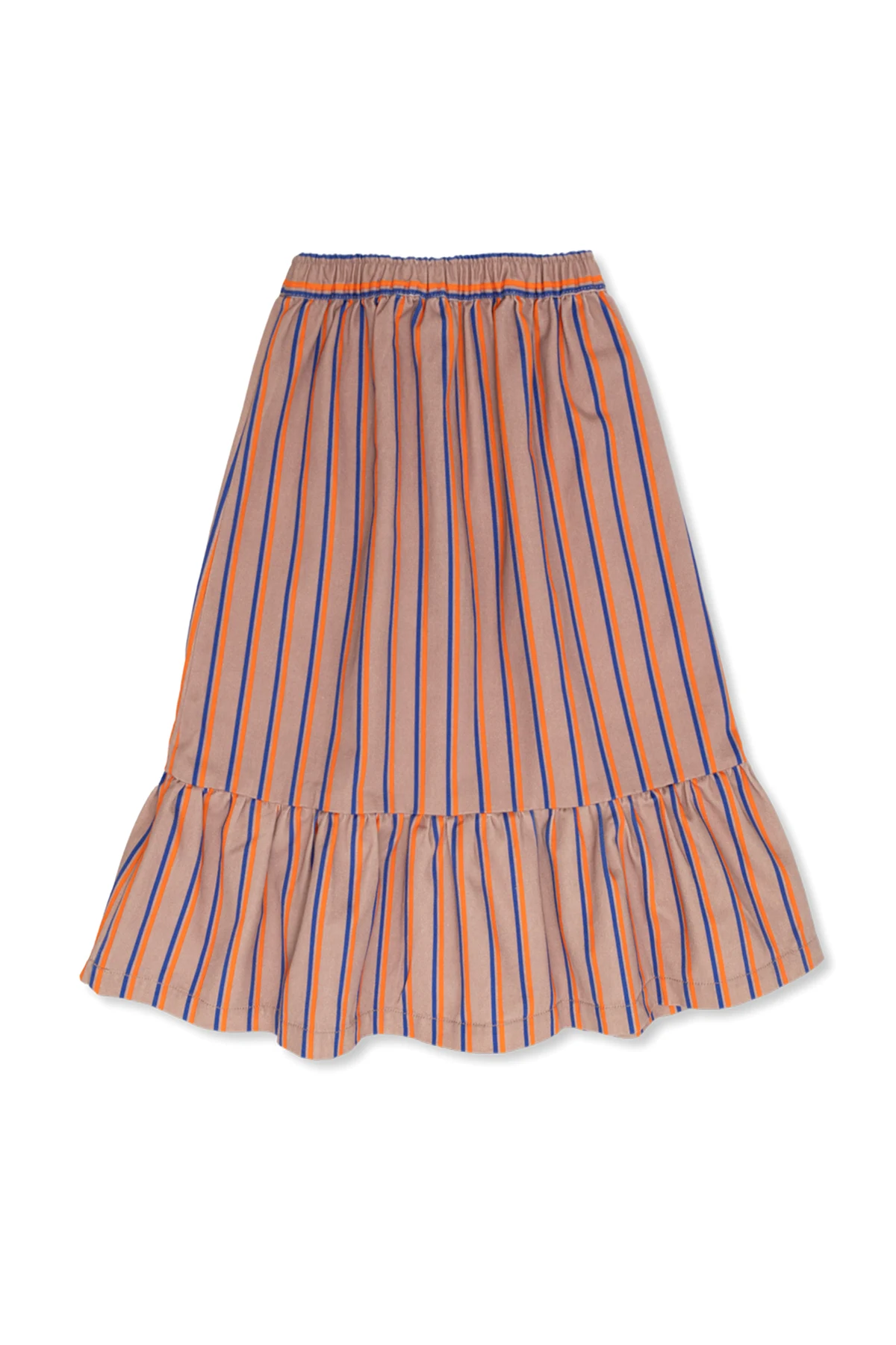 Spódnica charakteryzuje się prostym krojem z falbaną u dołu, co nadaje jej lekkości i swobodnego charakteru. Wzór w pasy w kolorach pomarańczowym, niebieskim i beżowym wyróżnia się na tle, dodając stylizacji świeżości i radości.