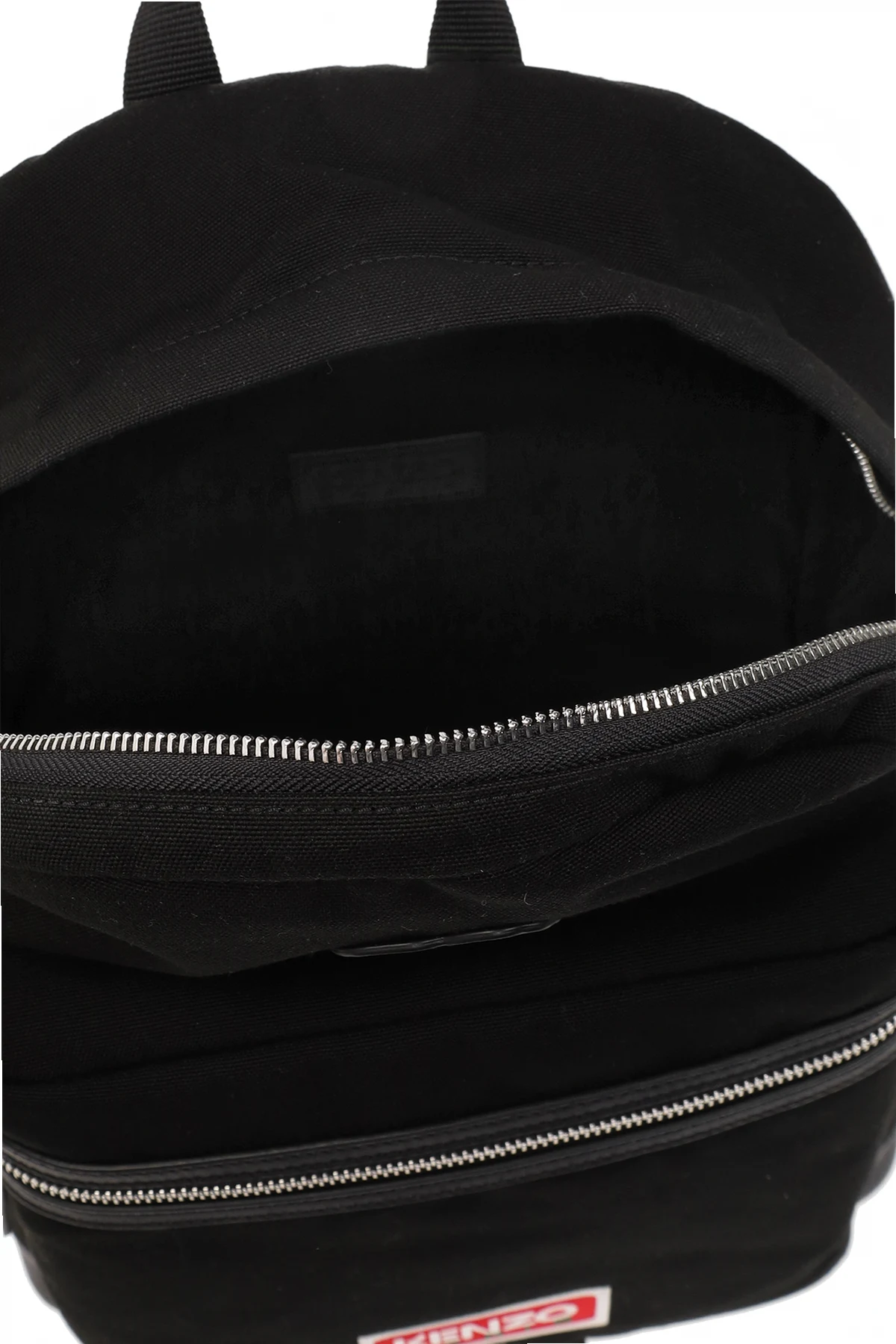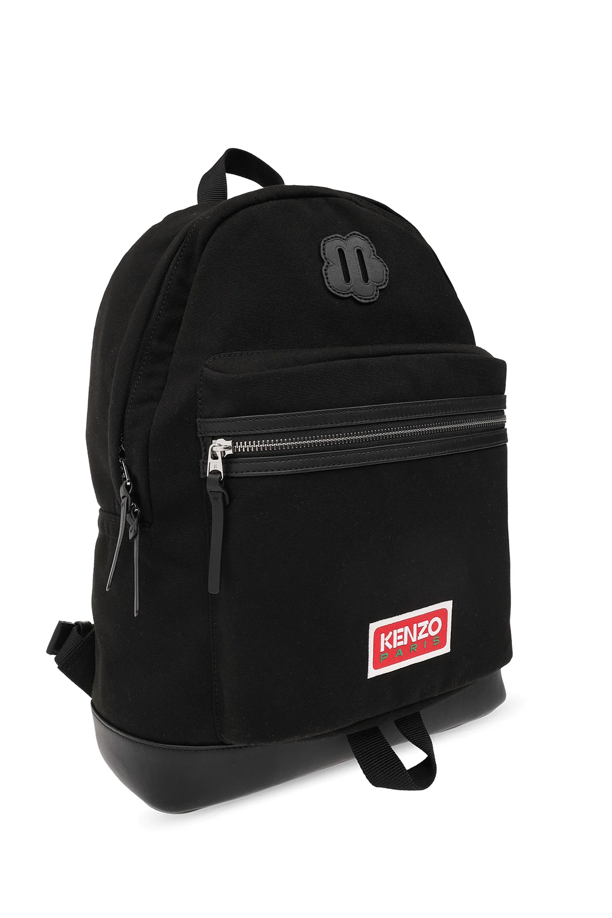 Czarny plecak Kenzo. Wykonany z materiału. Zamykany na dwubiegunowy zamek. Ozdobiony kolorową naszywką z logo i naszywką z charakterystycznym motywem kwiatowym. Z przodu kieszeń zamykana na zamek. Półokrągła rączka. Regulowane szelki. Wewnątrz komora i wsuwana kieszeń. Metalowe elementy w kolorze srebrnym.