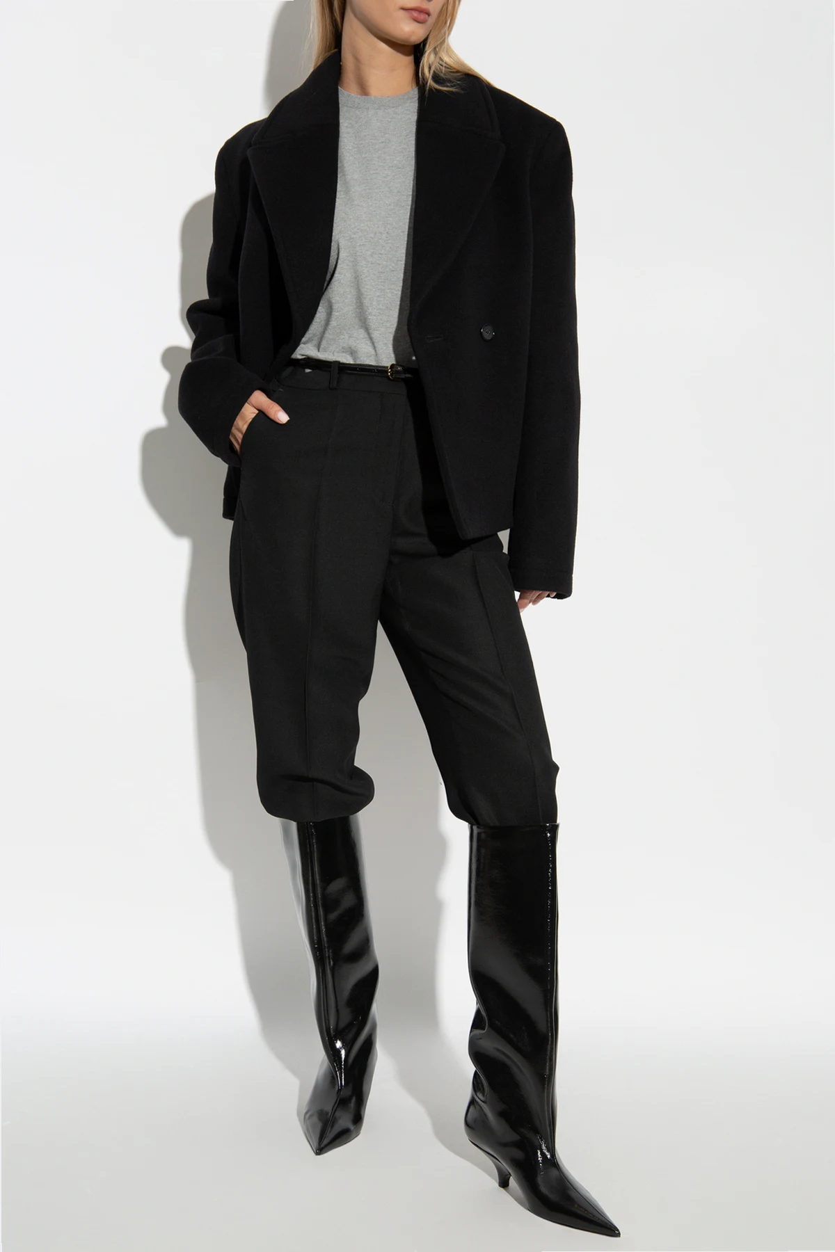 Rękawy są proste, bez mankietów, co dodatkowo potęguje jej minimalistyczny design. Na jednym ze zdjęć kurtka zaprezentowana jest w stylizacji z szarym topem, czarnymi spodniami oraz czarnymi wysokimi butami, co ukazuje jej wszechstronność – od eleganckiego po casualowy wygląd.