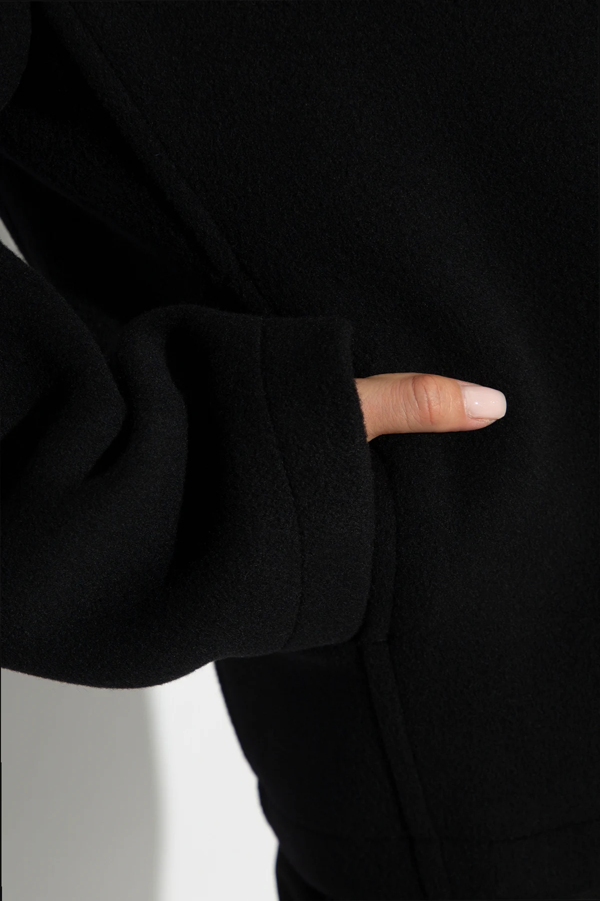 Kurtka charakteryzuje się prostym, klasycznym krojem , który sięga do bioder. Szeroki kołnierz dodaje jej wyrafinowanego sznytu, a niewidoczne guziki nadają minimalistyczny wygląd. Jednokolorowy czarny materiał sprawia, że kurtka jest uniwersalna i łatwa do dopasowania do różnych stylizacji.