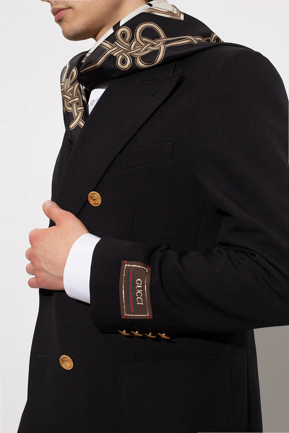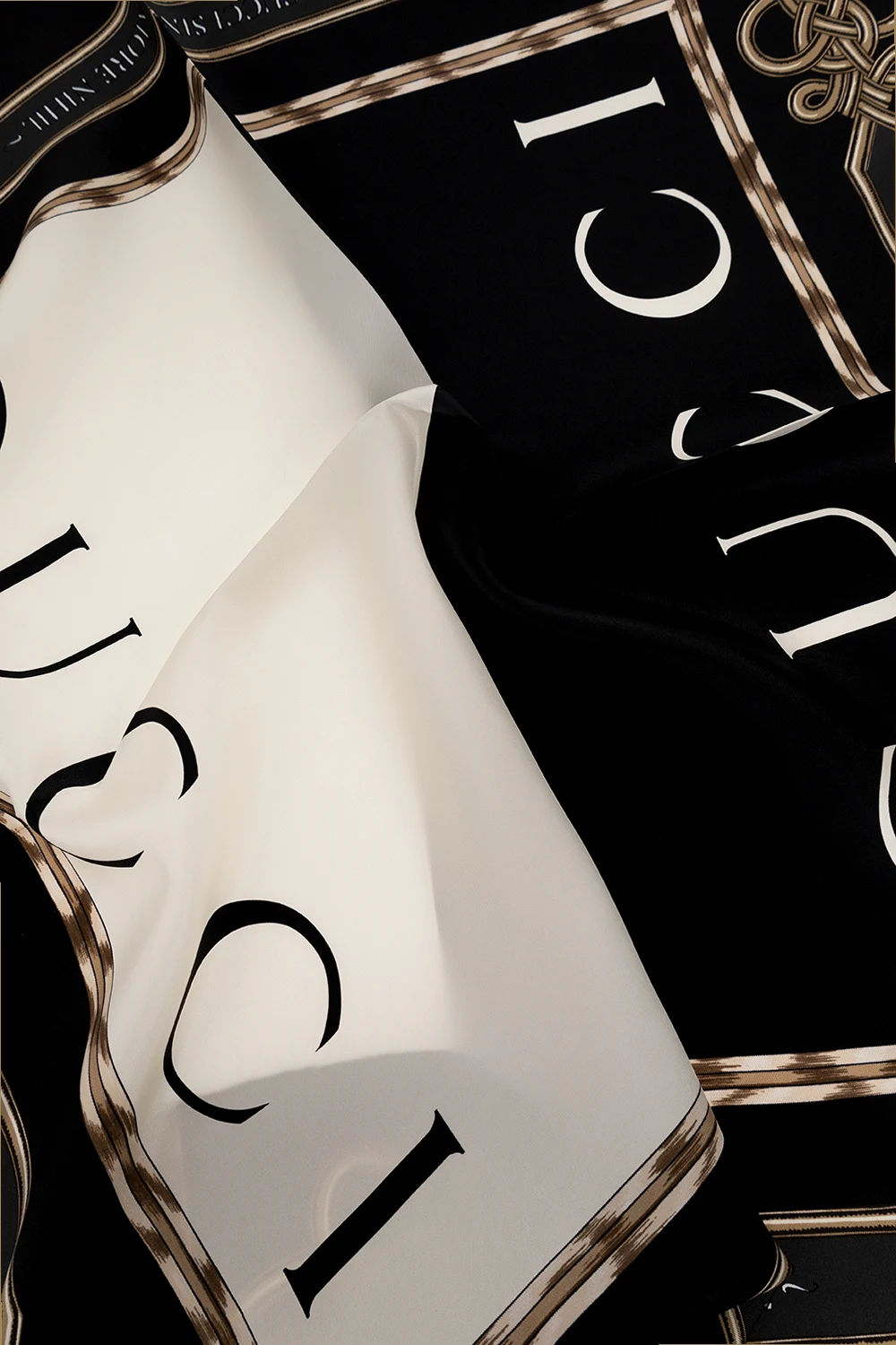 Czarna, jedwabna chusta Gucci. Ozdobiona biało-beżowo-brązowym nadrukiem i napisem ‘Gucci Sine Amore Nihil’.