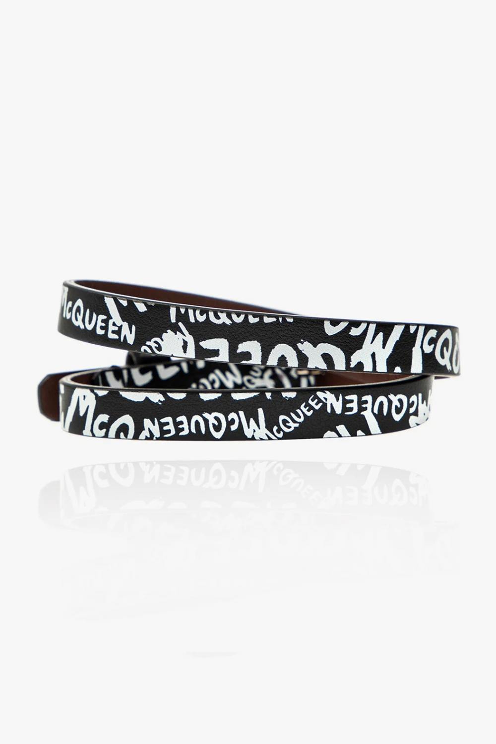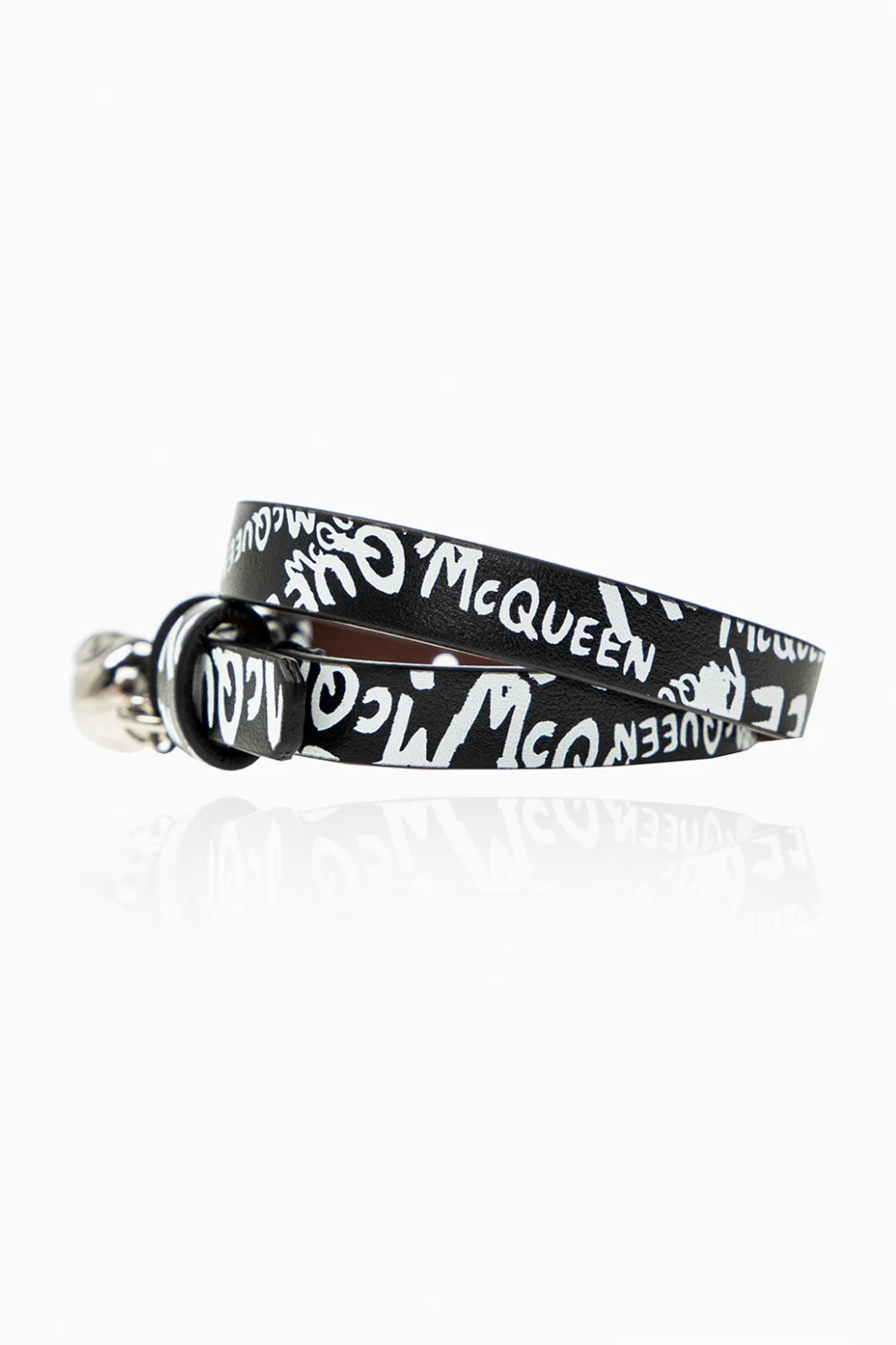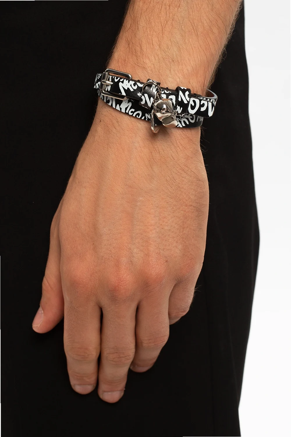 Czarna, podwójna bransoleta Alexander McQueen. Wykonana ze skóry cielęcej. Nadruk z logo w kolorze białym. Zawieszka z logo oraz w kształcie charakterystycznego dla marki motywu czaszki. Klamra w kolorze srebrnym.