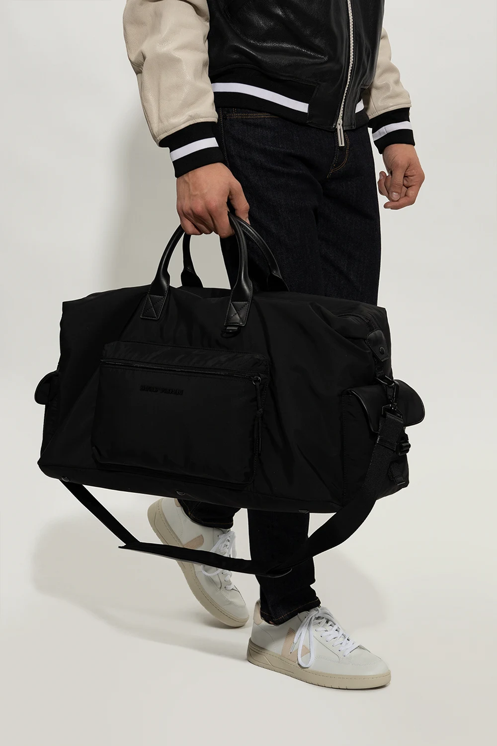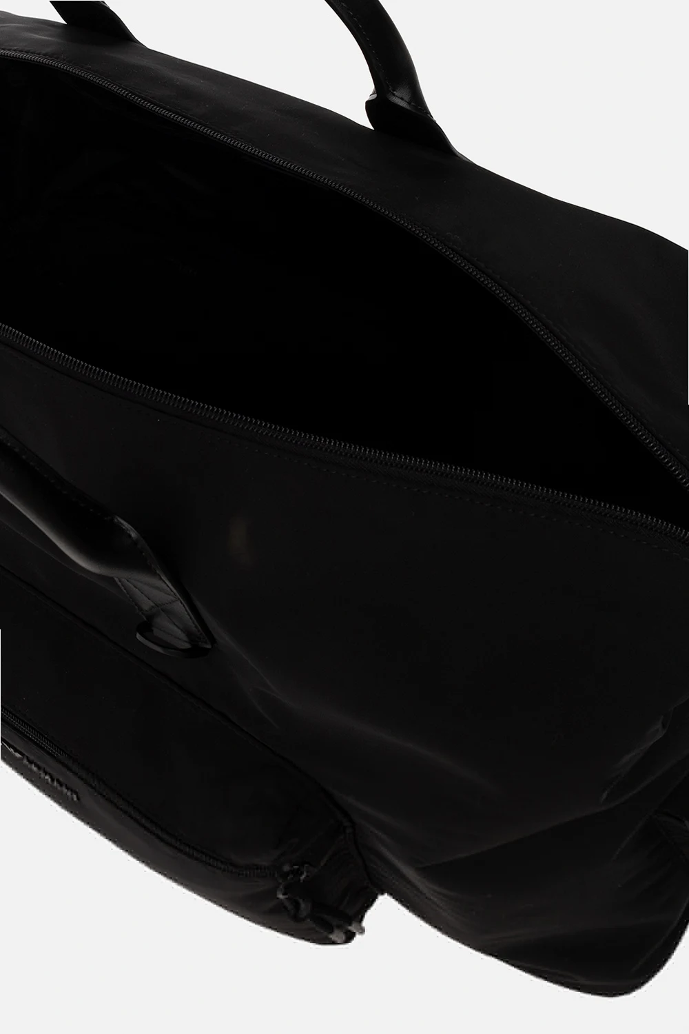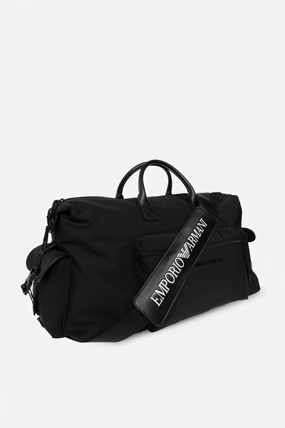 Czarna torba podręczna Emporio Armani. Wykonana z materiału. Zamykana na dwubiegunowy zamek. Z przodu ozdobiona wypukłym logo. Trzy kieszenie: z przodu zamykana na zamek i po bokach kieszeń z patką zapinaną na zatrzask. Dwie półokrągłe rączki. Odpinany, regulowany pasek.