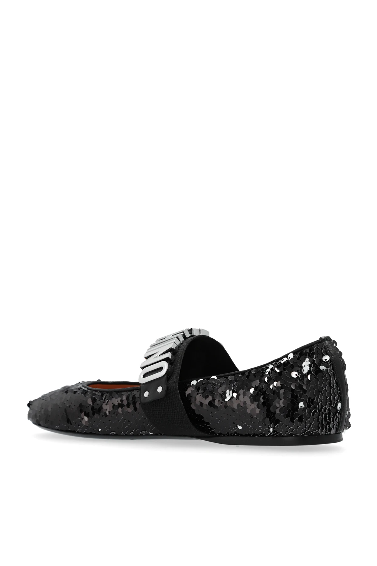 Czarno-białe baleriny Moschino. Pokryte połyskującymi cekinami. Wykończone skórą. Z przodu elastyczny pasek z metalowym logo w kolorze srebrnym. Zaokrąglony nosek. Czarna, skórzana podeszwa.