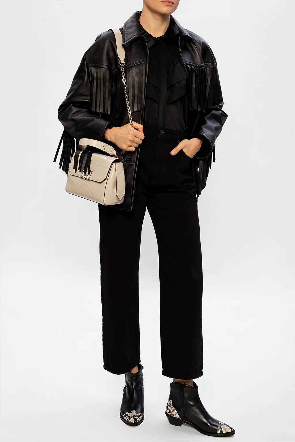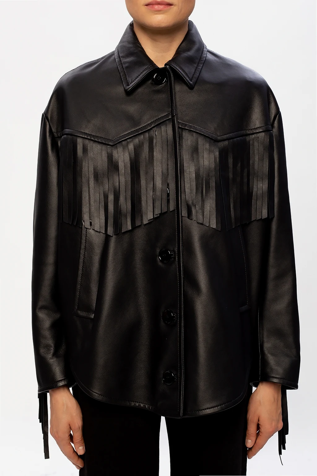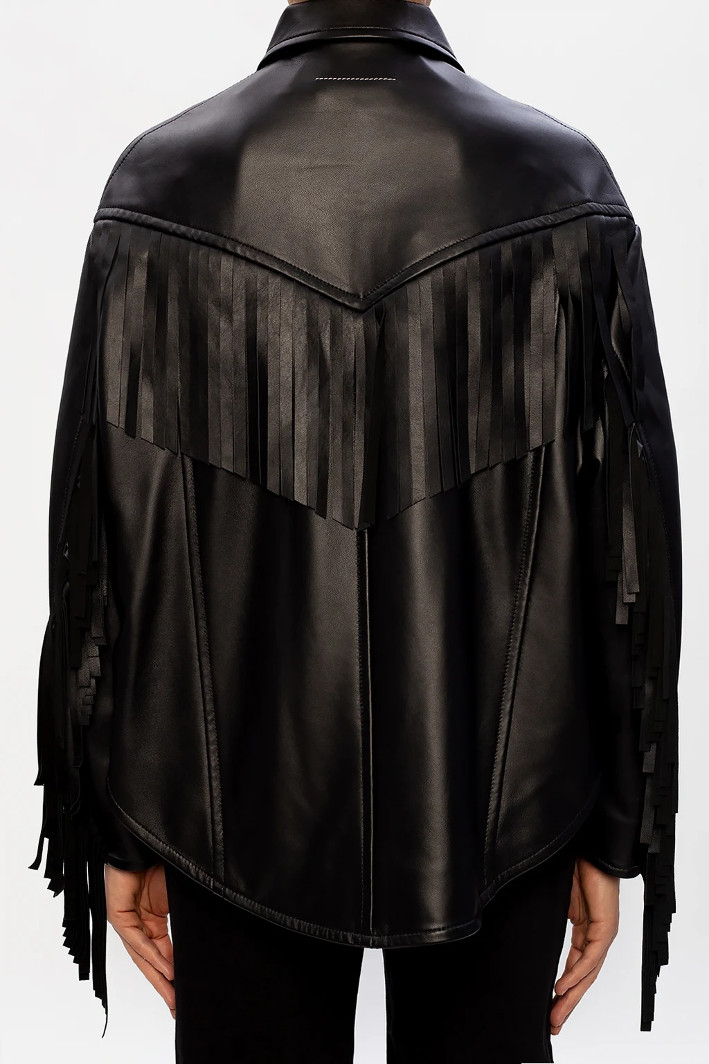 Czarna kurtka MM6 Maison Margiela. Zapinana na guziki. Z przodu dwie, wsuwane kieszenie. Ozdobiona frędzlami.