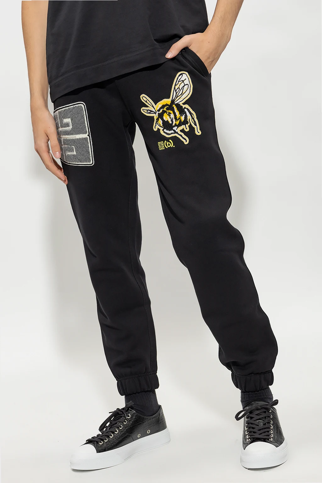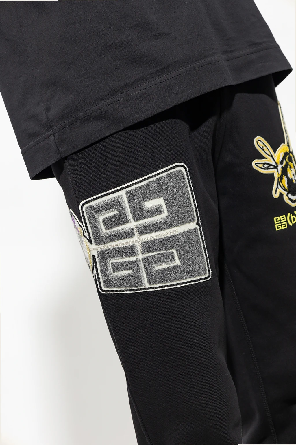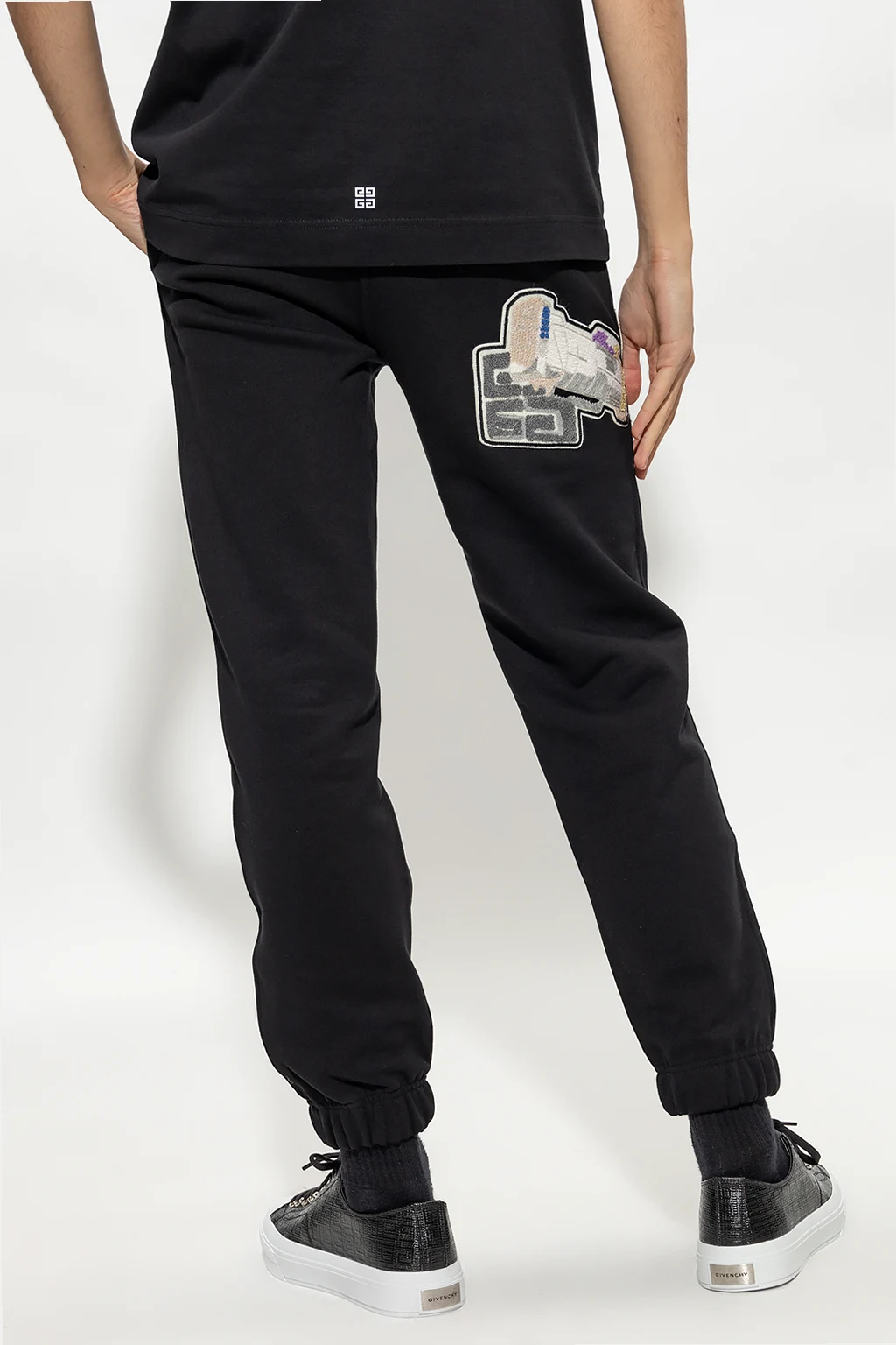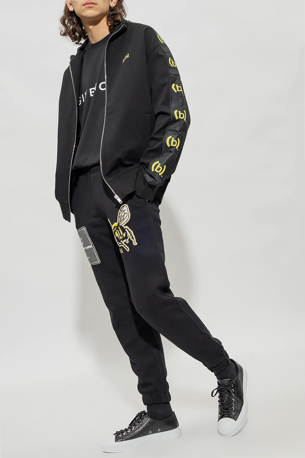 Czarne, bawełniane spodnie dresowe Givenchy. W pasie ściągane trokami. Ozdobione kolorowymi naszywkami. Trzy kieszenie: dwie z przodu i jedna z tyłu zapinana na zatrzask. Nogawki zakończone wszytą guma.