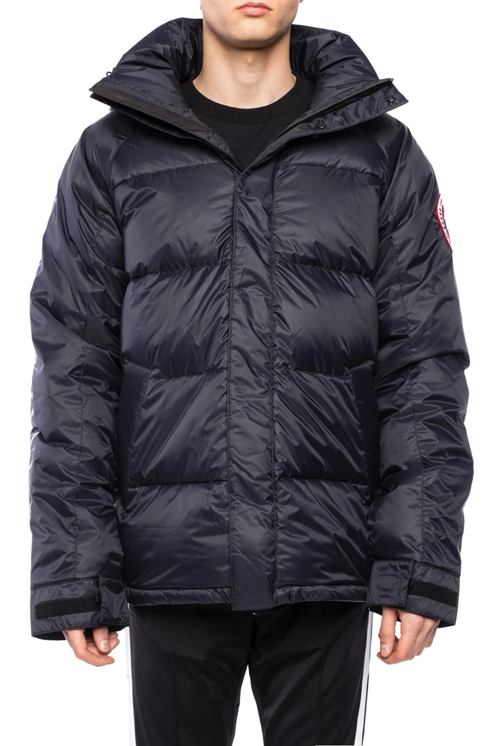 Granatowa pikowana kurtka puchowa, model 'Approach' Canada Goose. Wykonana z nieprzemakalnego materiału. Zapinana na zamek i zatrzaski. Ozdobiona czerwono-biało-niebieską naszywką oraz nadrukiem z logo w kolorze srebrnym. Z przodu dwie kieszenie zamykane na zatrzaski. Odpinany kaptur i dół ściągane trokami. Rękawy regulowane na rzep.